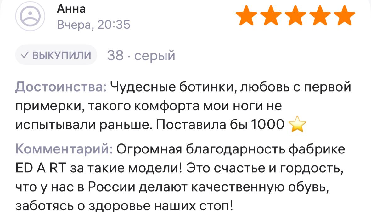 Ботинки хорошие, кажа мягкая, размеру соответствуют, но на пятке пришита заплатка из какой то пленки блесящей и когда первый раз померла она вся сморщилась и такое впечатление что сейчас лопнет. И я думаю со временем так и будет. Если бы не эта заплатка взяла бы удобные и мягкие