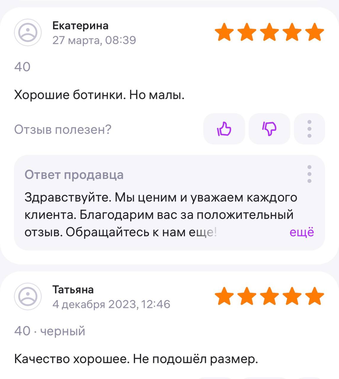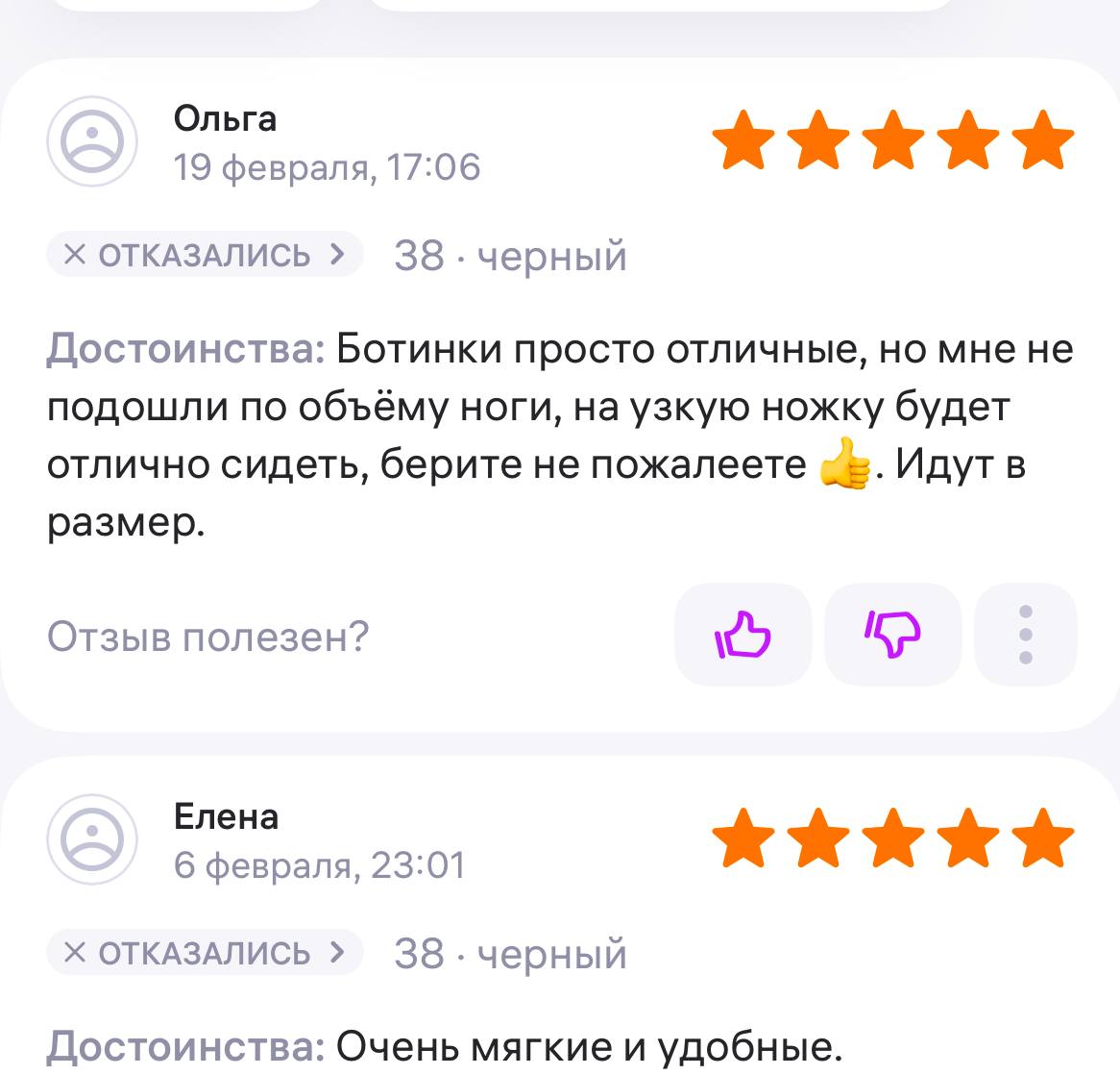 Ботинки хорошие, кажа мягкая, размеру соответствуют, но на пятке пришита заплатка из какой то пленки блесящей и когда первый раз померла она вся сморщилась и такое впечатление что сейчас лопнет. И я думаю со временем так и будет. Если бы не эта заплатка взяла бы удобные и мягкие