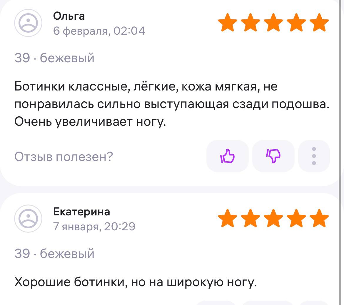 Ботинки хорошие, кажа мягкая, размеру соответствуют, но на пятке пришита заплатка из какой то пленки блесящей и когда первый раз померла она вся сморщилась и такое впечатление что сейчас лопнет. И я думаю со временем так и будет. Если бы не эта заплатка взяла бы удобные и мягкие