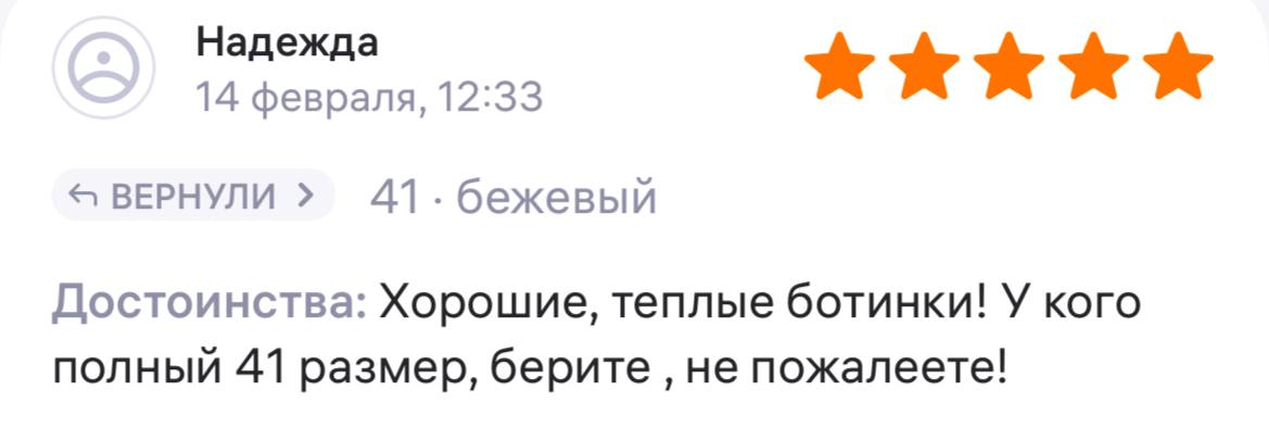 Ботинки хорошие, кажа мягкая, размеру соответствуют, но на пятке пришита заплатка из какой то пленки блесящей и когда первый раз померла она вся сморщилась и такое впечатление что сейчас лопнет. И я думаю со временем так и будет. Если бы не эта заплатка взяла бы удобные и мягкие