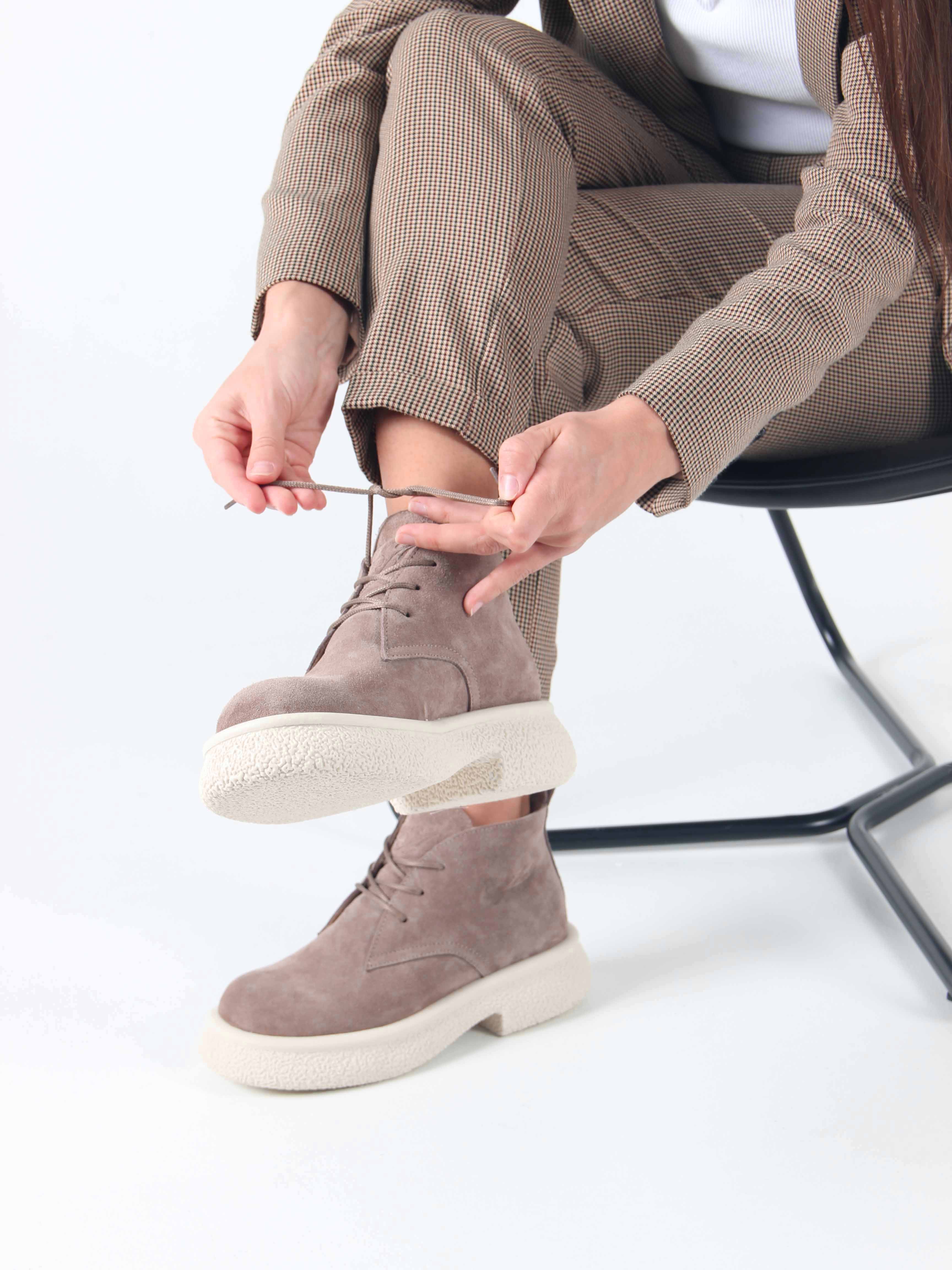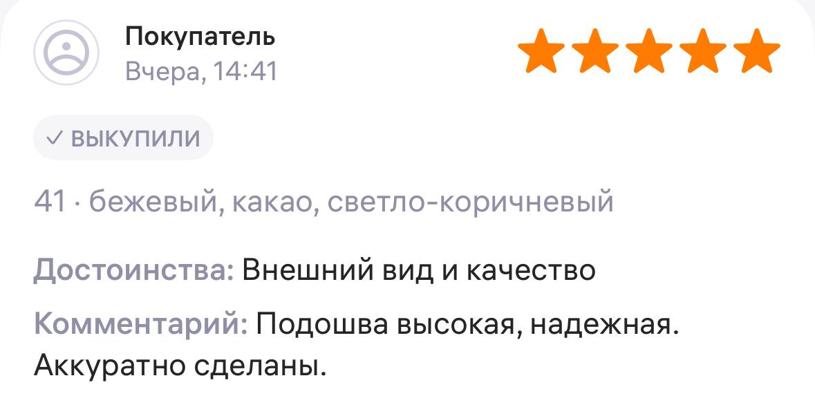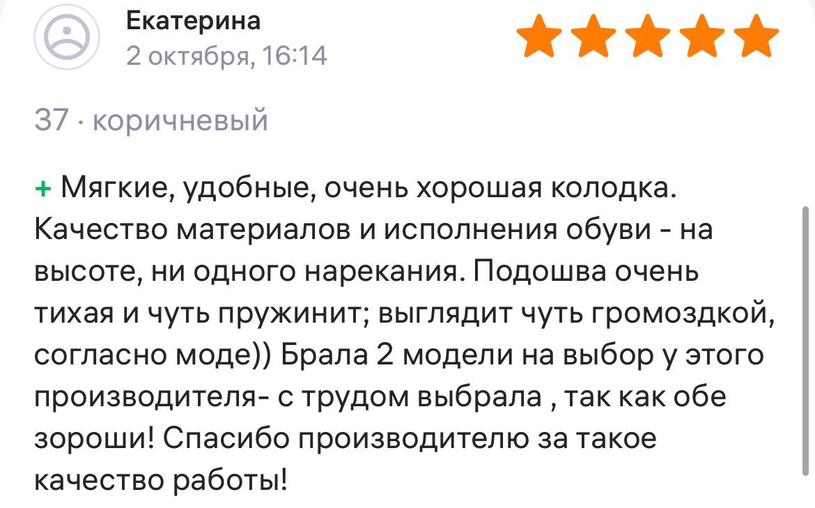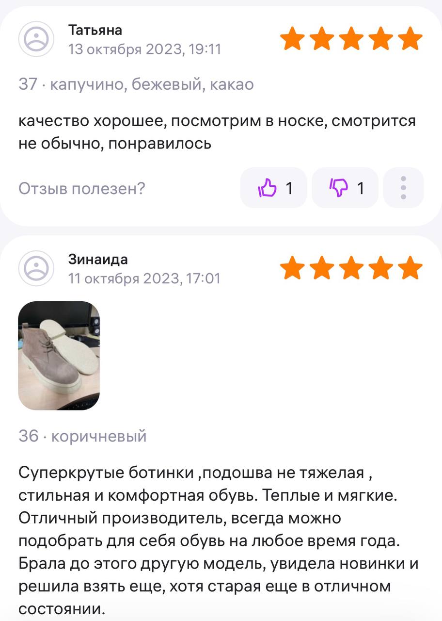 Ботинки хорошие, кажа мягкая, размеру соответствуют, но на пятке пришита заплатка из какой то пленки блесящей и когда первый раз померла она вся сморщилась и такое впечатление что сейчас лопнет. И я думаю со временем так и будет. Если бы не эта заплатка взяла бы удобные и мягкие