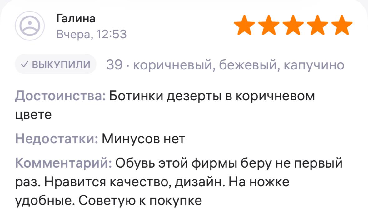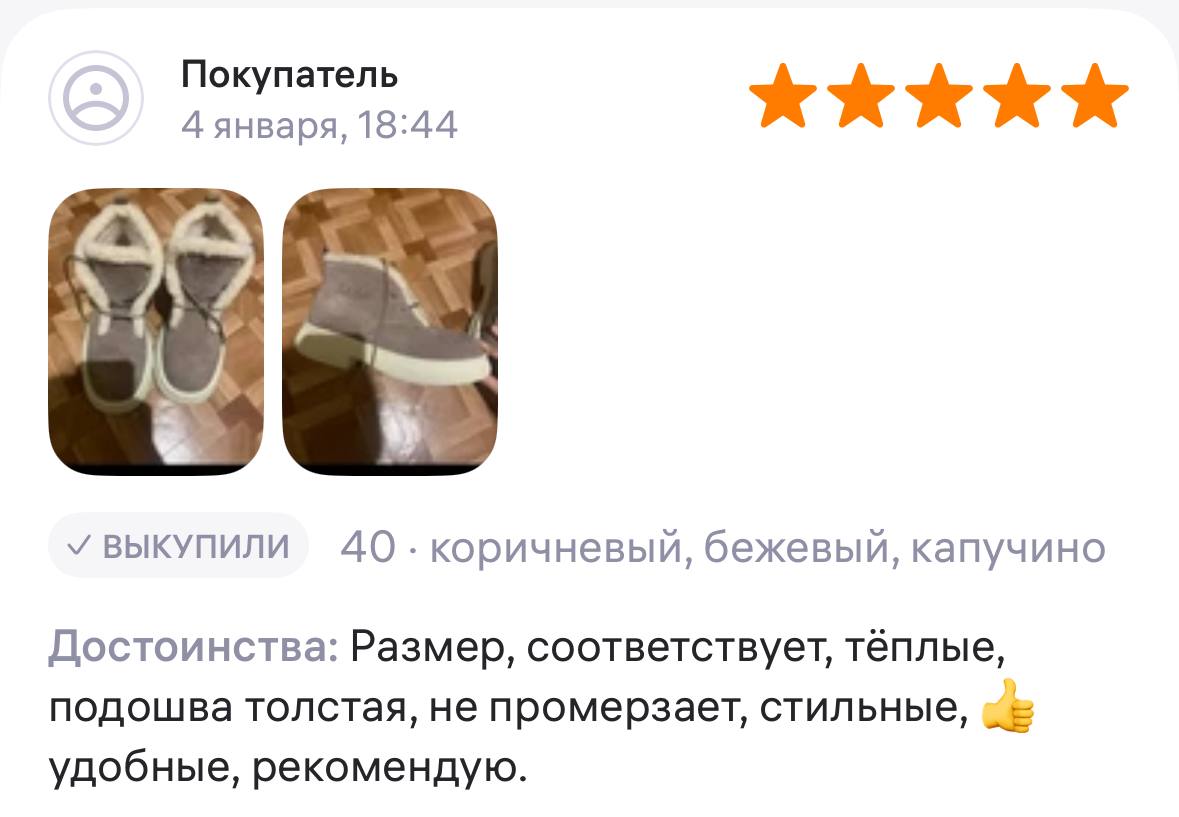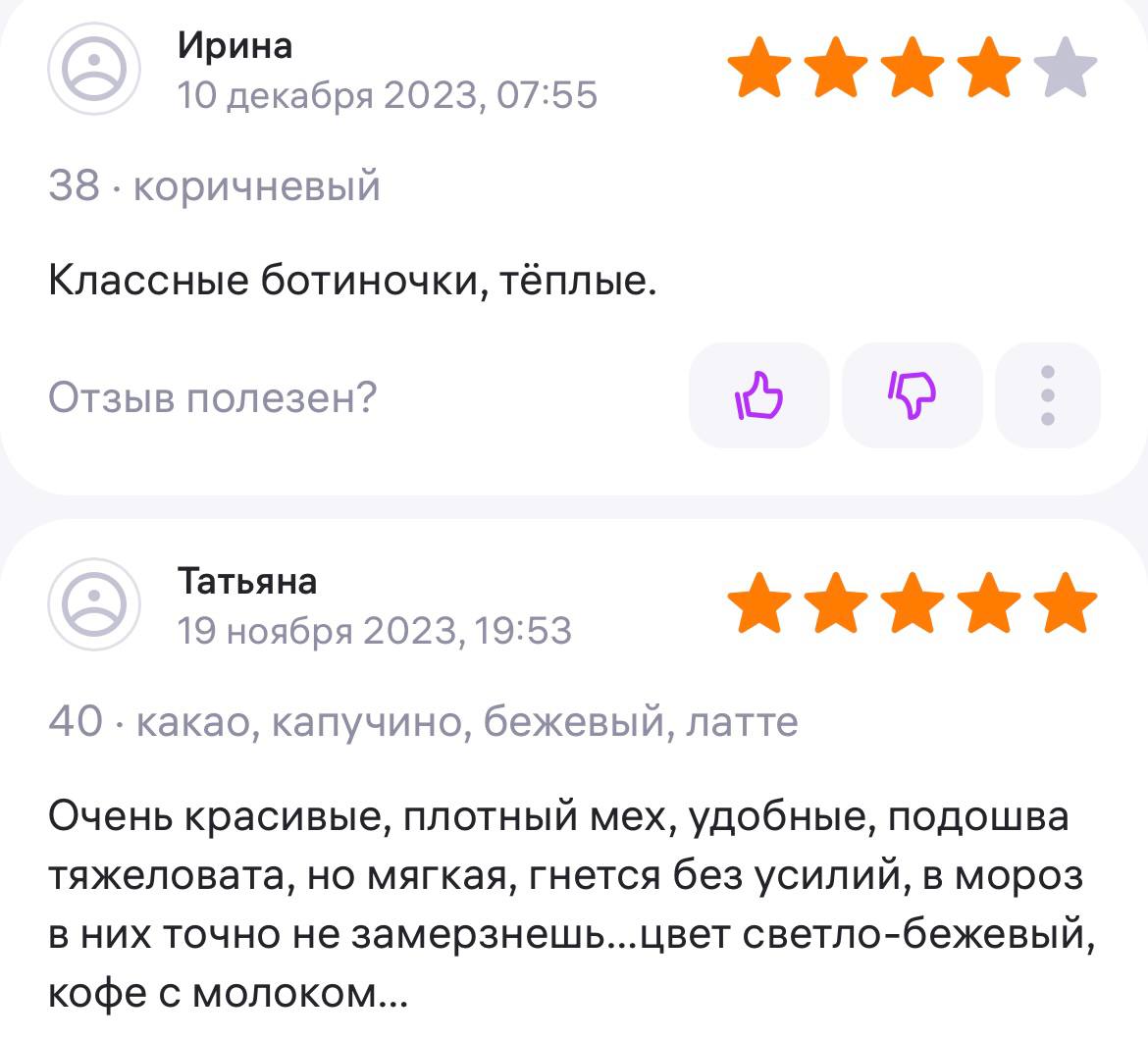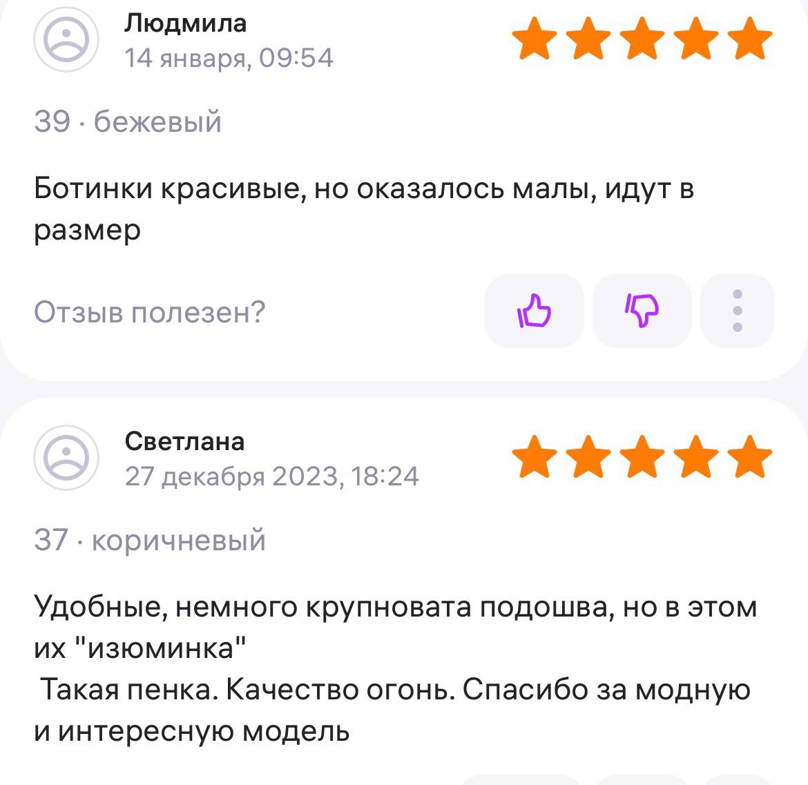 Ботинки хорошие, кажа мягкая, размеру соответствуют, но на пятке пришита заплатка из какой то пленки блесящей и когда первый раз померла она вся сморщилась и такое впечатление что сейчас лопнет. И я думаю со временем так и будет. Если бы не эта заплатка взяла бы удобные и мягкие