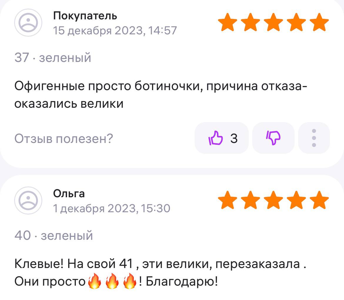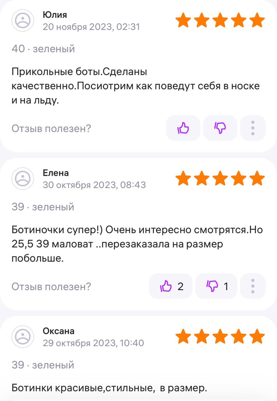 Ботинки хорошие, кажа мягкая, размеру соответствуют, но на пятке пришита заплатка из какой то пленки блесящей и когда первый раз померла она вся сморщилась и такое впечатление что сейчас лопнет. И я думаю со временем так и будет. Если бы не эта заплатка взяла бы удобные и мягкие