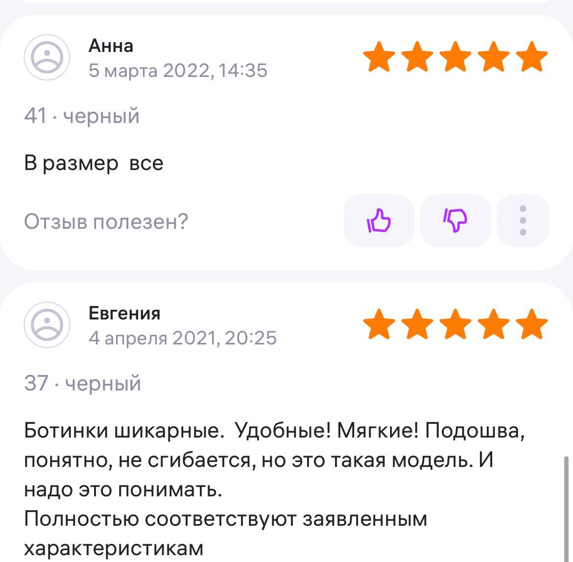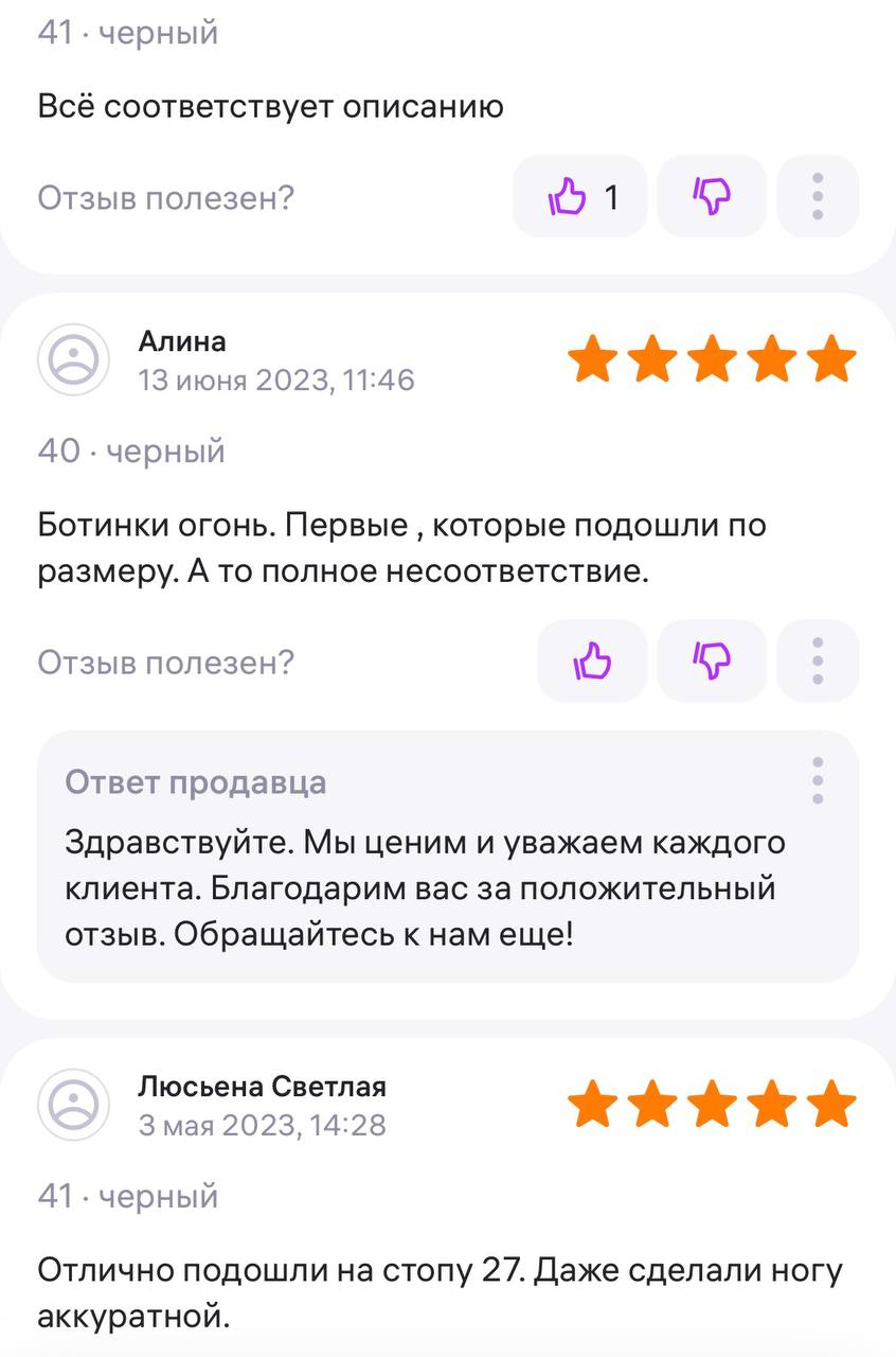 Ботинки хорошие, кажа мягкая, размеру соответствуют, но на пятке пришита заплатка из какой то пленки блесящей и когда первый раз померла она вся сморщилась и такое впечатление что сейчас лопнет. И я думаю со временем так и будет. Если бы не эта заплатка взяла бы удобные и мягкие