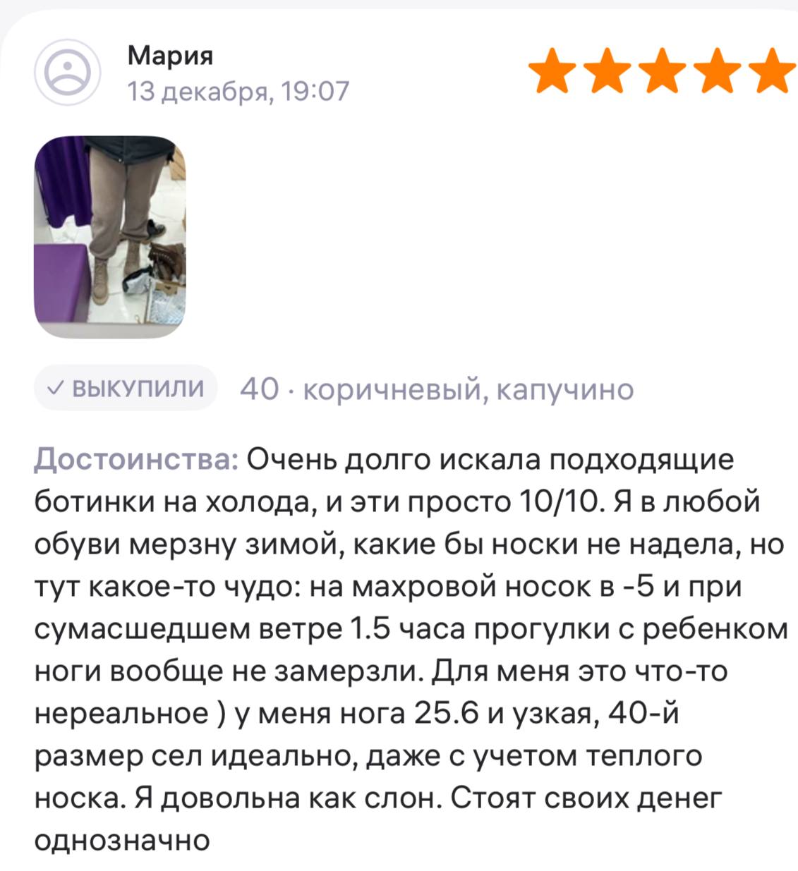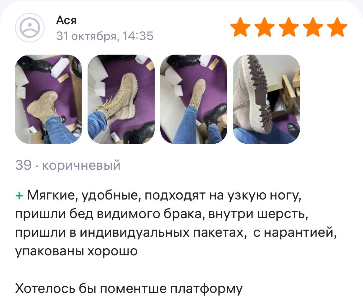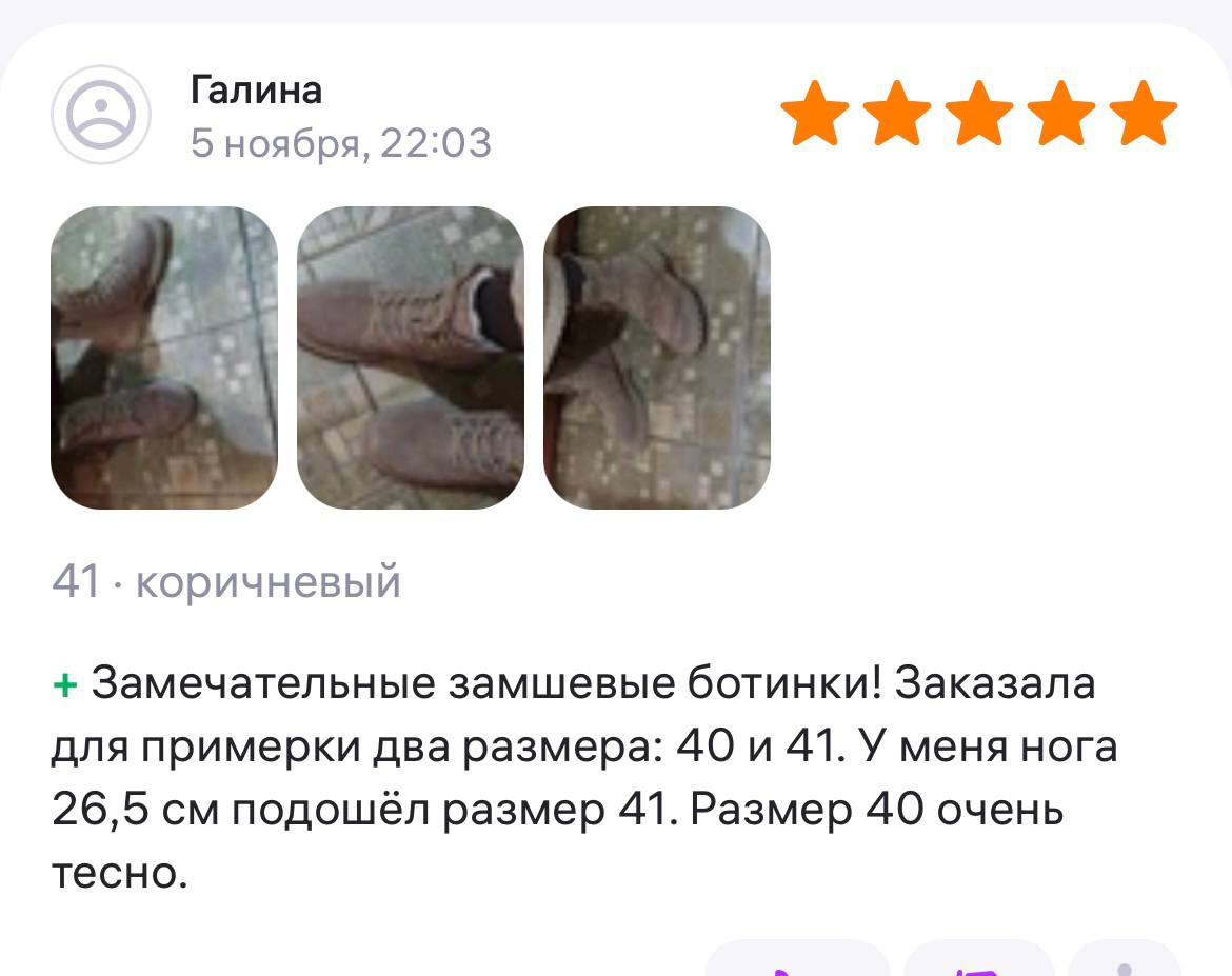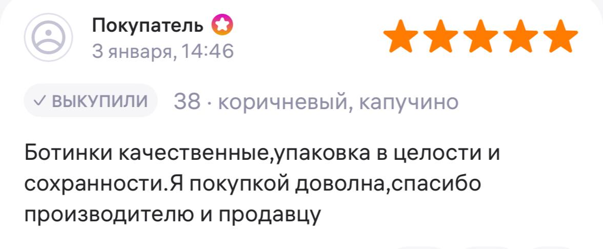 Ботинки хорошие, кажа мягкая, размеру соответствуют, но на пятке пришита заплатка из какой то пленки блесящей и когда первый раз померла она вся сморщилась и такое впечатление что сейчас лопнет. И я думаю со временем так и будет. Если бы не эта заплатка взяла бы удобные и мягкие