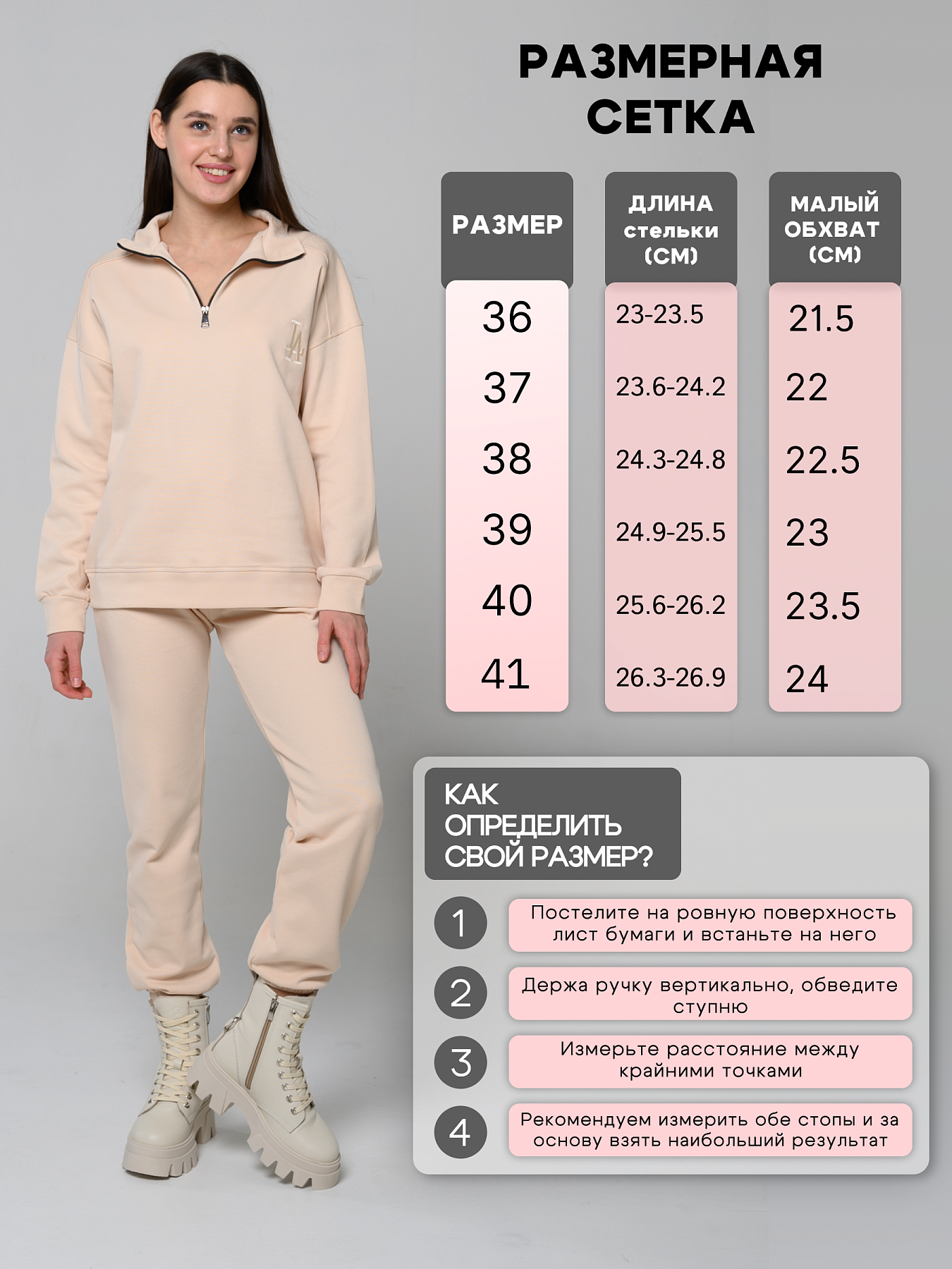 Ботинки хорошие, кажа мягкая, размеру соответствуют, но на пятке пришита заплатка из какой то пленки блесящей и когда первый раз померла она вся сморщилась и такое впечатление что сейчас лопнет. И я думаю со временем так и будет. Если бы не эта заплатка взяла бы удобные и мягкие