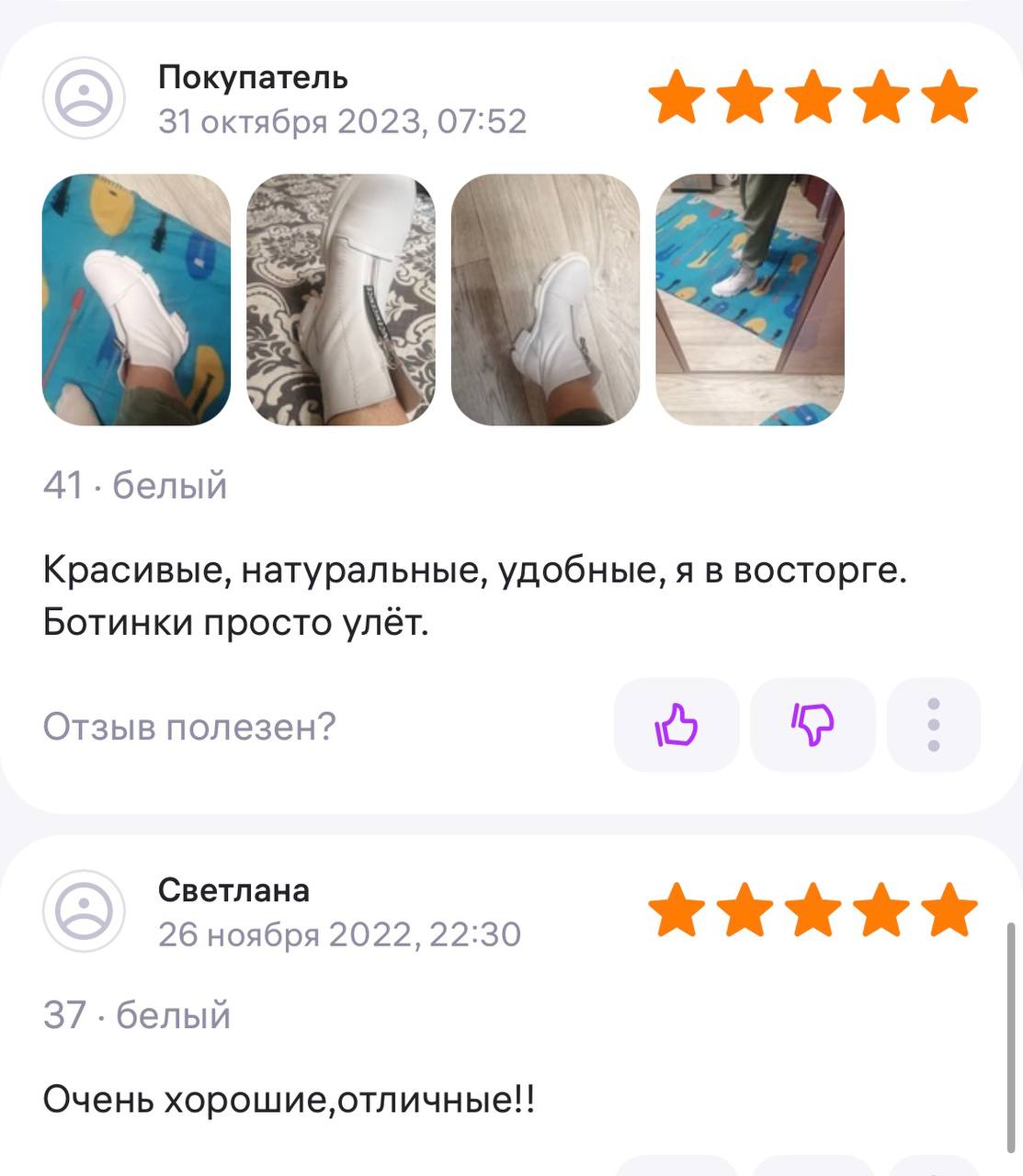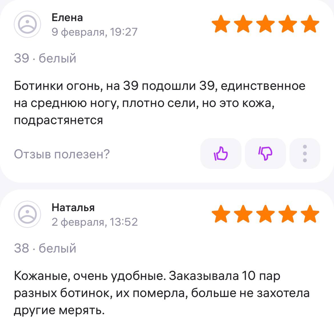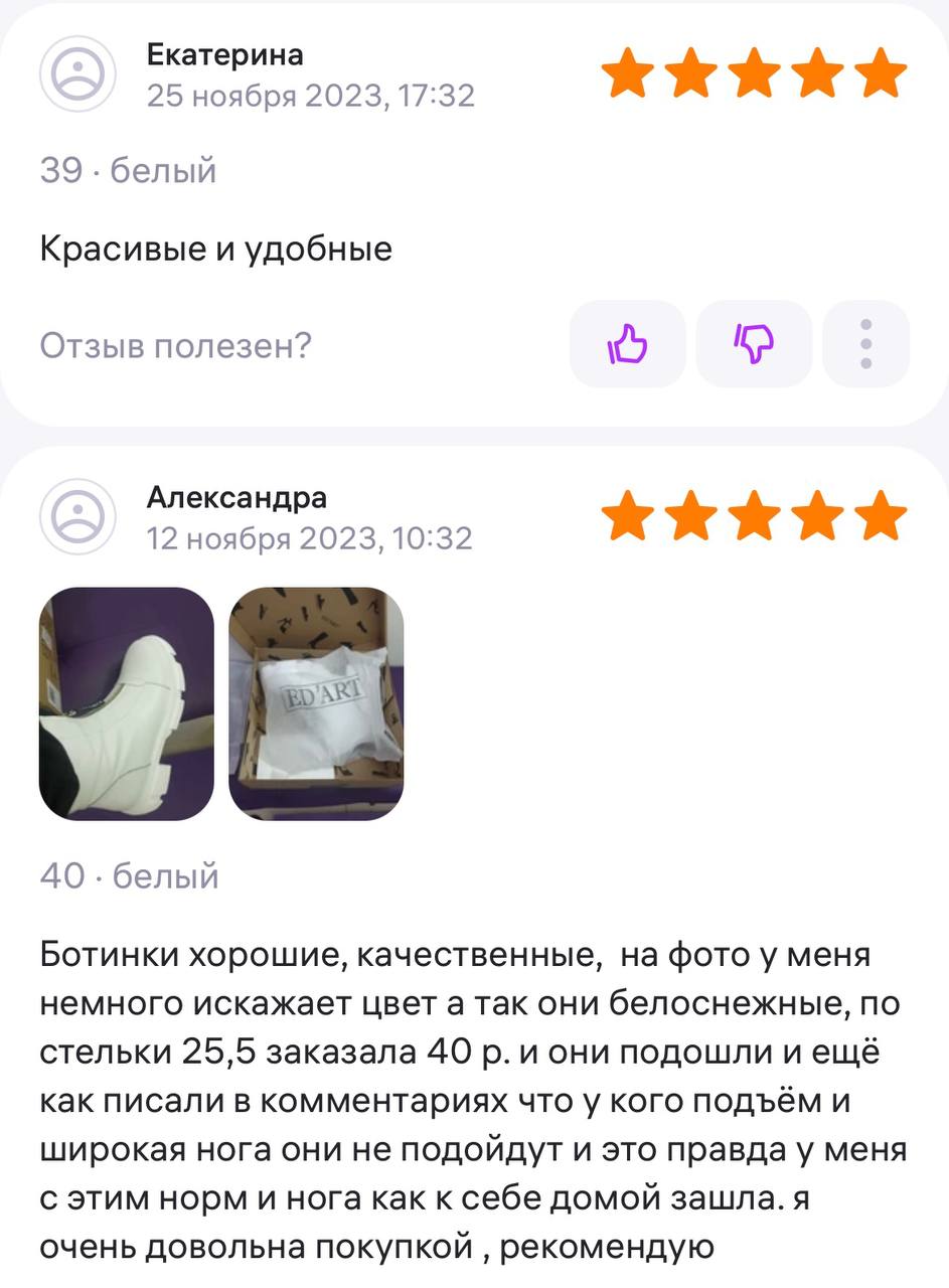 Ботинки хорошие, кажа мягкая, размеру соответствуют, но на пятке пришита заплатка из какой то пленки блесящей и когда первый раз померла она вся сморщилась и такое впечатление что сейчас лопнет. И я думаю со временем так и будет. Если бы не эта заплатка взяла бы удобные и мягкие