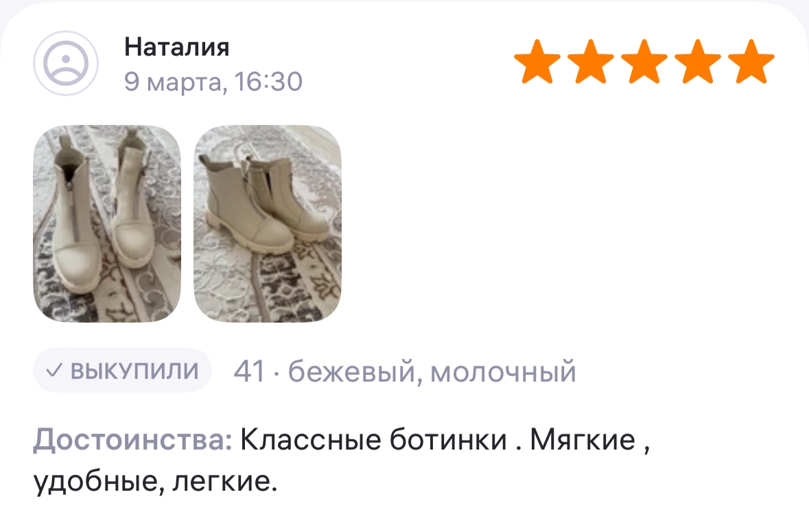 Ботинки хорошие, кажа мягкая, размеру соответствуют, но на пятке пришита заплатка из какой то пленки блесящей и когда первый раз померла она вся сморщилась и такое впечатление что сейчас лопнет. И я думаю со временем так и будет. Если бы не эта заплатка взяла бы удобные и мягкие