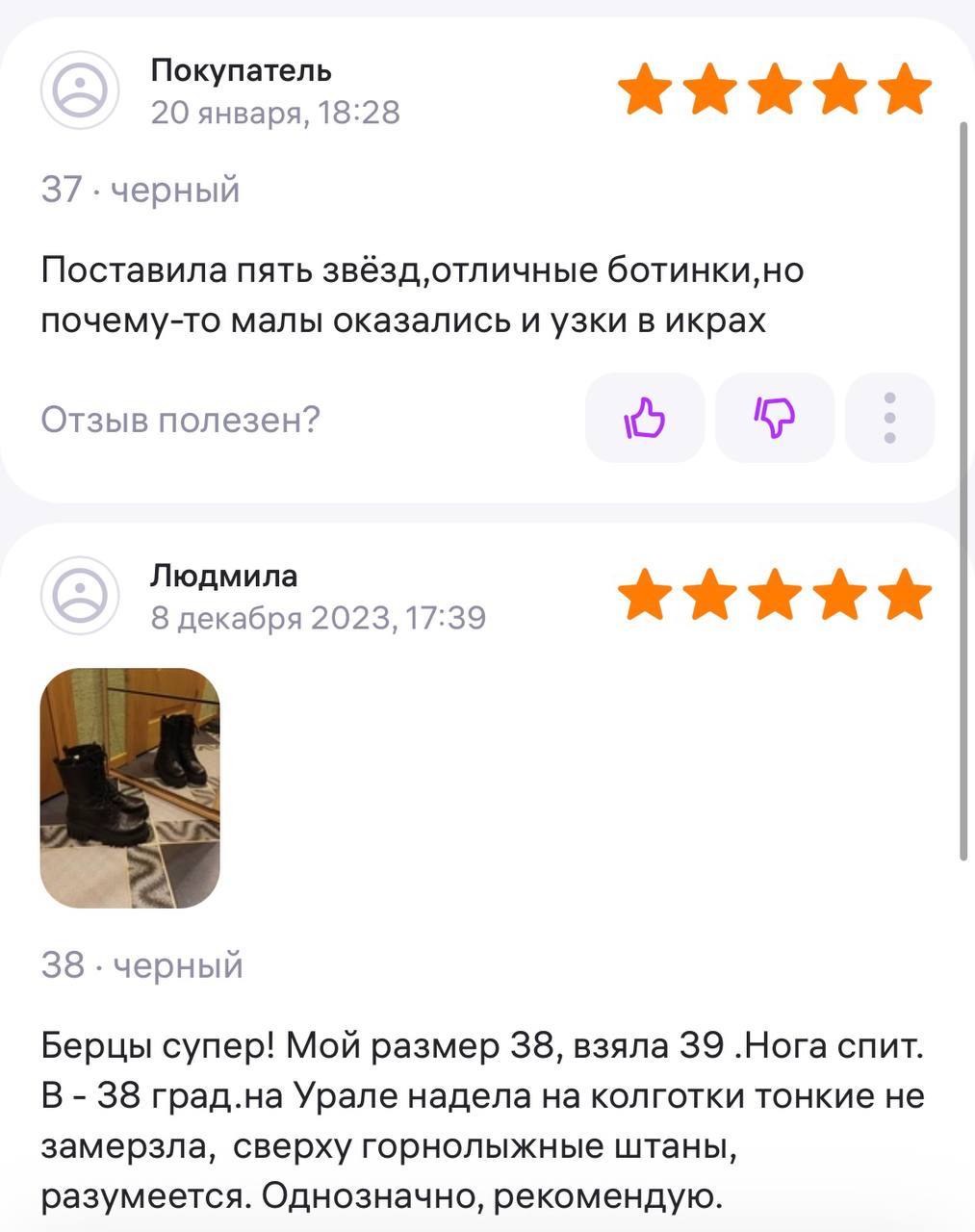 Ботинки хорошие, кажа мягкая, размеру соответствуют, но на пятке пришита заплатка из какой то пленки блесящей и когда первый раз померла она вся сморщилась и такое впечатление что сейчас лопнет. И я думаю со временем так и будет. Если бы не эта заплатка взяла бы удобные и мягкие