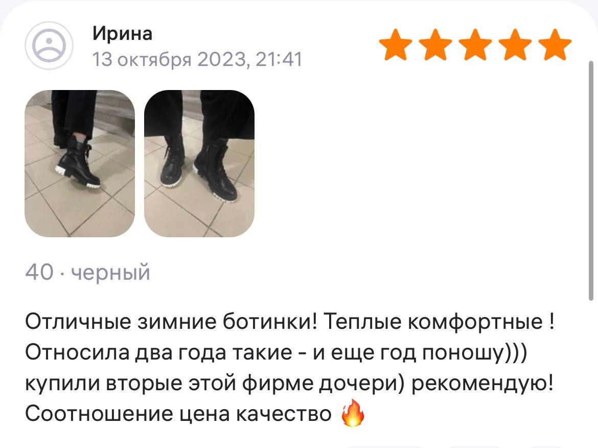 Ботинки хорошие, кажа мягкая, размеру соответствуют, но на пятке пришита заплатка из какой то пленки блесящей и когда первый раз померла она вся сморщилась и такое впечатление что сейчас лопнет. И я думаю со временем так и будет. Если бы не эта заплатка взяла бы удобные и мягкие