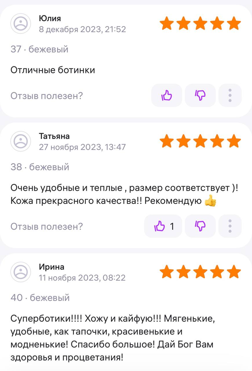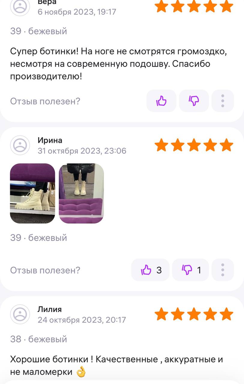 Ботинки хорошие, кажа мягкая, размеру соответствуют, но на пятке пришита заплатка из какой то пленки блесящей и когда первый раз померла она вся сморщилась и такое впечатление что сейчас лопнет. И я думаю со временем так и будет. Если бы не эта заплатка взяла бы удобные и мягкие