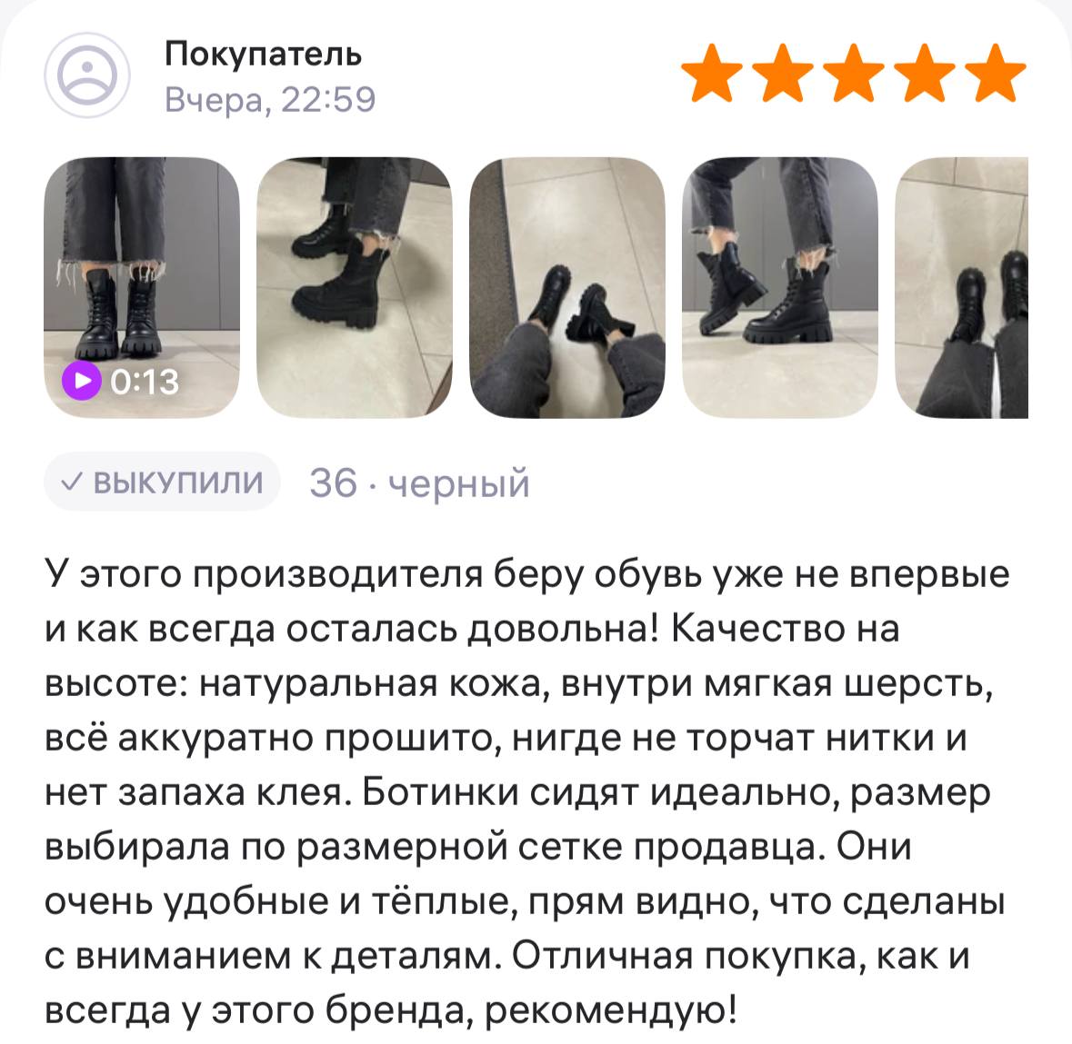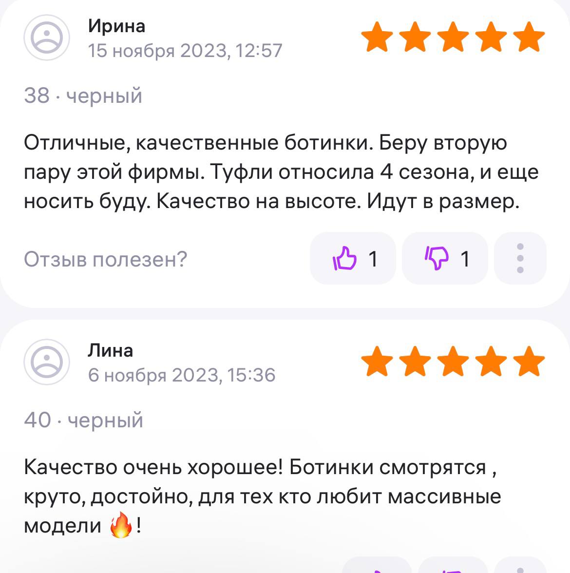 Ботинки хорошие, кажа мягкая, размеру соответствуют, но на пятке пришита заплатка из какой то пленки блесящей и когда первый раз померла она вся сморщилась и такое впечатление что сейчас лопнет. И я думаю со временем так и будет. Если бы не эта заплатка взяла бы удобные и мягкие