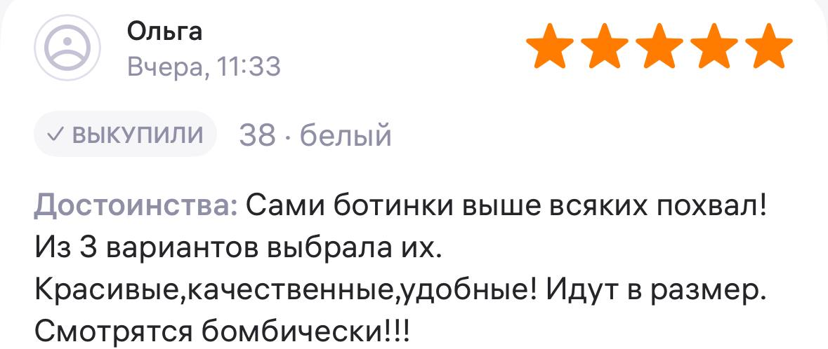 Ботинки хорошие, кажа мягкая, размеру соответствуют, но на пятке пришита заплатка из какой то пленки блесящей и когда первый раз померла она вся сморщилась и такое впечатление что сейчас лопнет. И я думаю со временем так и будет. Если бы не эта заплатка взяла бы удобные и мягкие