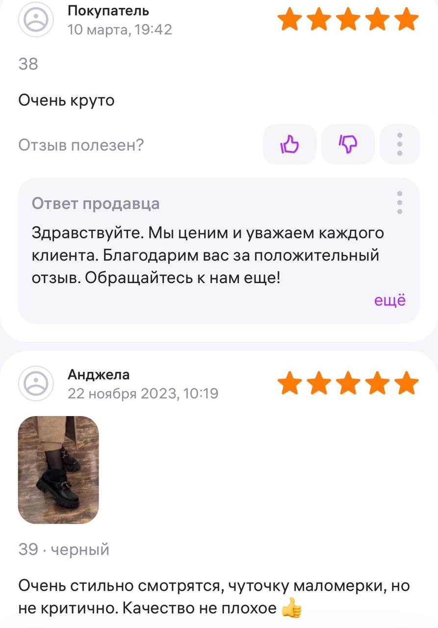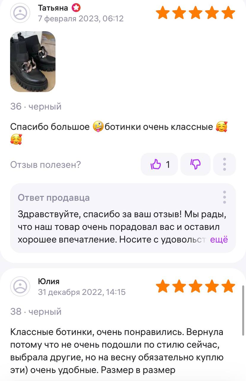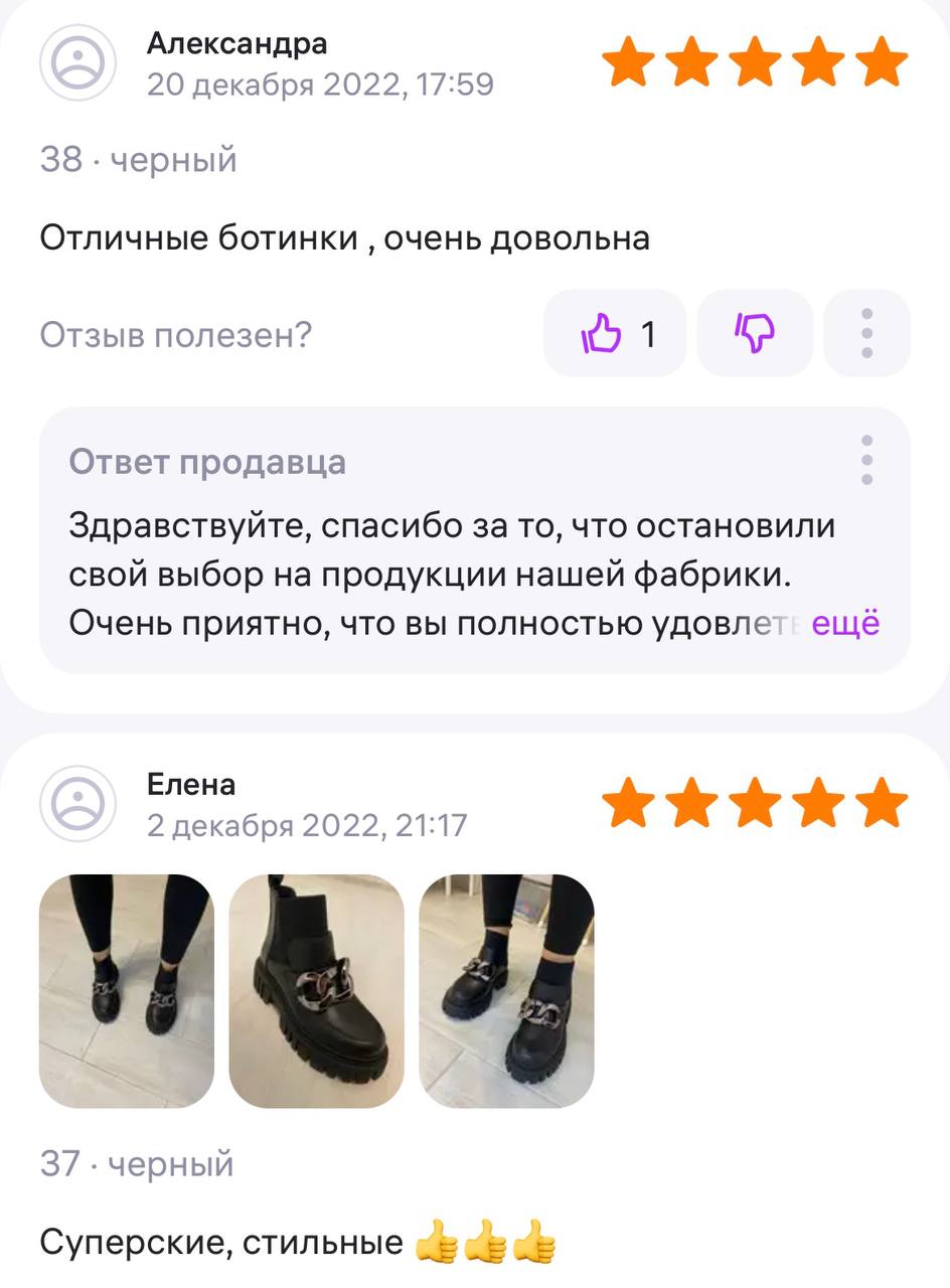 Ботинки хорошие, кажа мягкая, размеру соответствуют, но на пятке пришита заплатка из какой то пленки блесящей и когда первый раз померла она вся сморщилась и такое впечатление что сейчас лопнет. И я думаю со временем так и будет. Если бы не эта заплатка взяла бы удобные и мягкие