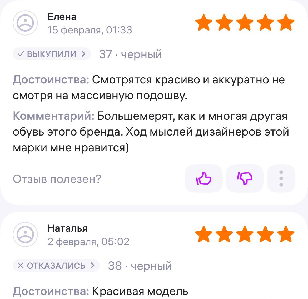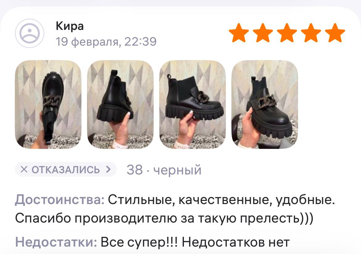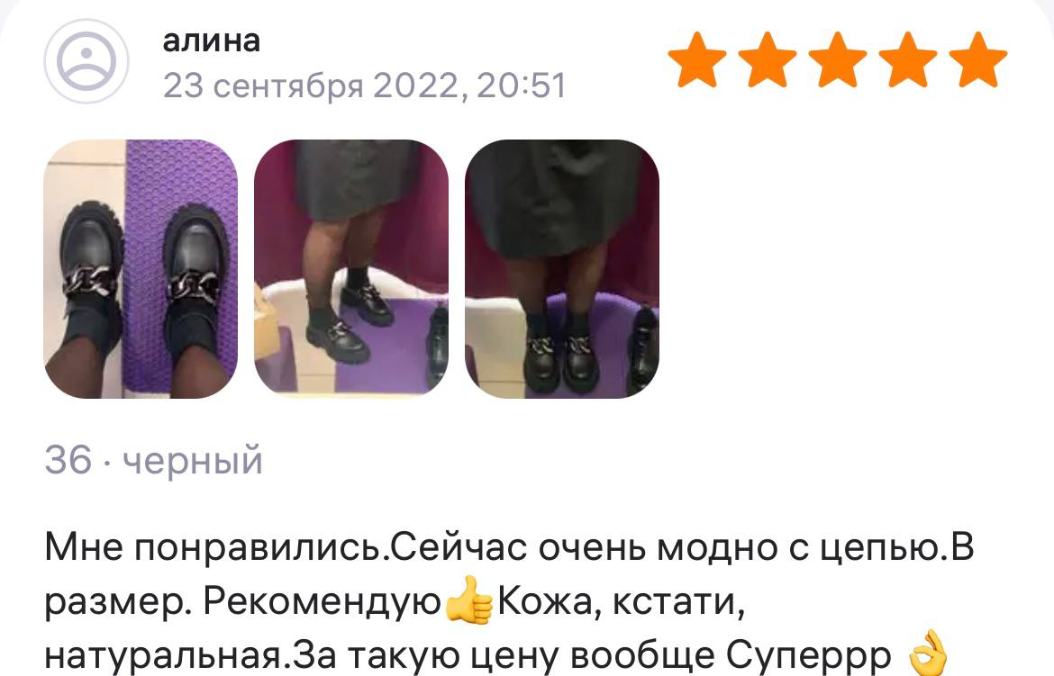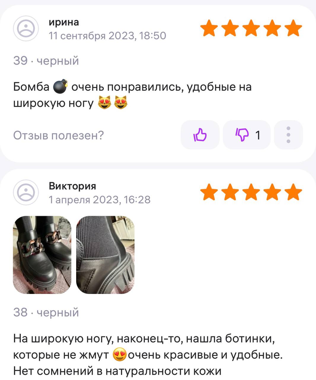 Ботинки хорошие, кажа мягкая, размеру соответствуют, но на пятке пришита заплатка из какой то пленки блесящей и когда первый раз померла она вся сморщилась и такое впечатление что сейчас лопнет. И я думаю со временем так и будет. Если бы не эта заплатка взяла бы удобные и мягкие