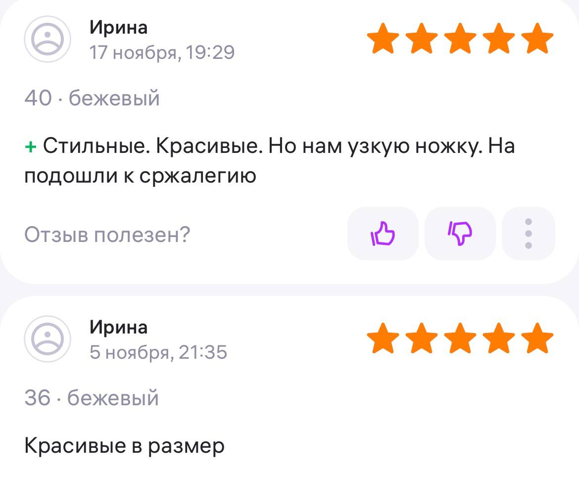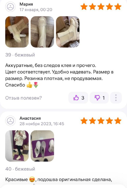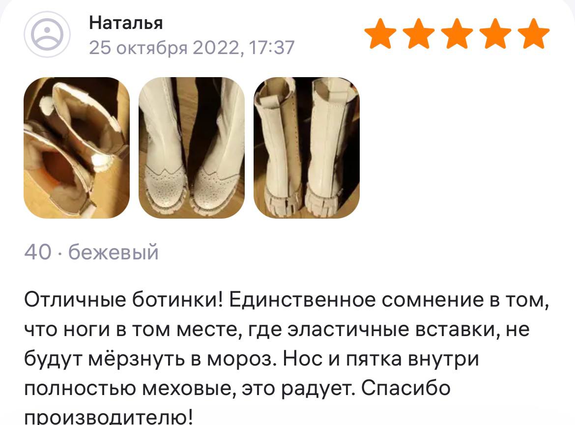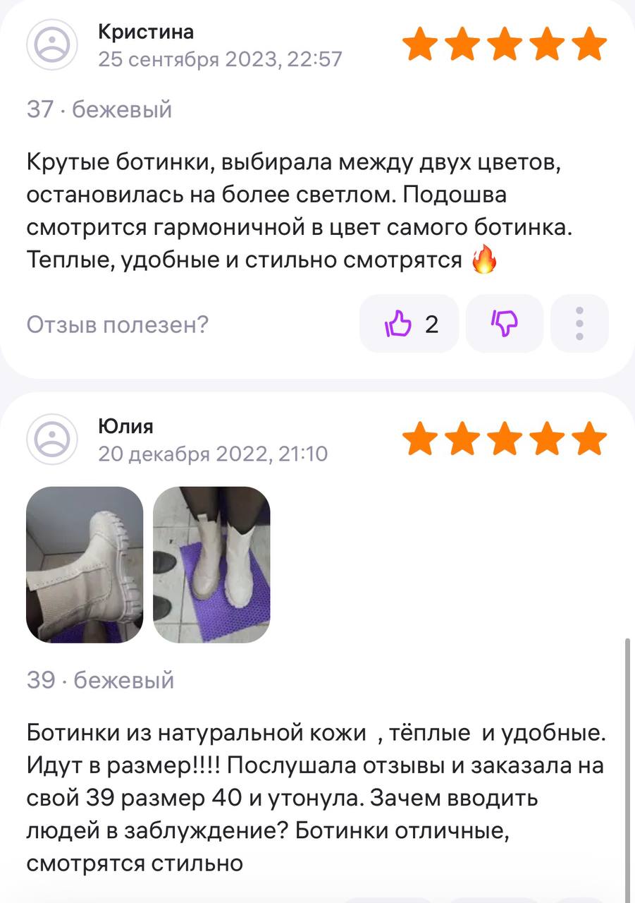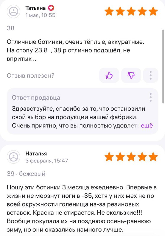 Ботинки хорошие, кажа мягкая, размеру соответствуют, но на пятке пришита заплатка из какой то пленки блесящей и когда первый раз померла она вся сморщилась и такое впечатление что сейчас лопнет. И я думаю со временем так и будет. Если бы не эта заплатка взяла бы удобные и мягкие