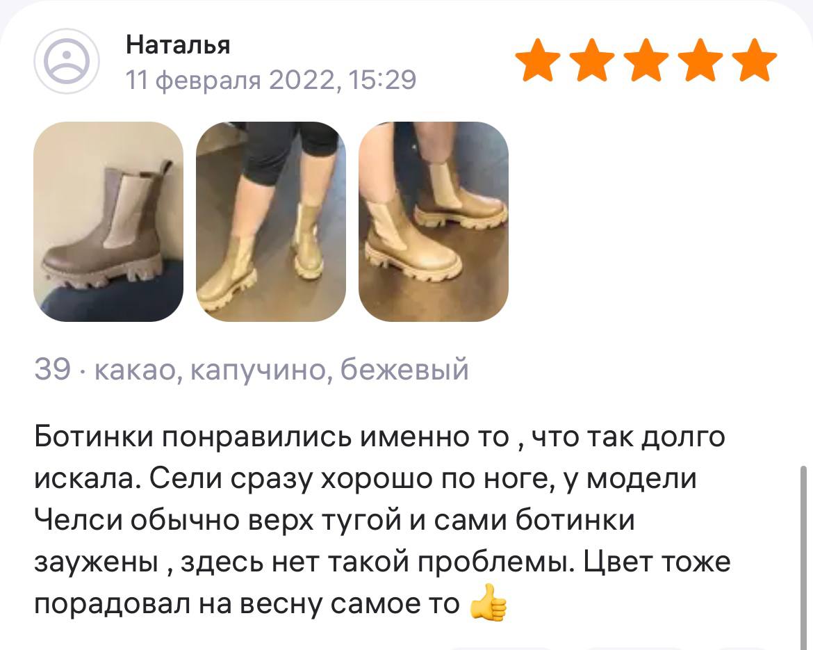 Ботинки хорошие, кажа мягкая, размеру соответствуют, но на пятке пришита заплатка из какой то пленки блесящей и когда первый раз померла она вся сморщилась и такое впечатление что сейчас лопнет. И я думаю со временем так и будет. Если бы не эта заплатка взяла бы удобные и мягкие