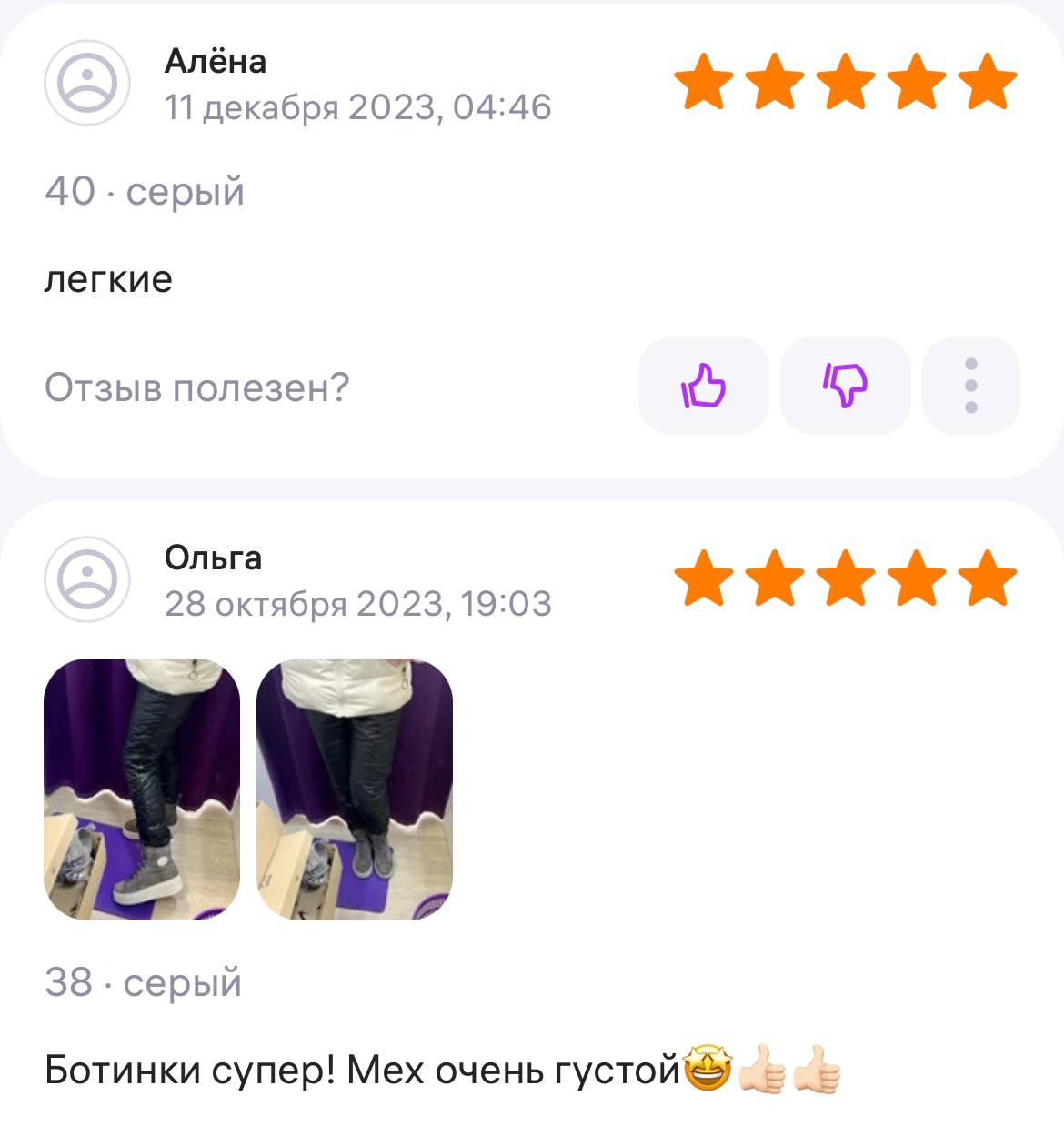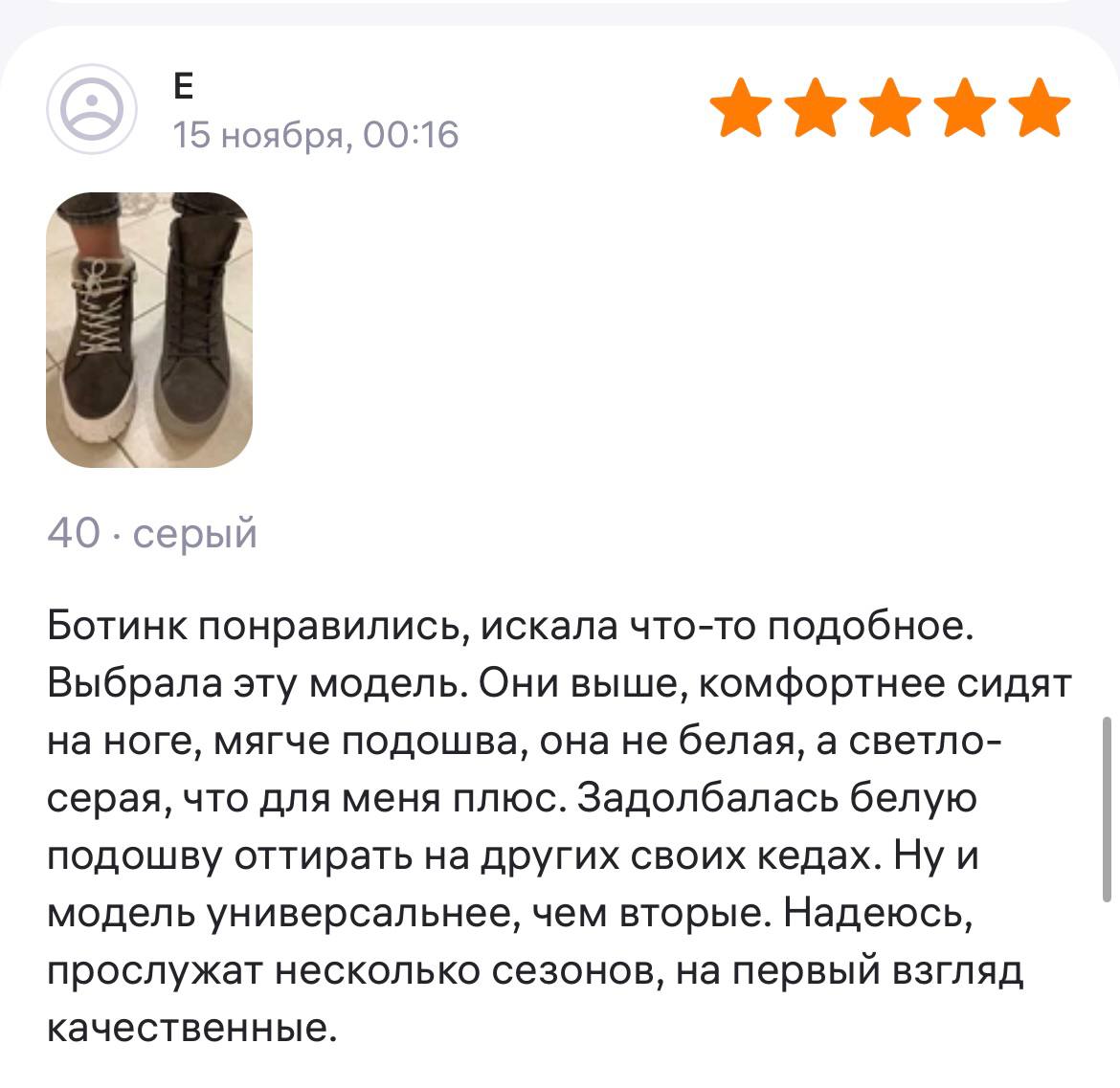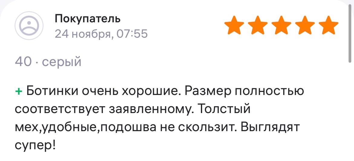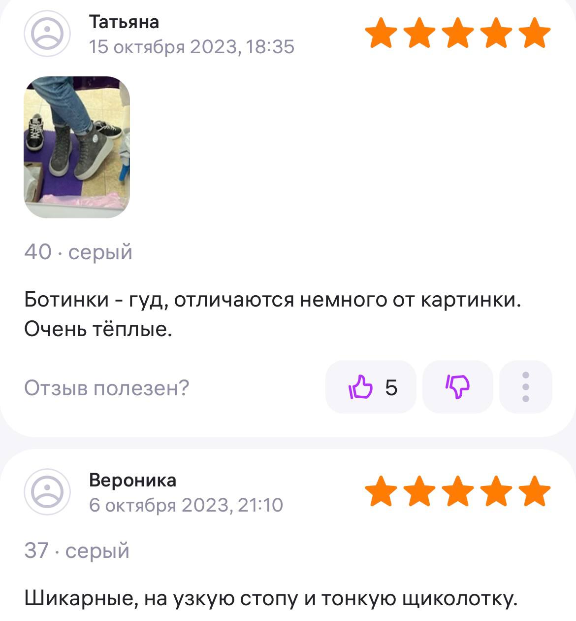 Ботинки хорошие, кажа мягкая, размеру соответствуют, но на пятке пришита заплатка из какой то пленки блесящей и когда первый раз померла она вся сморщилась и такое впечатление что сейчас лопнет. И я думаю со временем так и будет. Если бы не эта заплатка взяла бы удобные и мягкие