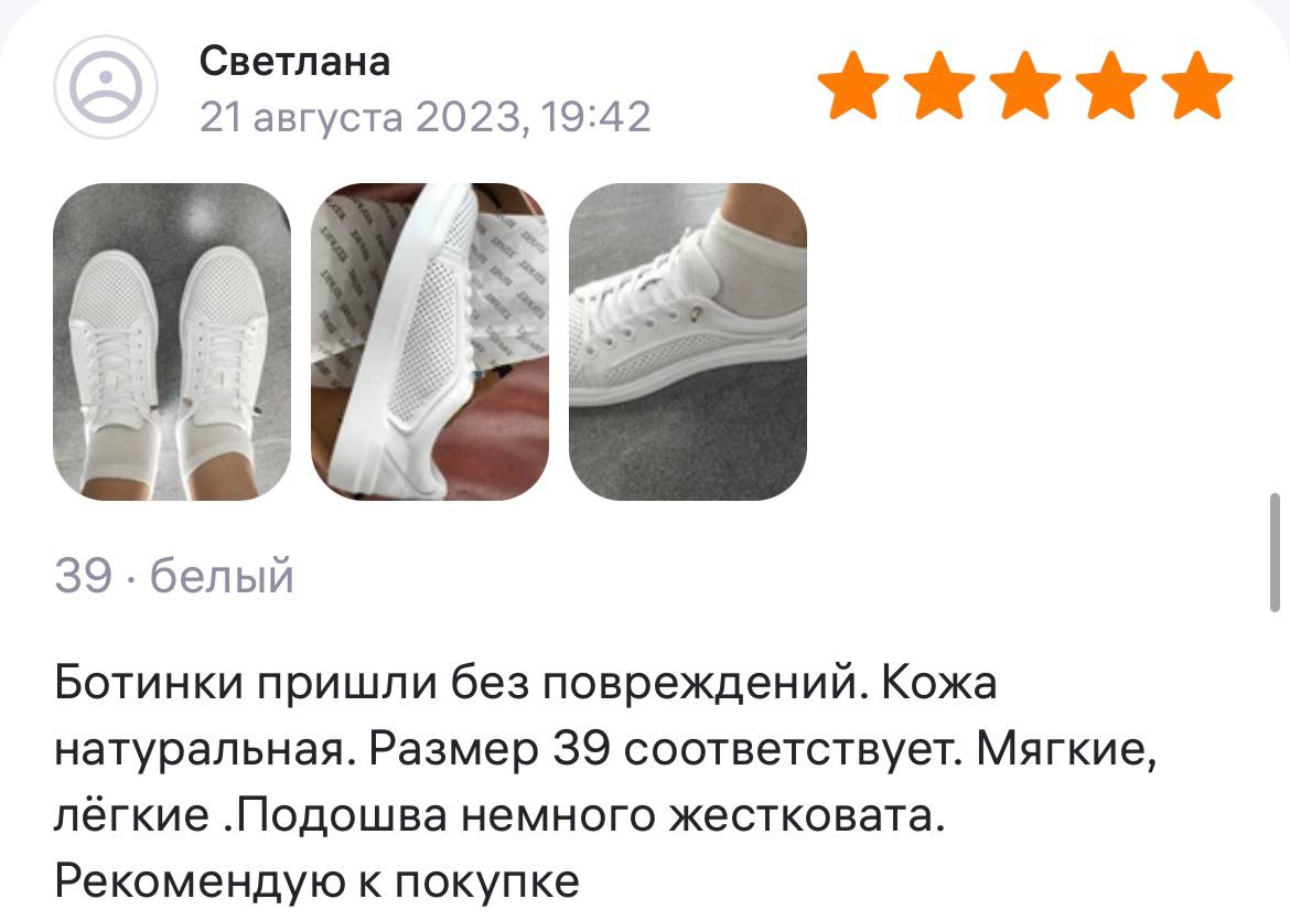 Ботинки хорошие, кажа мягкая, размеру соответствуют, но на пятке пришита заплатка из какой то пленки блесящей и когда первый раз померла она вся сморщилась и такое впечатление что сейчас лопнет. И я думаю со временем так и будет. Если бы не эта заплатка взяла бы удобные и мягкие