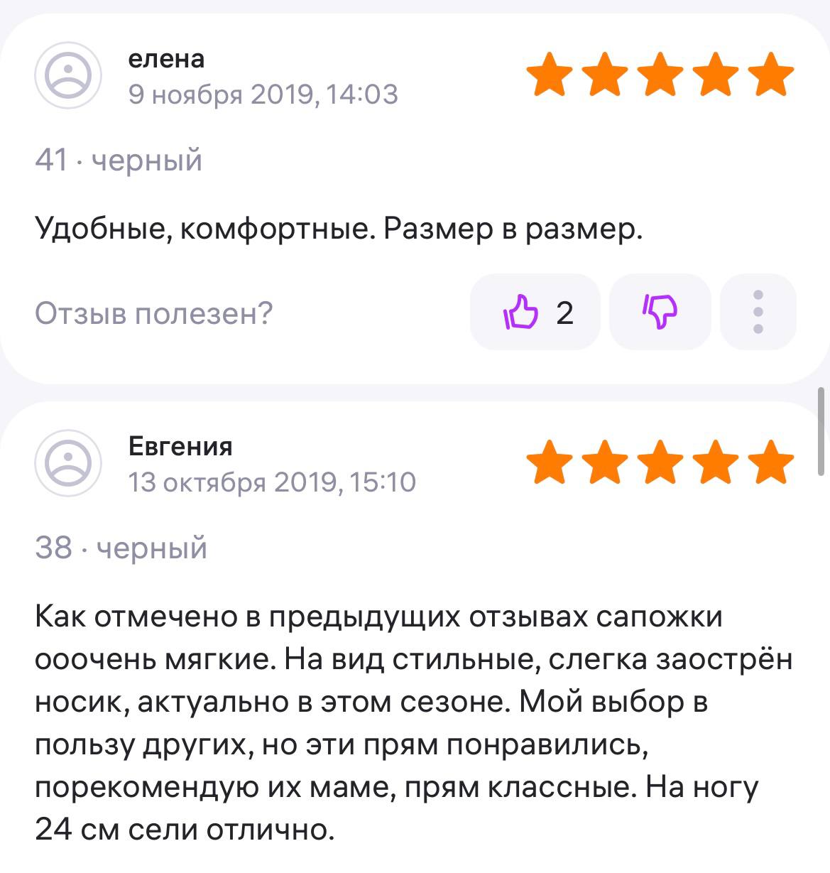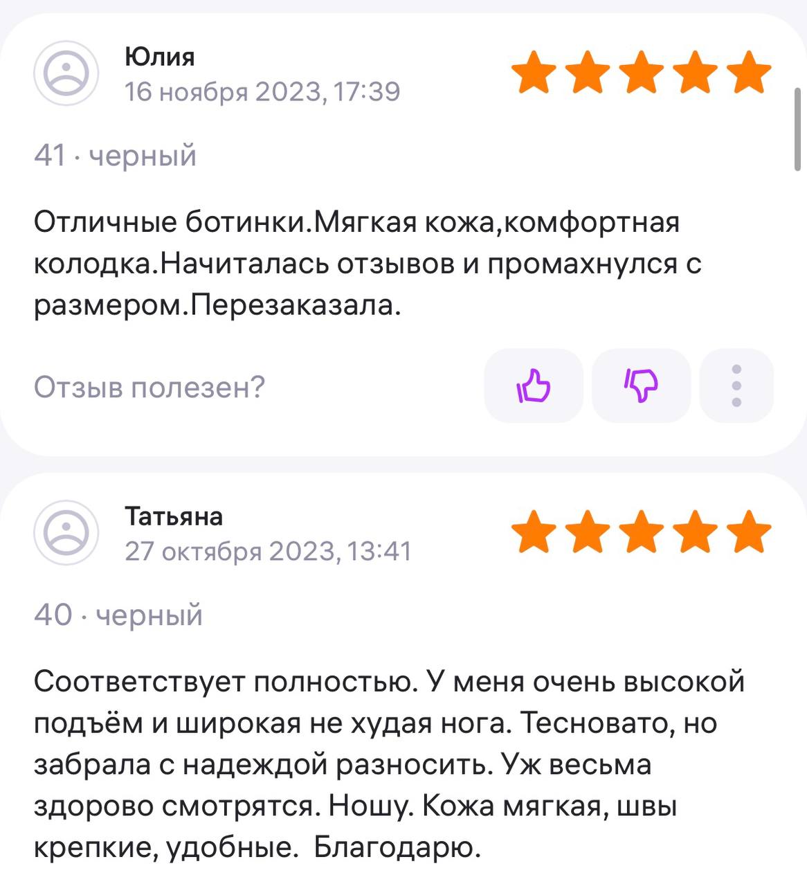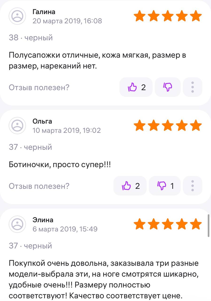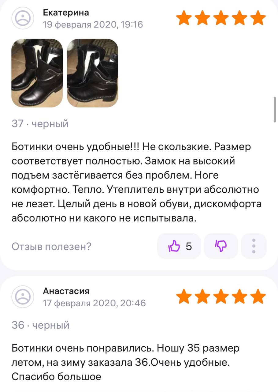 Ботинки хорошие, кажа мягкая, размеру соответствуют, но на пятке пришита заплатка из какой то пленки блесящей и когда первый раз померла она вся сморщилась и такое впечатление что сейчас лопнет. И я думаю со временем так и будет. Если бы не эта заплатка взяла бы удобные и мягкие