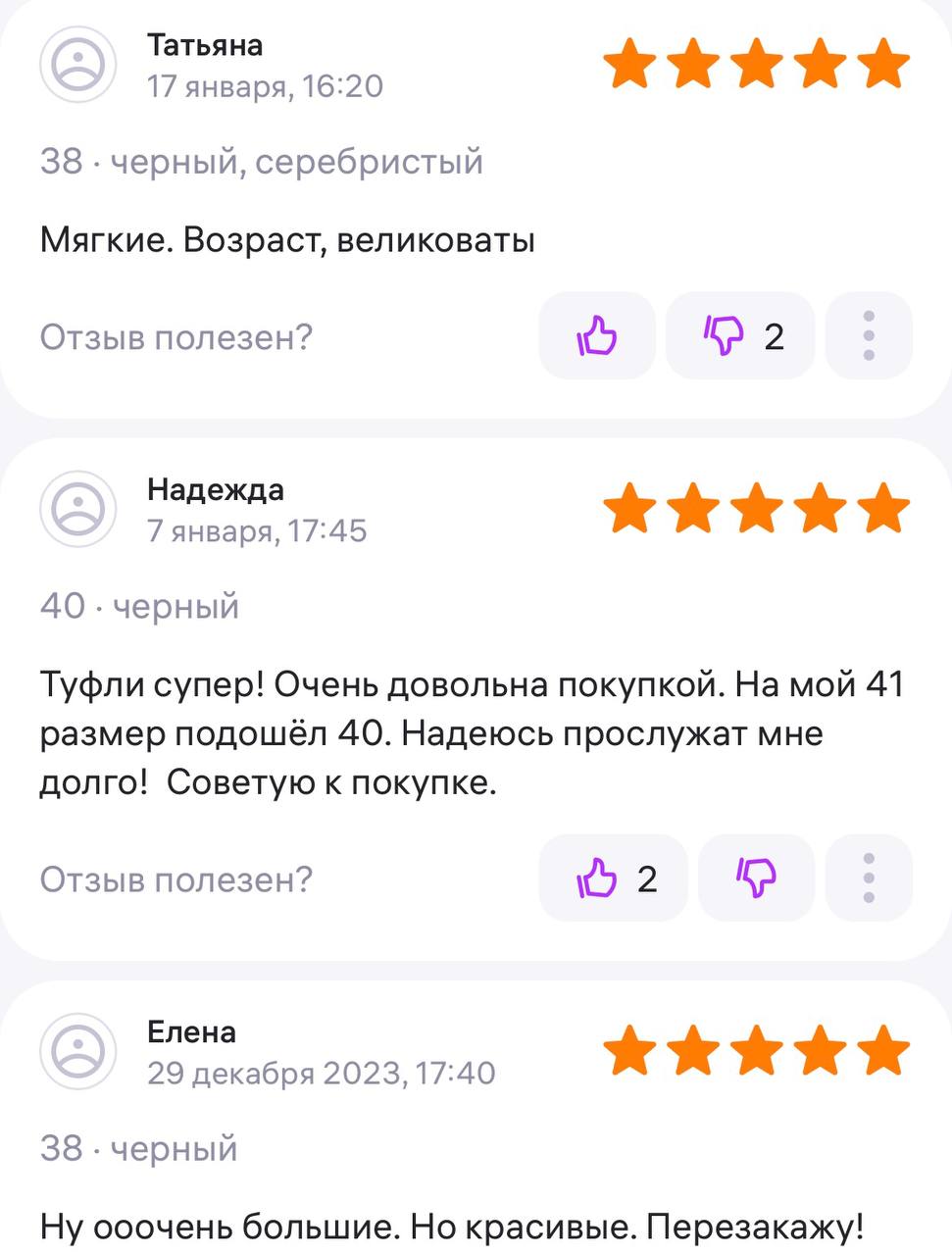 Ботинки хорошие, кажа мягкая, размеру соответствуют, но на пятке пришита заплатка из какой то пленки блесящей и когда первый раз померла она вся сморщилась и такое впечатление что сейчас лопнет. И я думаю со временем так и будет. Если бы не эта заплатка взяла бы удобные и мягкие