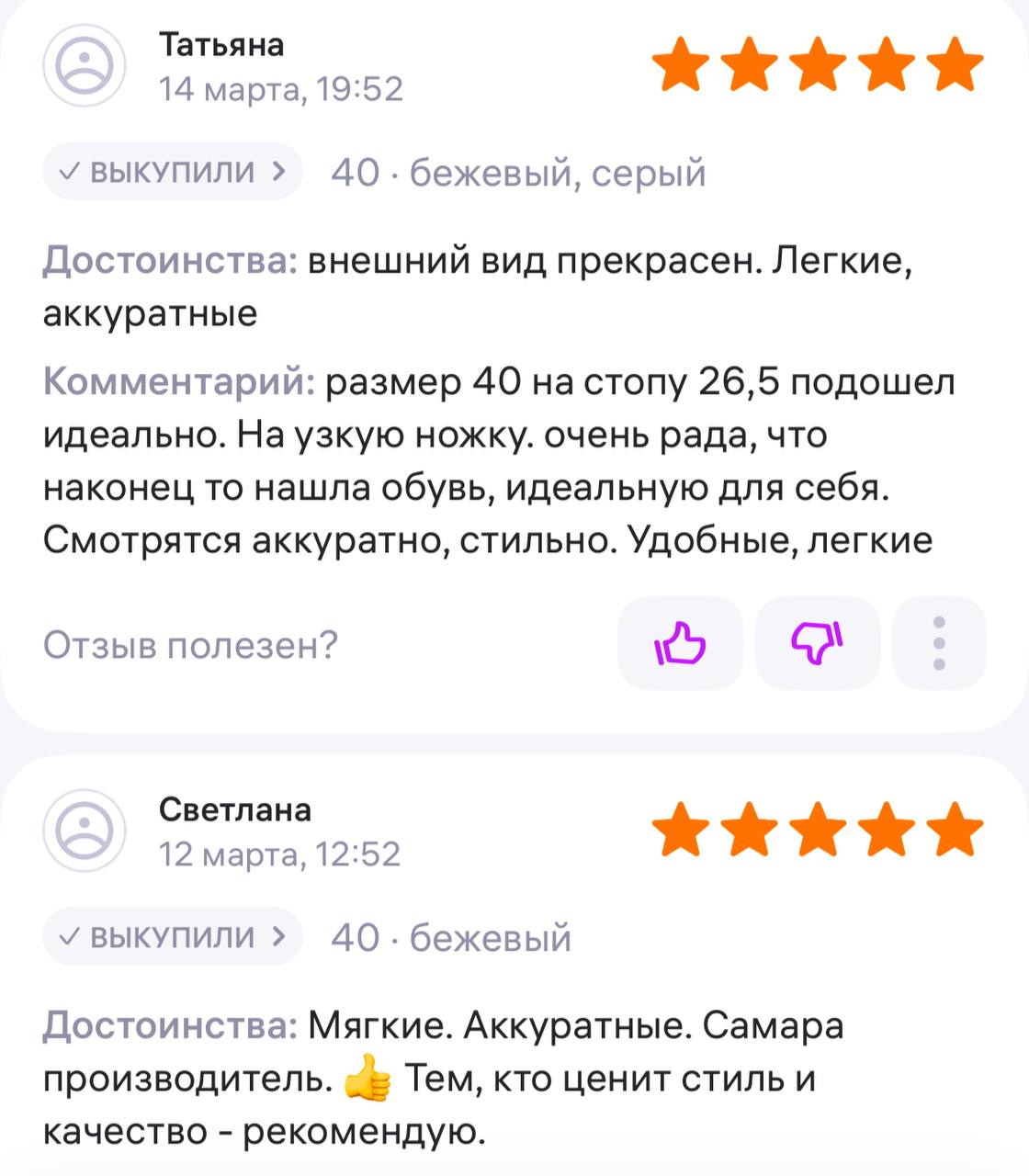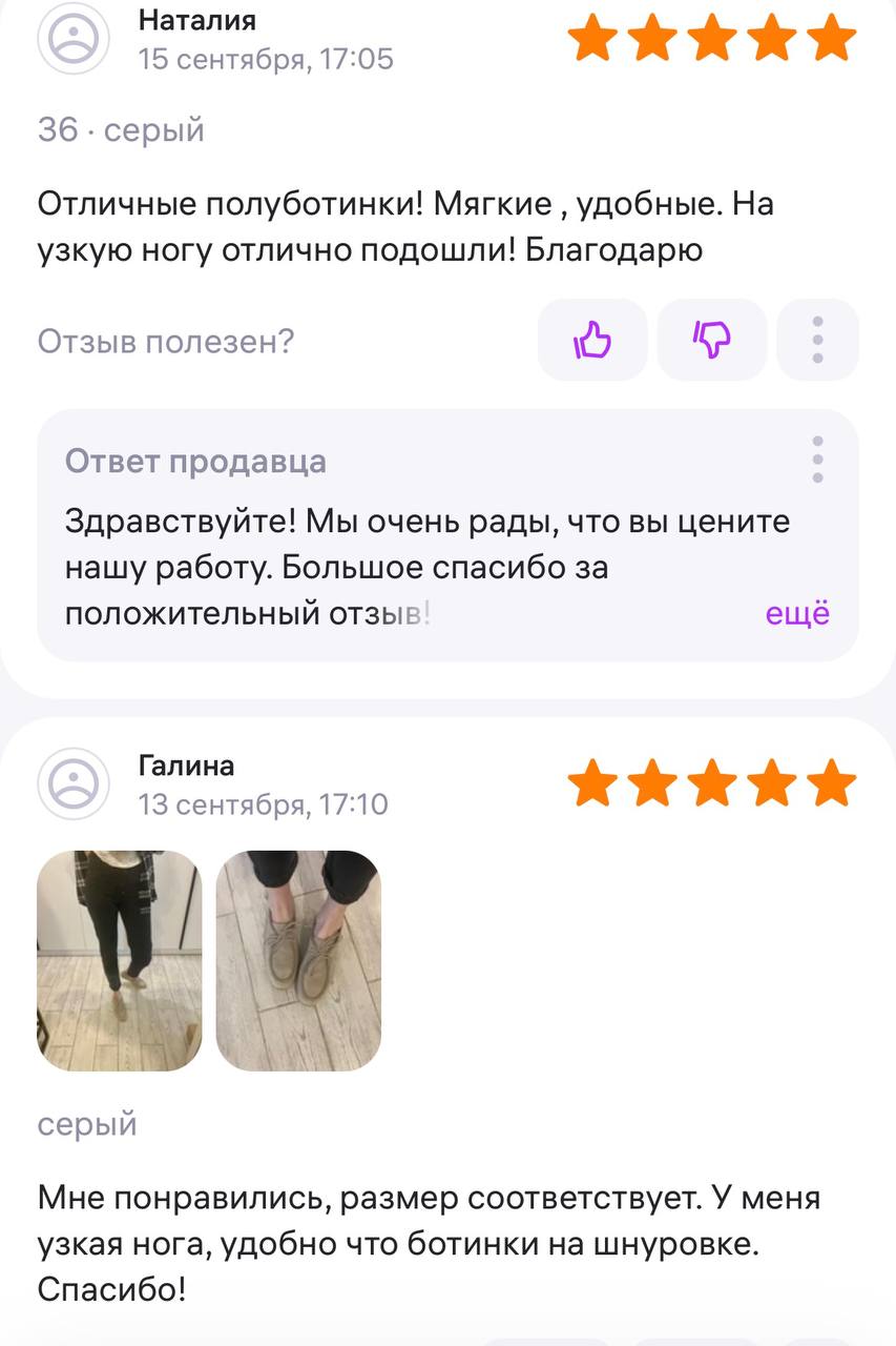 Ботинки хорошие, кажа мягкая, размеру соответствуют, но на пятке пришита заплатка из какой то пленки блесящей и когда первый раз померла она вся сморщилась и такое впечатление что сейчас лопнет. И я думаю со временем так и будет. Если бы не эта заплатка взяла бы удобные и мягкие