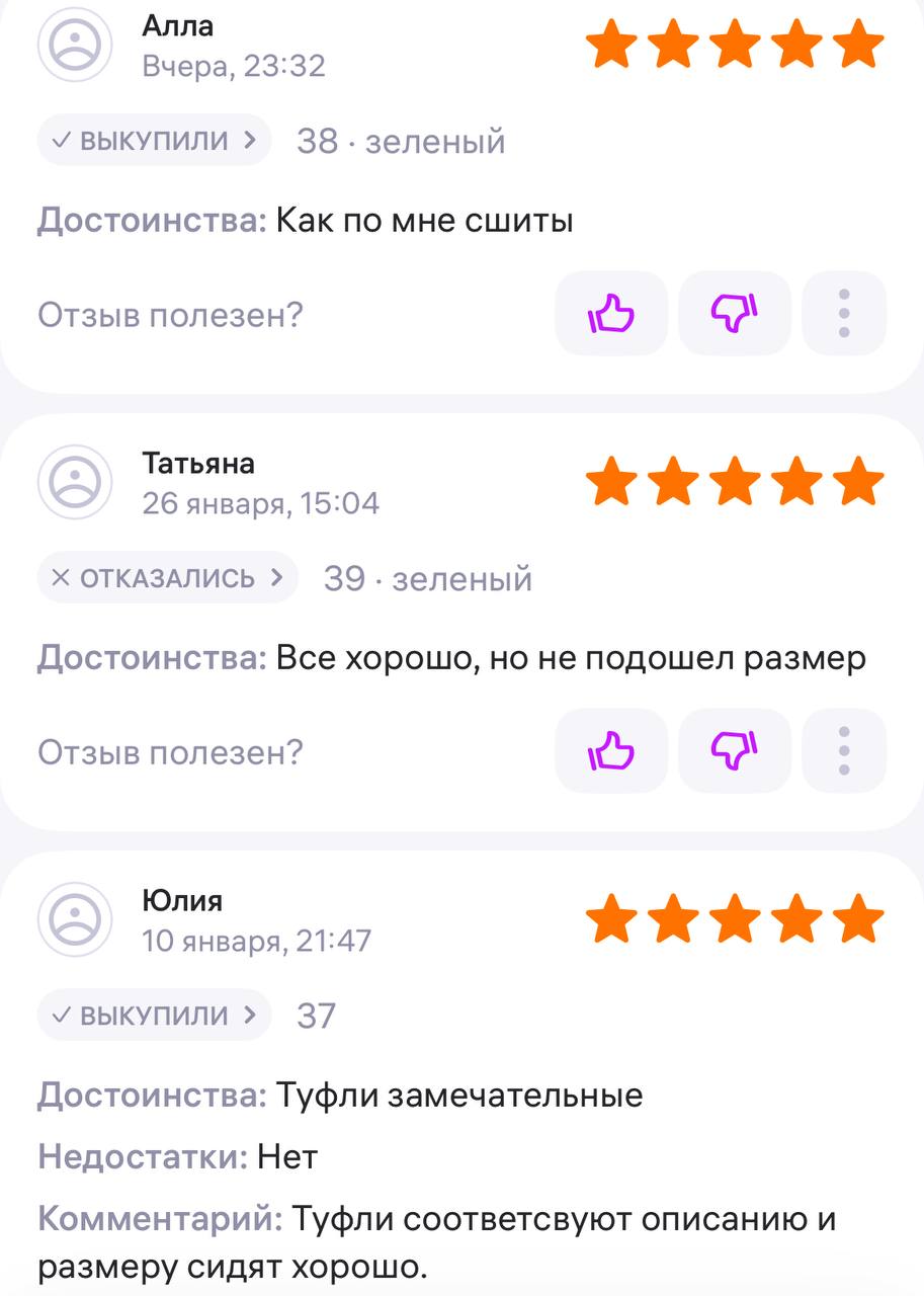 Ботинки хорошие, кажа мягкая, размеру соответствуют, но на пятке пришита заплатка из какой то пленки блесящей и когда первый раз померла она вся сморщилась и такое впечатление что сейчас лопнет. И я думаю со временем так и будет. Если бы не эта заплатка взяла бы удобные и мягкие