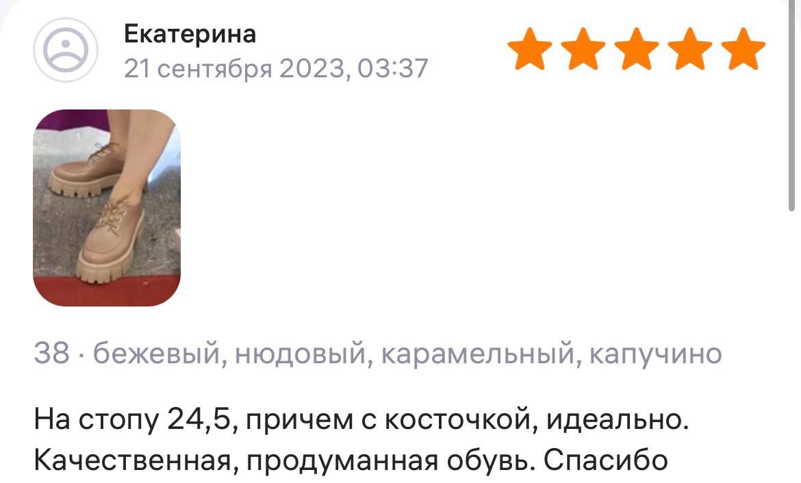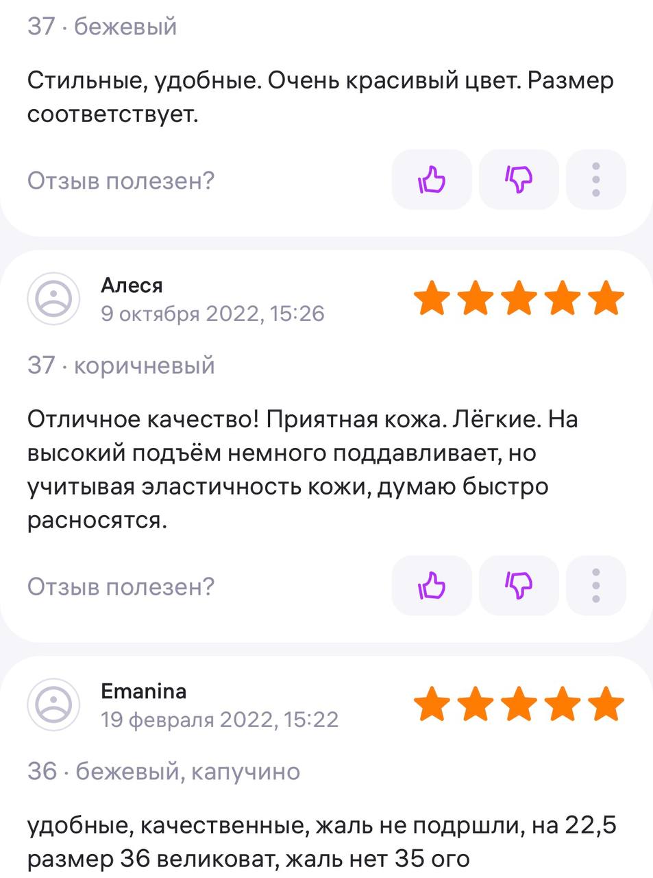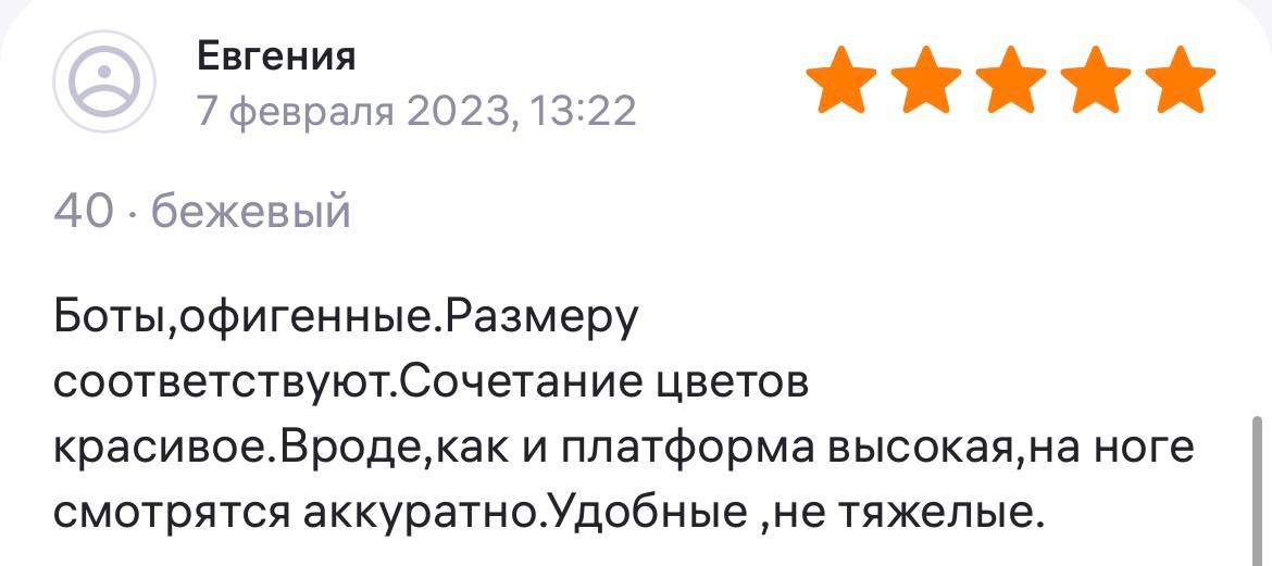 Ботинки хорошие, кажа мягкая, размеру соответствуют, но на пятке пришита заплатка из какой то пленки блесящей и когда первый раз померла она вся сморщилась и такое впечатление что сейчас лопнет. И я думаю со временем так и будет. Если бы не эта заплатка взяла бы удобные и мягкие