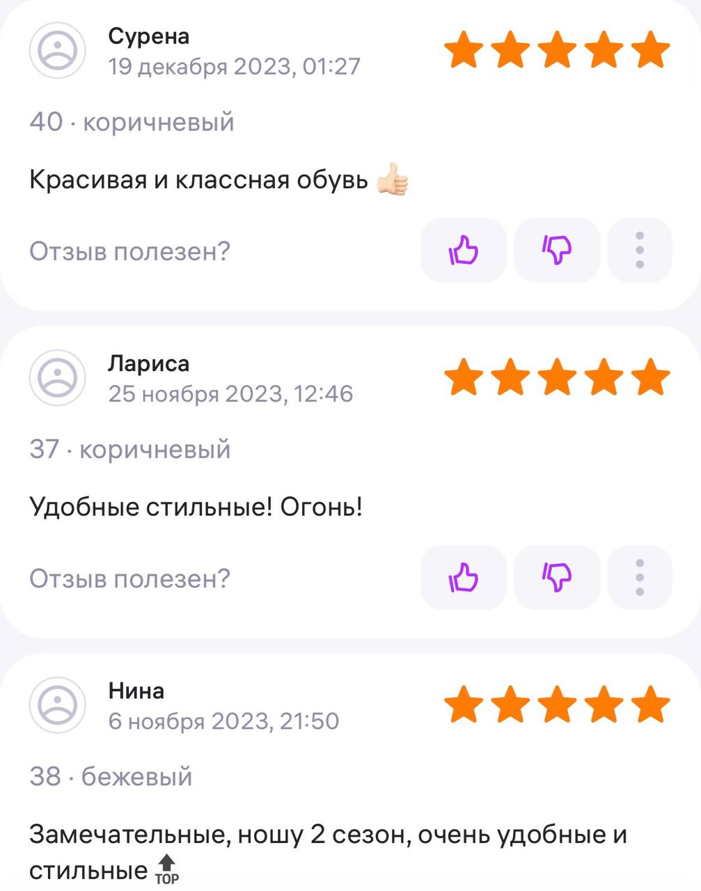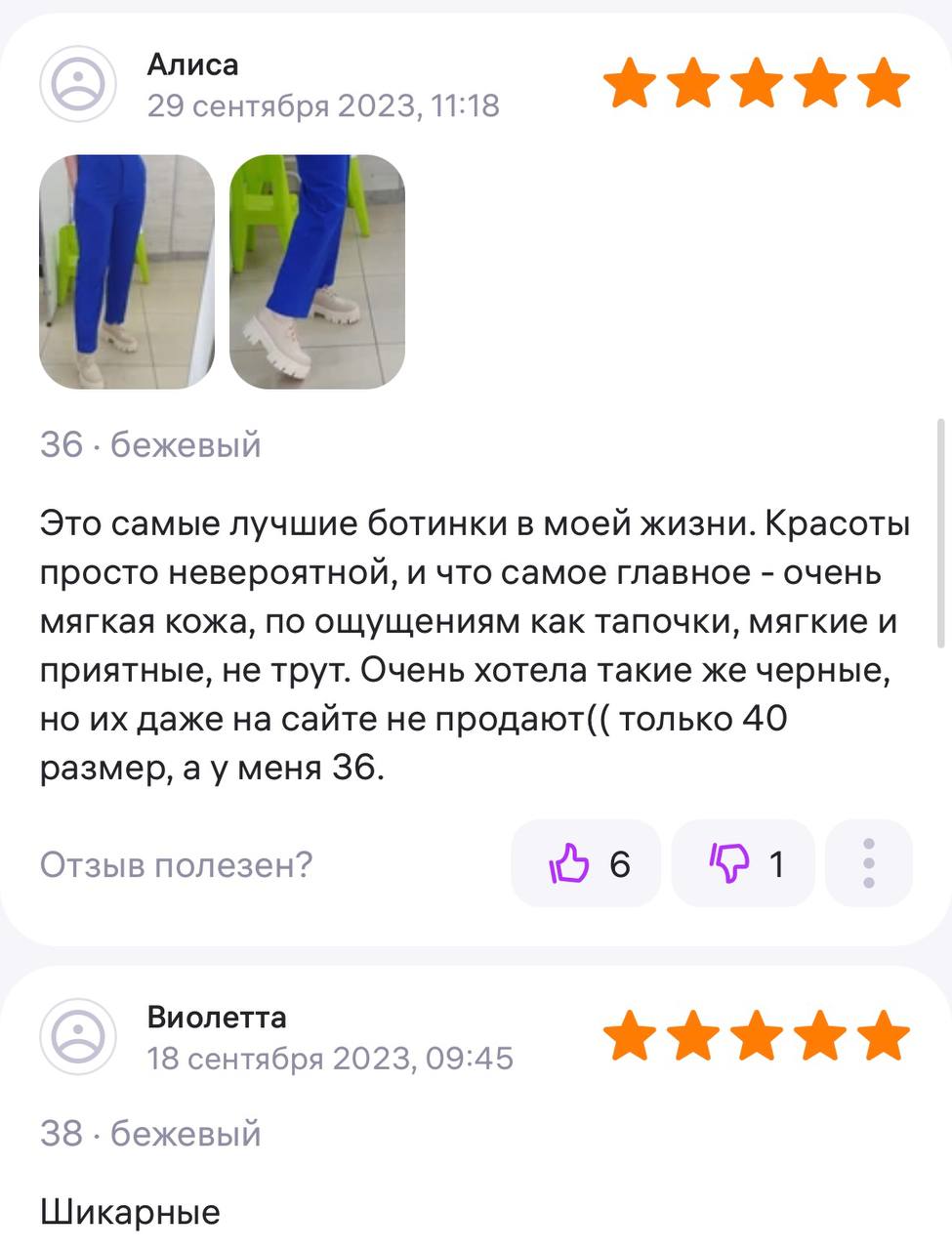 Ботинки хорошие, кажа мягкая, размеру соответствуют, но на пятке пришита заплатка из какой то пленки блесящей и когда первый раз померла она вся сморщилась и такое впечатление что сейчас лопнет. И я думаю со временем так и будет. Если бы не эта заплатка взяла бы удобные и мягкие