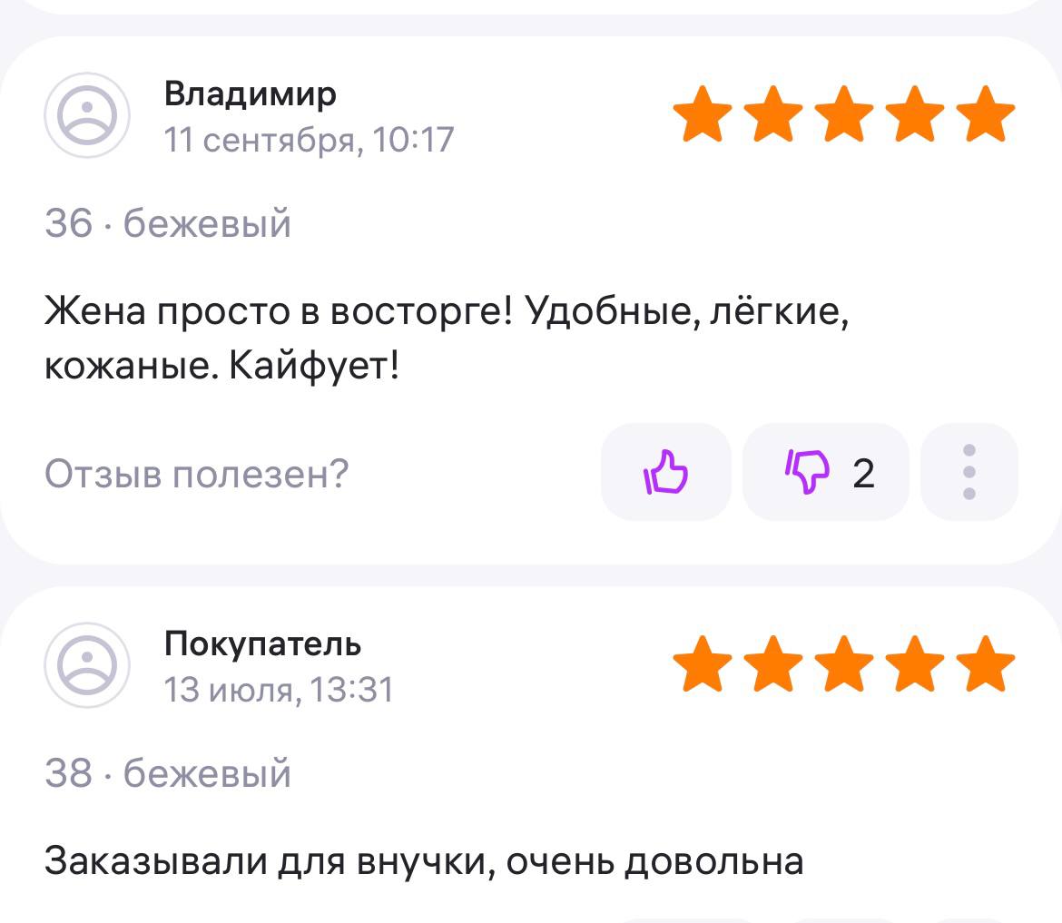 Ботинки хорошие, кажа мягкая, размеру соответствуют, но на пятке пришита заплатка из какой то пленки блесящей и когда первый раз померла она вся сморщилась и такое впечатление что сейчас лопнет. И я думаю со временем так и будет. Если бы не эта заплатка взяла бы удобные и мягкие
