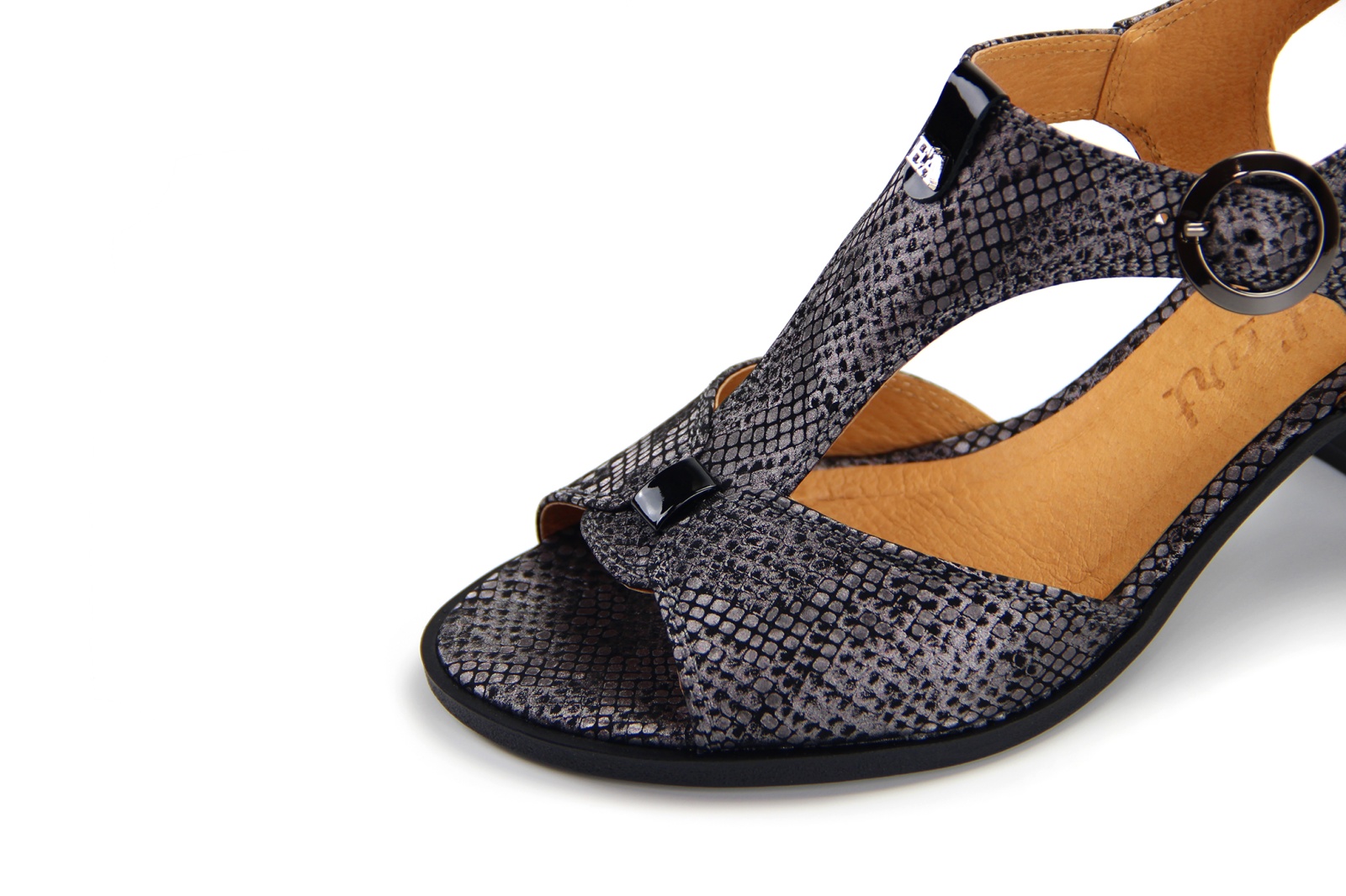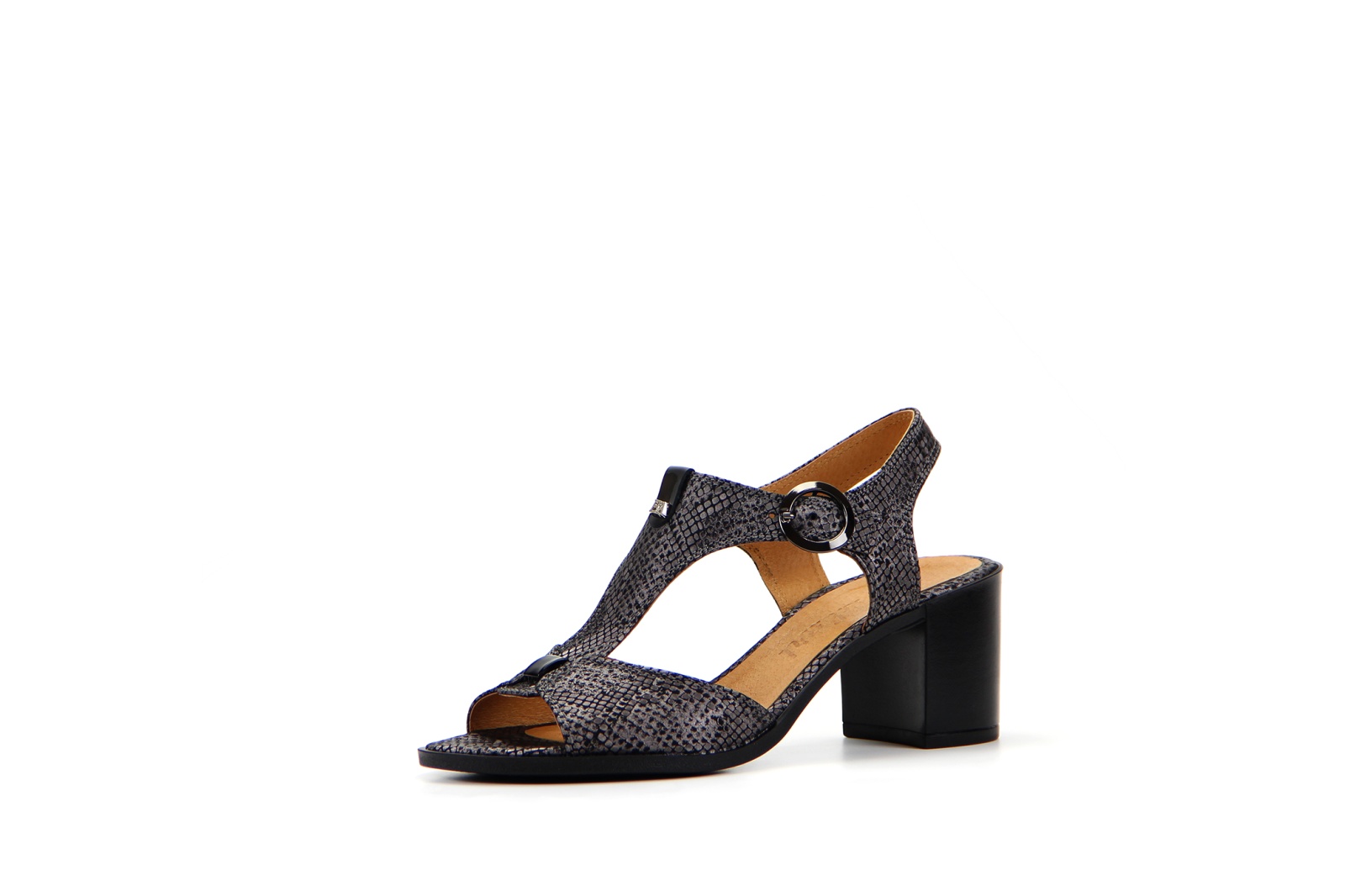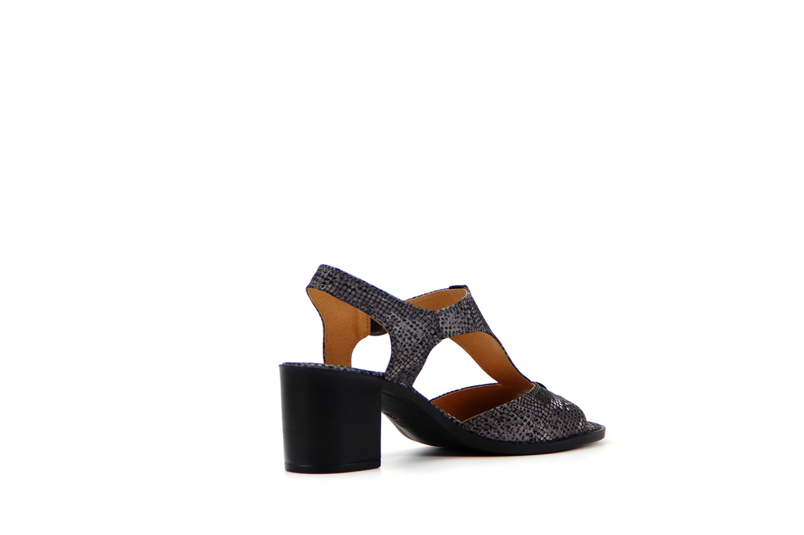 Босоножки кожаные серые с принтом змеи
