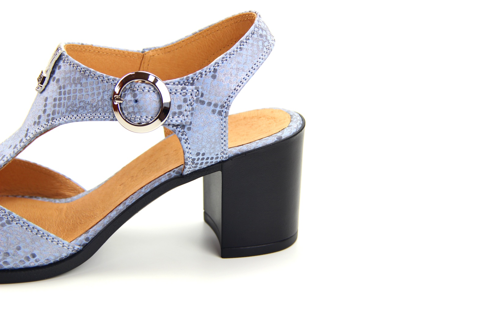 Босоножки кожаные голубые с принтом змеи