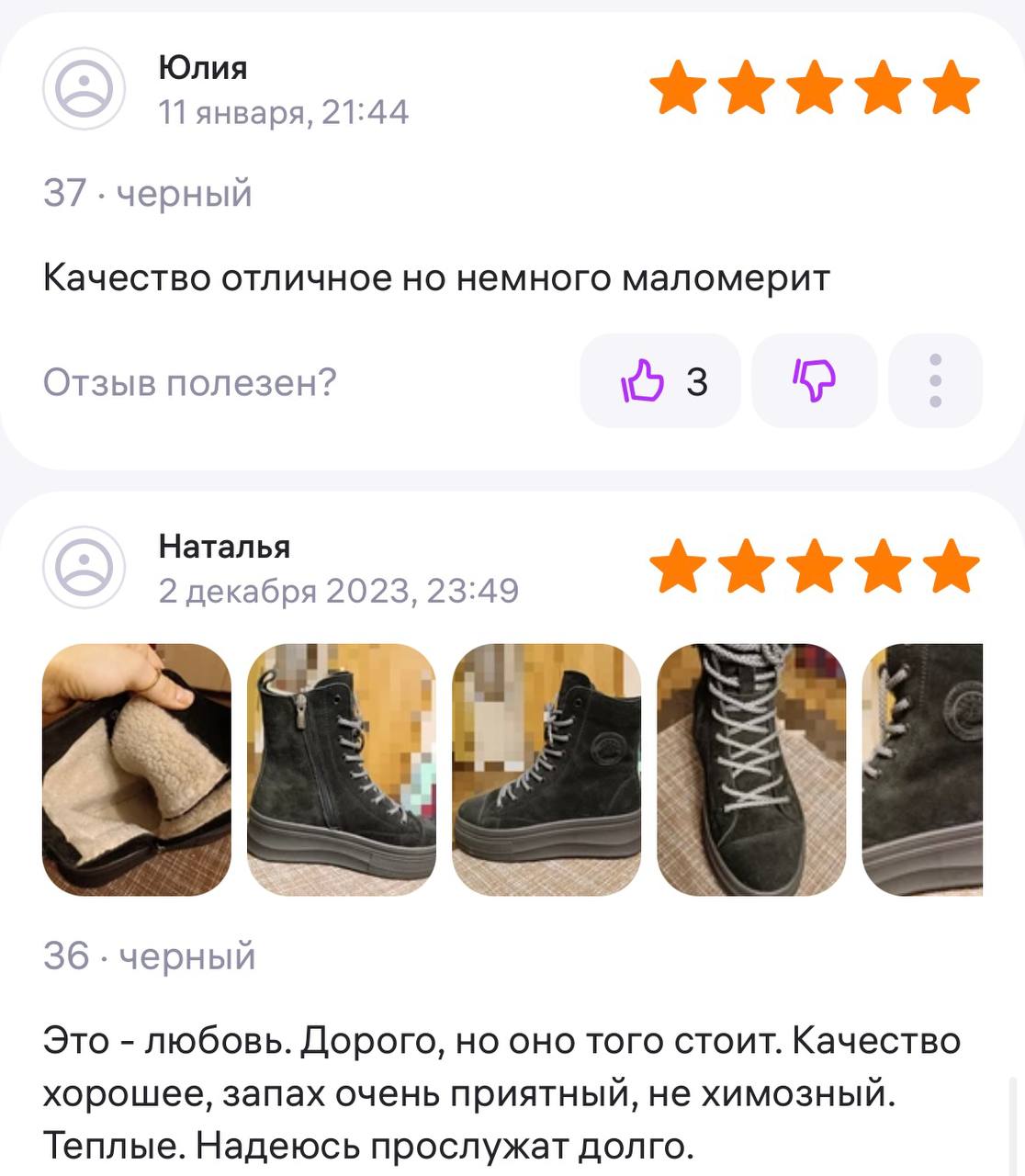 Ботинки хорошие, кажа мягкая, размеру соответствуют, но на пятке пришита заплатка из какой то пленки блесящей и когда первый раз померла она вся сморщилась и такое впечатление что сейчас лопнет. И я думаю со временем так и будет. Если бы не эта заплатка взяла бы удобные и мягкие