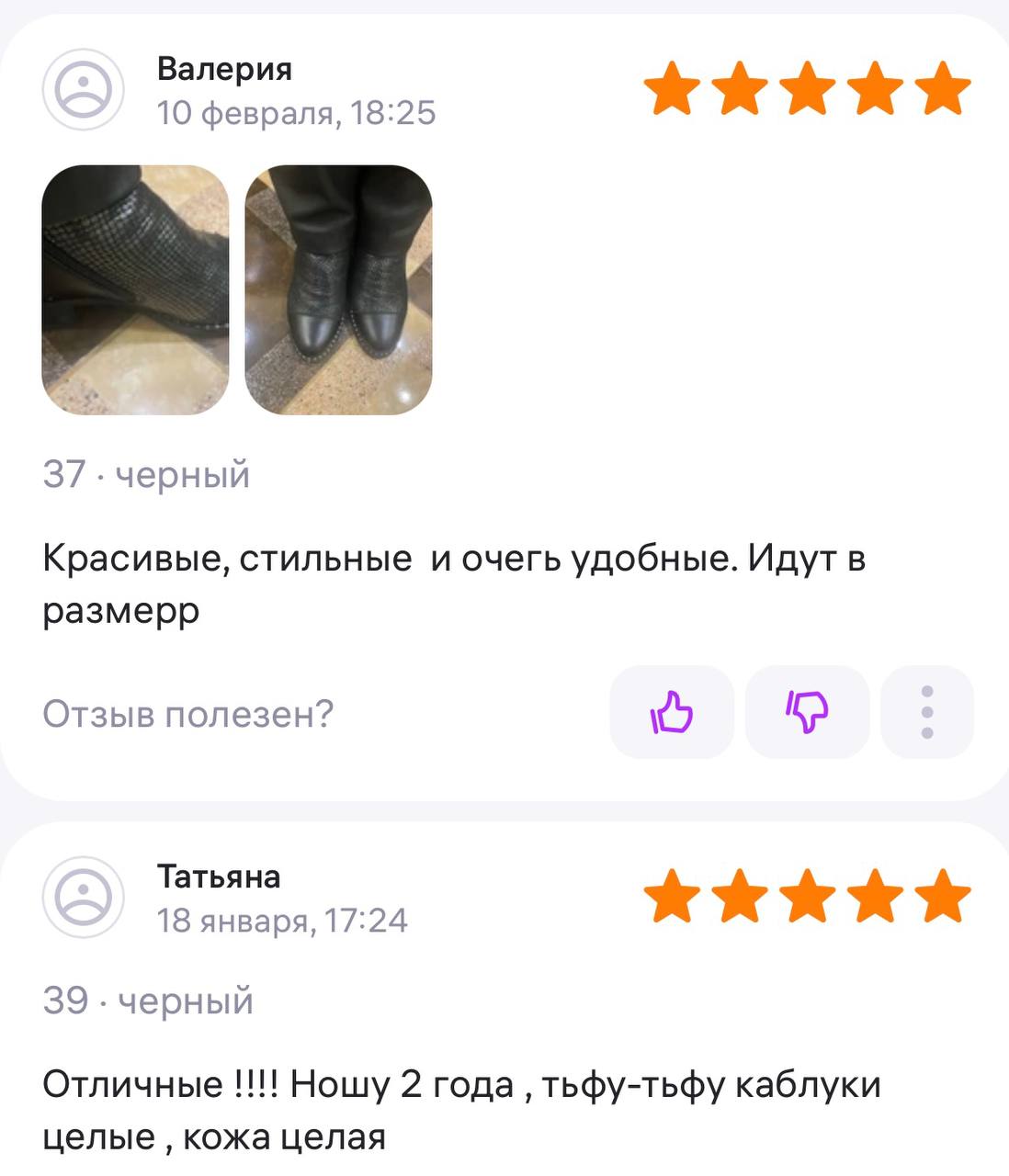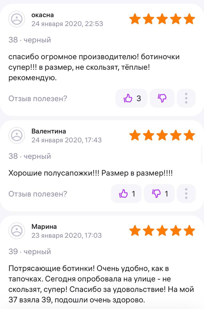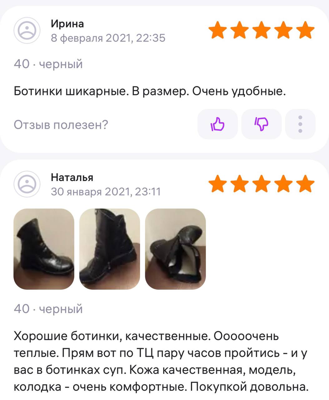 Ботинки хорошие, кажа мягкая, размеру соответствуют, но на пятке пришита заплатка из какой то пленки блесящей и когда первый раз померла она вся сморщилась и такое впечатление что сейчас лопнет. И я думаю со временем так и будет. Если бы не эта заплатка взяла бы удобные и мягкие