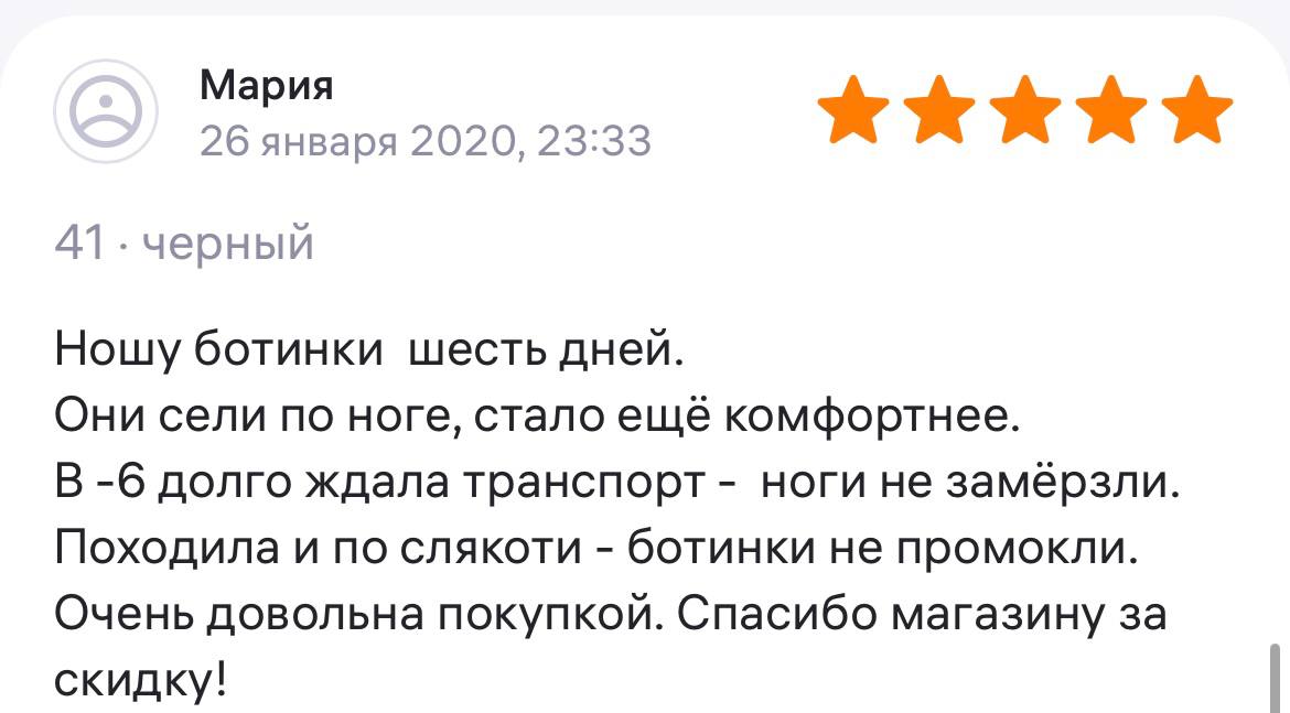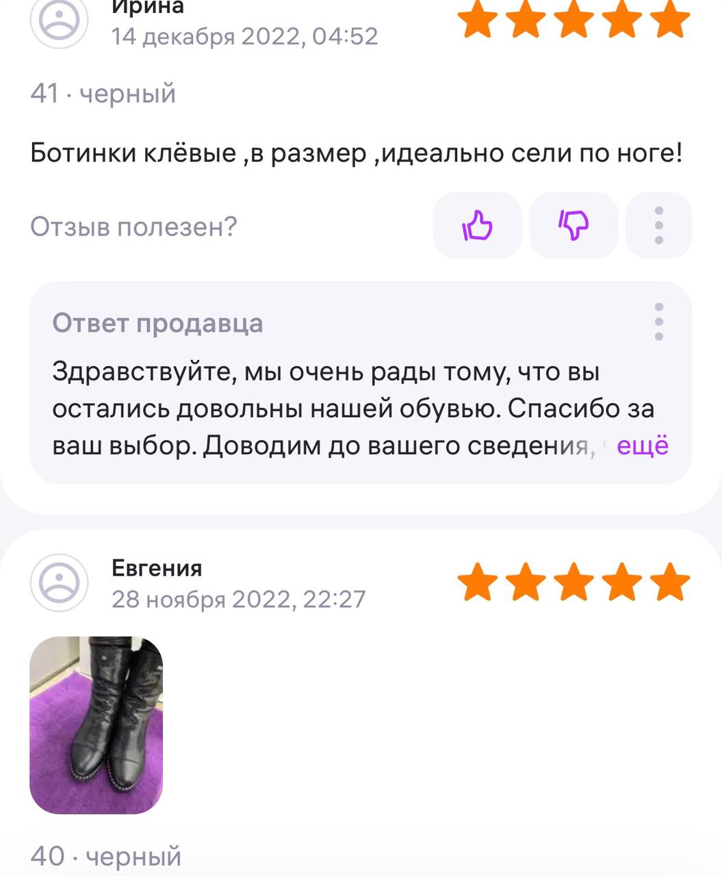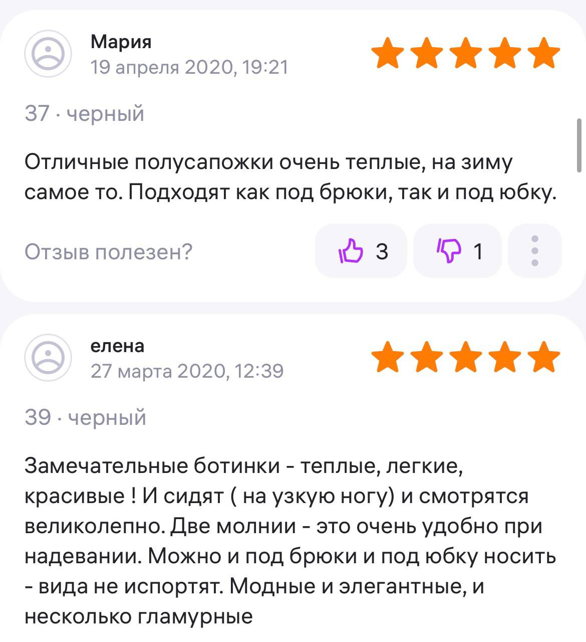 Ботинки хорошие, кажа мягкая, размеру соответствуют, но на пятке пришита заплатка из какой то пленки блесящей и когда первый раз померла она вся сморщилась и такое впечатление что сейчас лопнет. И я думаю со временем так и будет. Если бы не эта заплатка взяла бы удобные и мягкие