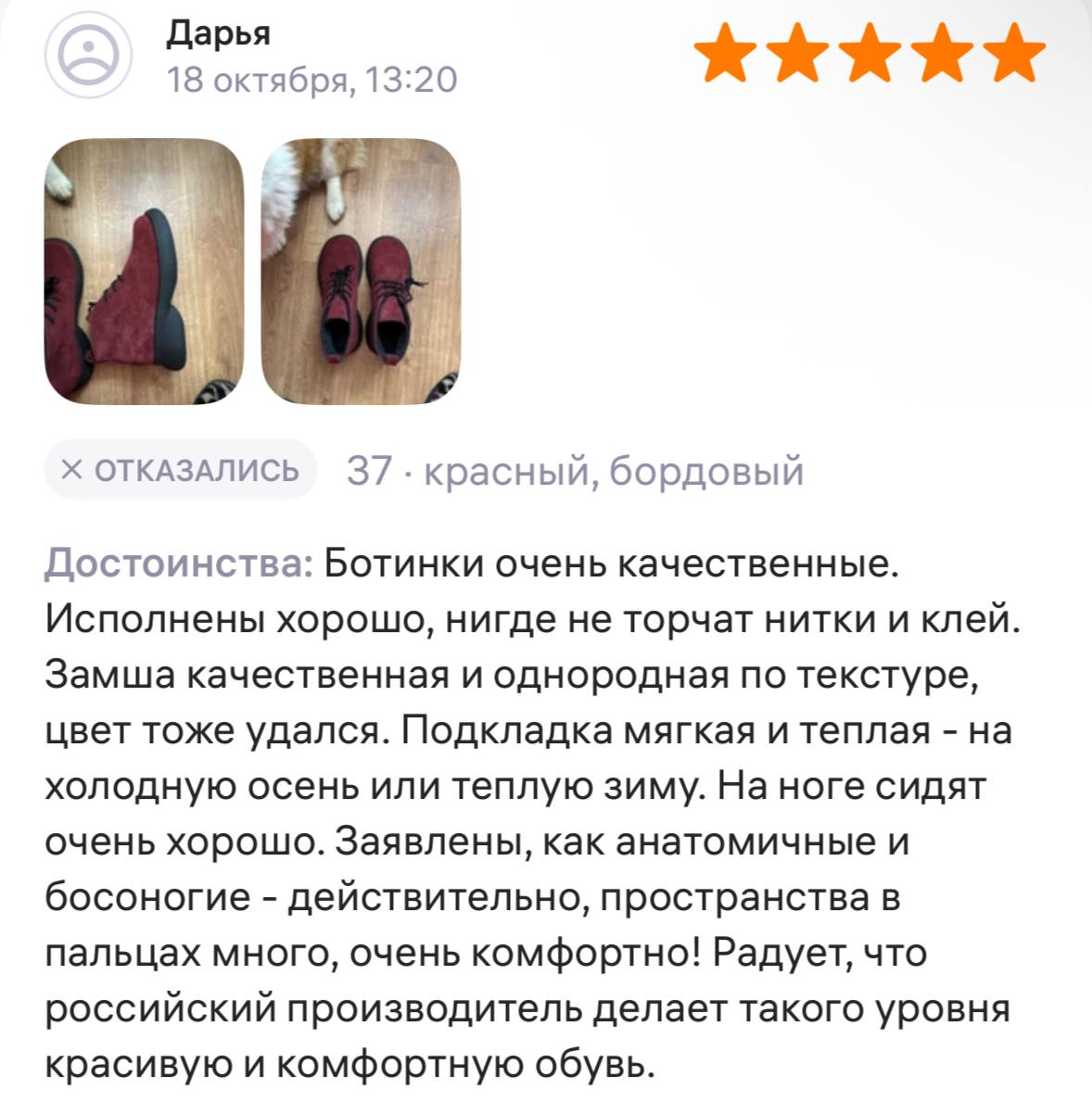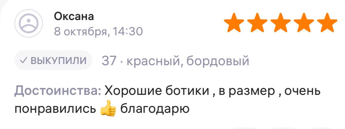 Ботинки хорошие, кажа мягкая, размеру соответствуют, но на пятке пришита заплатка из какой то пленки блесящей и когда первый раз померла она вся сморщилась и такое впечатление что сейчас лопнет. И я думаю со временем так и будет. Если бы не эта заплатка взяла бы удобные и мягкие