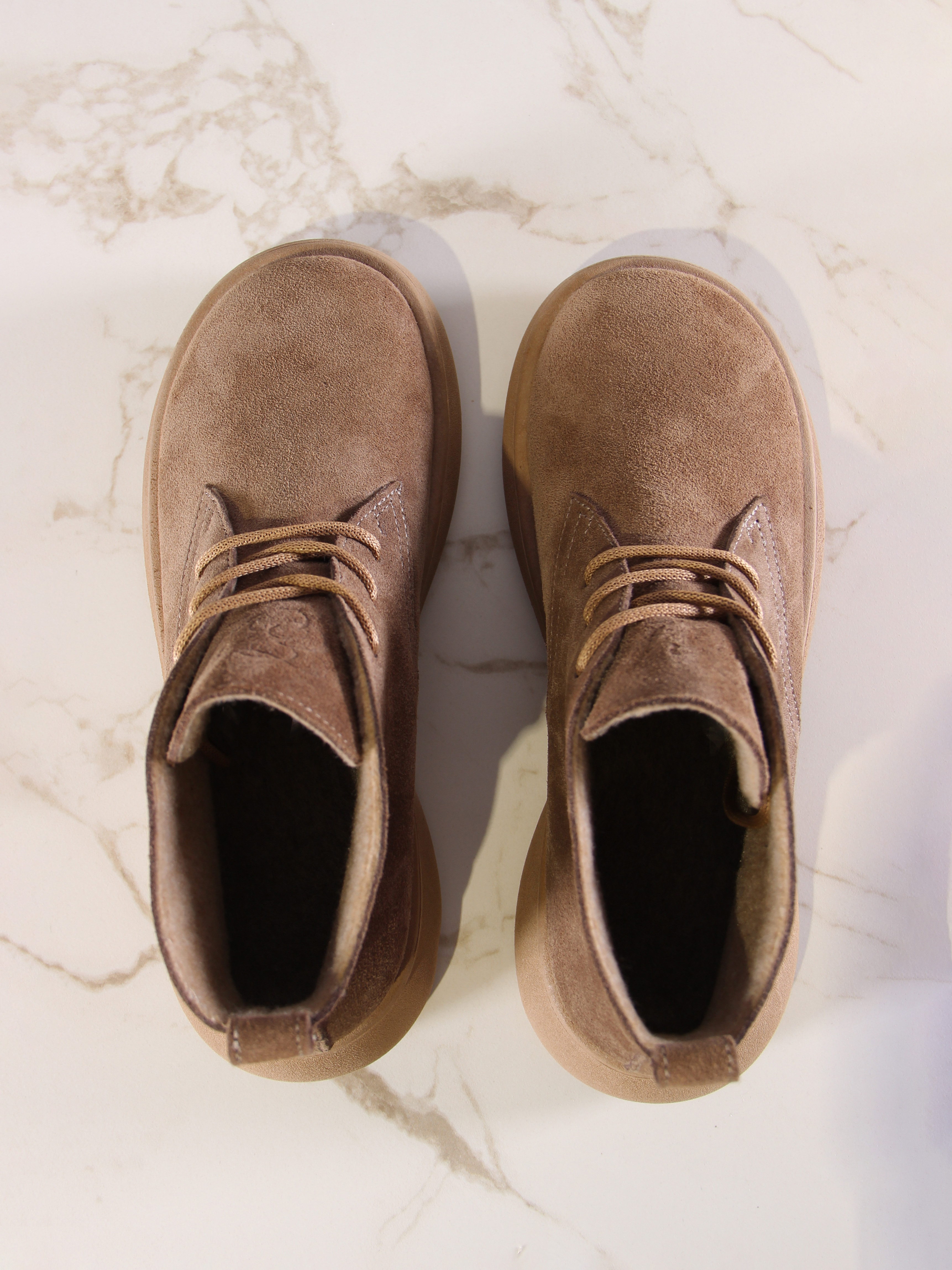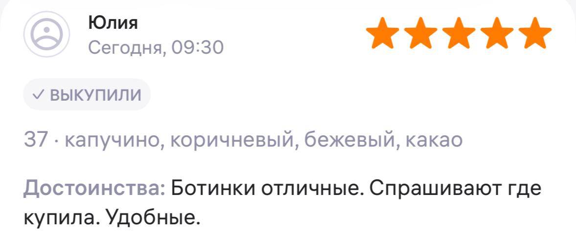 Ботинки хорошие, кажа мягкая, размеру соответствуют, но на пятке пришита заплатка из какой то пленки блесящей и когда первый раз померла она вся сморщилась и такое впечатление что сейчас лопнет. И я думаю со временем так и будет. Если бы не эта заплатка взяла бы удобные и мягкие