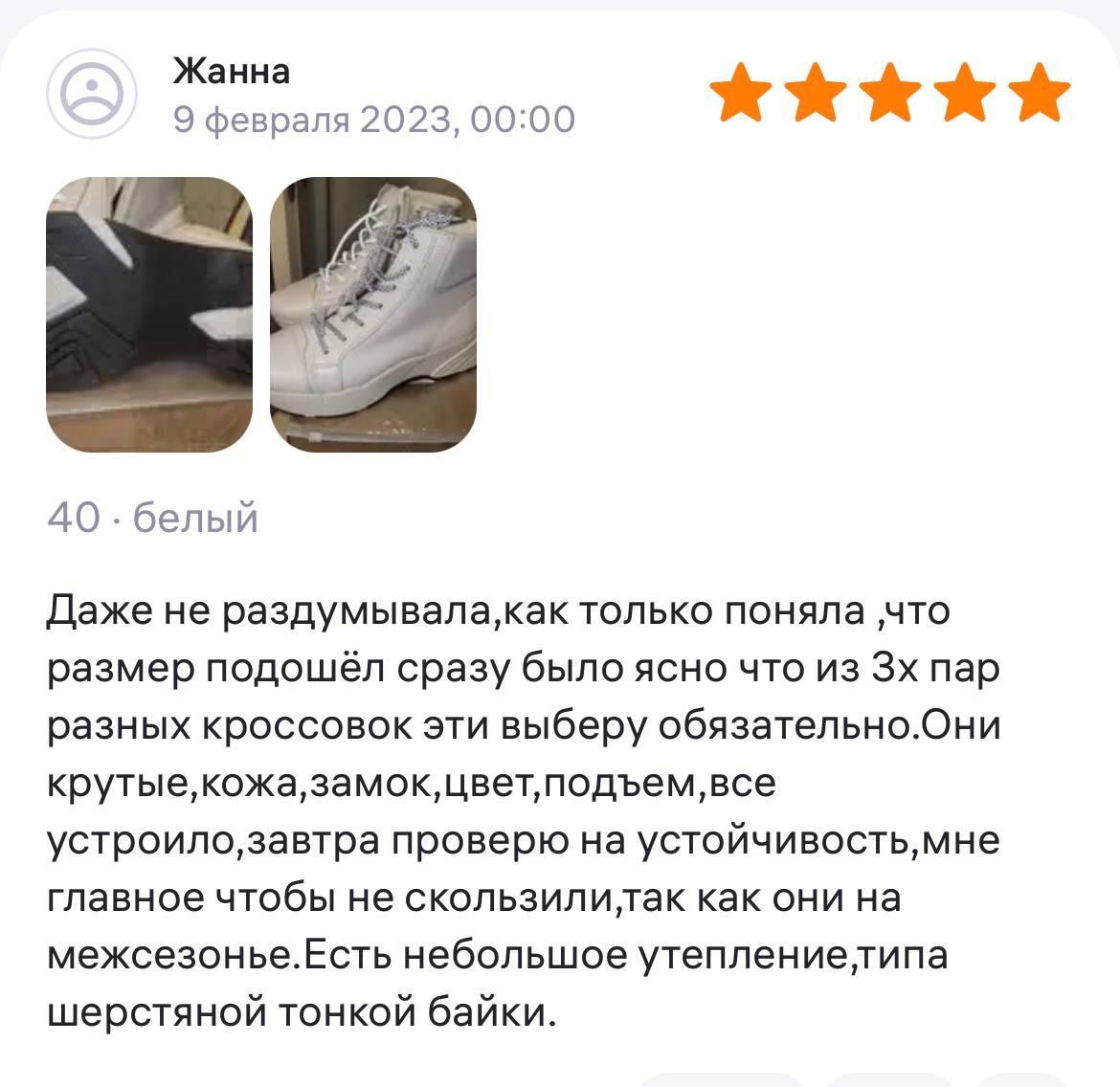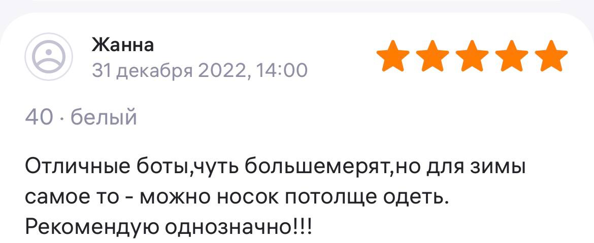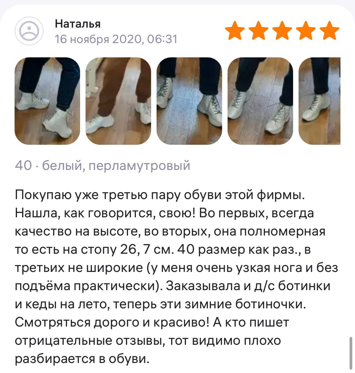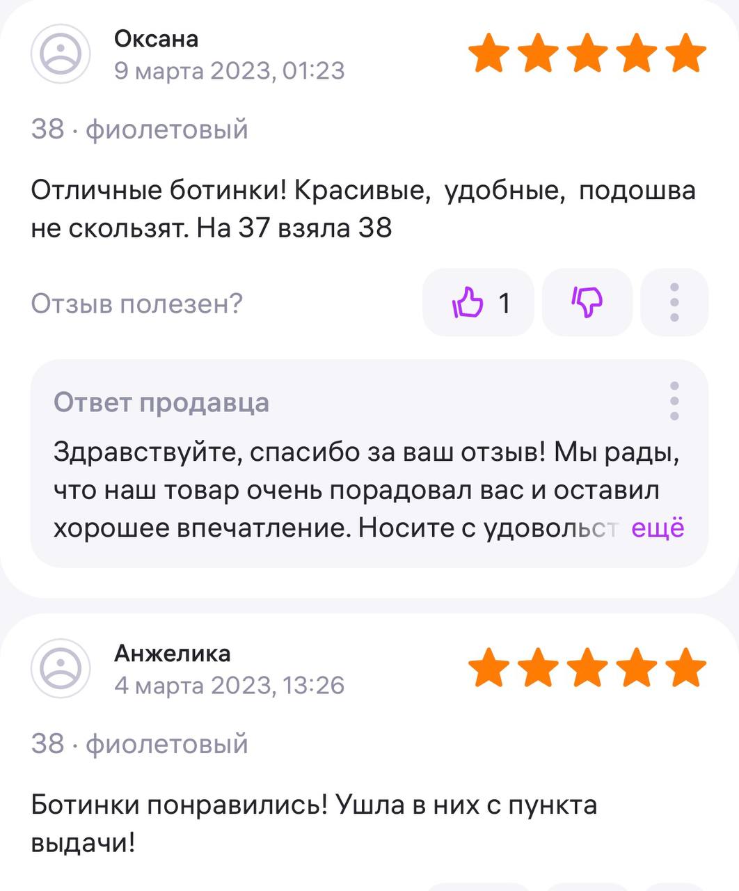 Ботинки хорошие, кажа мягкая, размеру соответствуют, но на пятке пришита заплатка из какой то пленки блесящей и когда первый раз померла она вся сморщилась и такое впечатление что сейчас лопнет. И я думаю со временем так и будет. Если бы не эта заплатка взяла бы удобные и мягкие