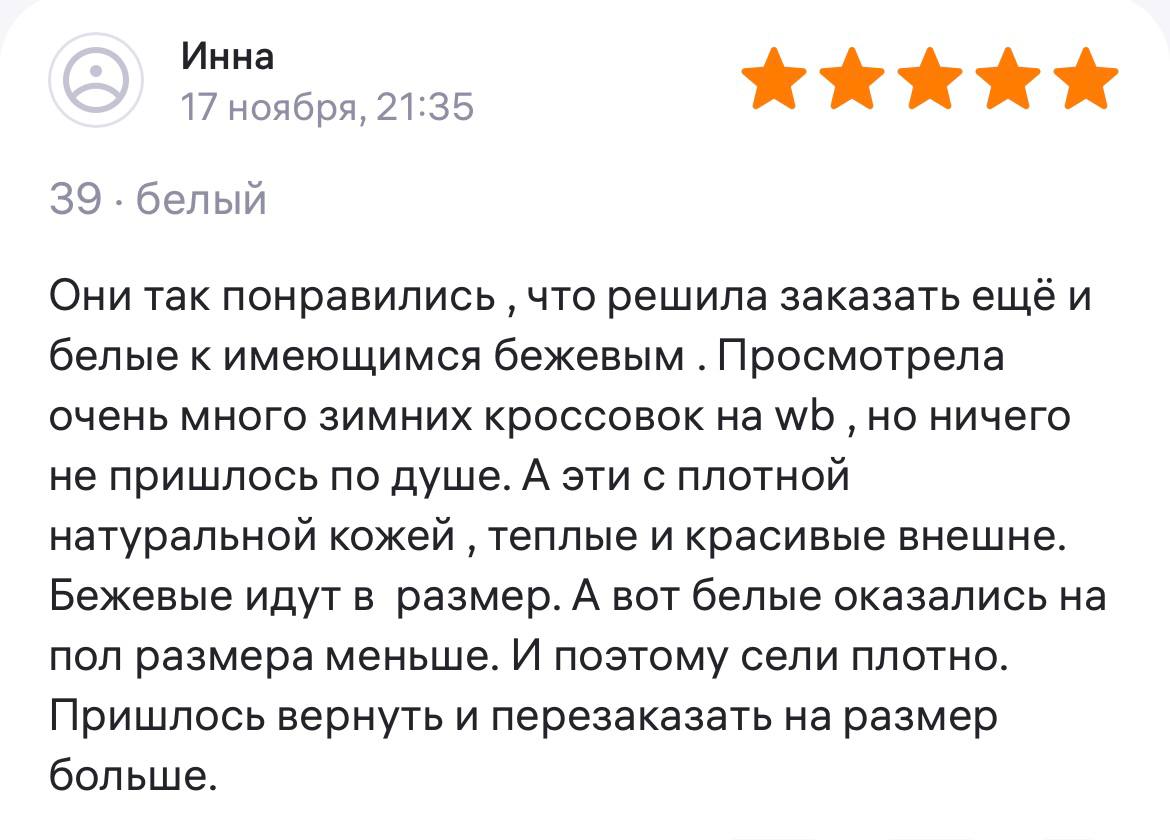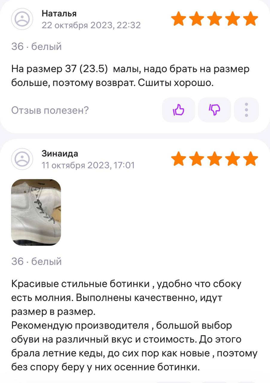 Ботинки хорошие, кажа мягкая, размеру соответствуют, но на пятке пришита заплатка из какой то пленки блесящей и когда первый раз померла она вся сморщилась и такое впечатление что сейчас лопнет. И я думаю со временем так и будет. Если бы не эта заплатка взяла бы удобные и мягкие