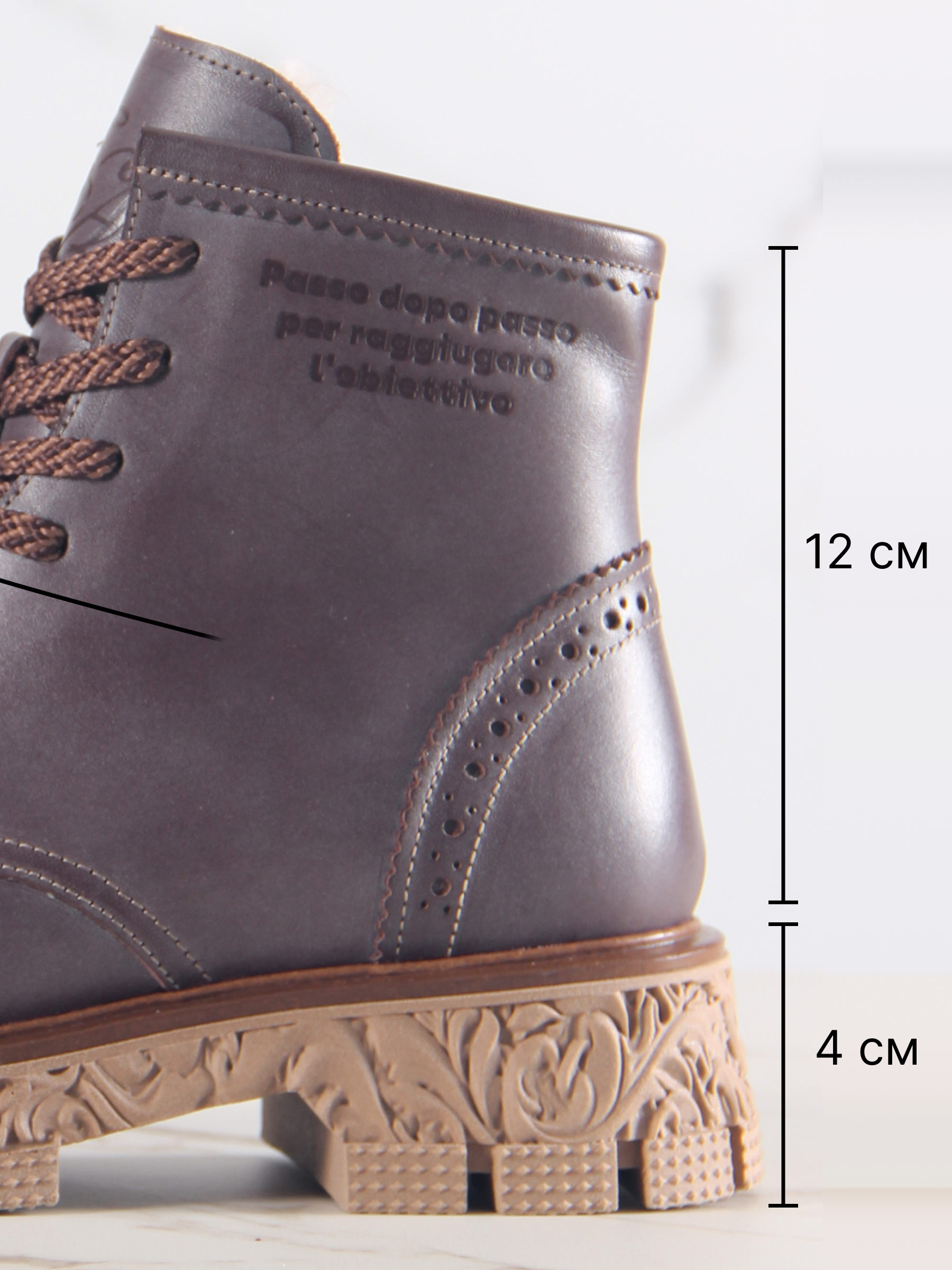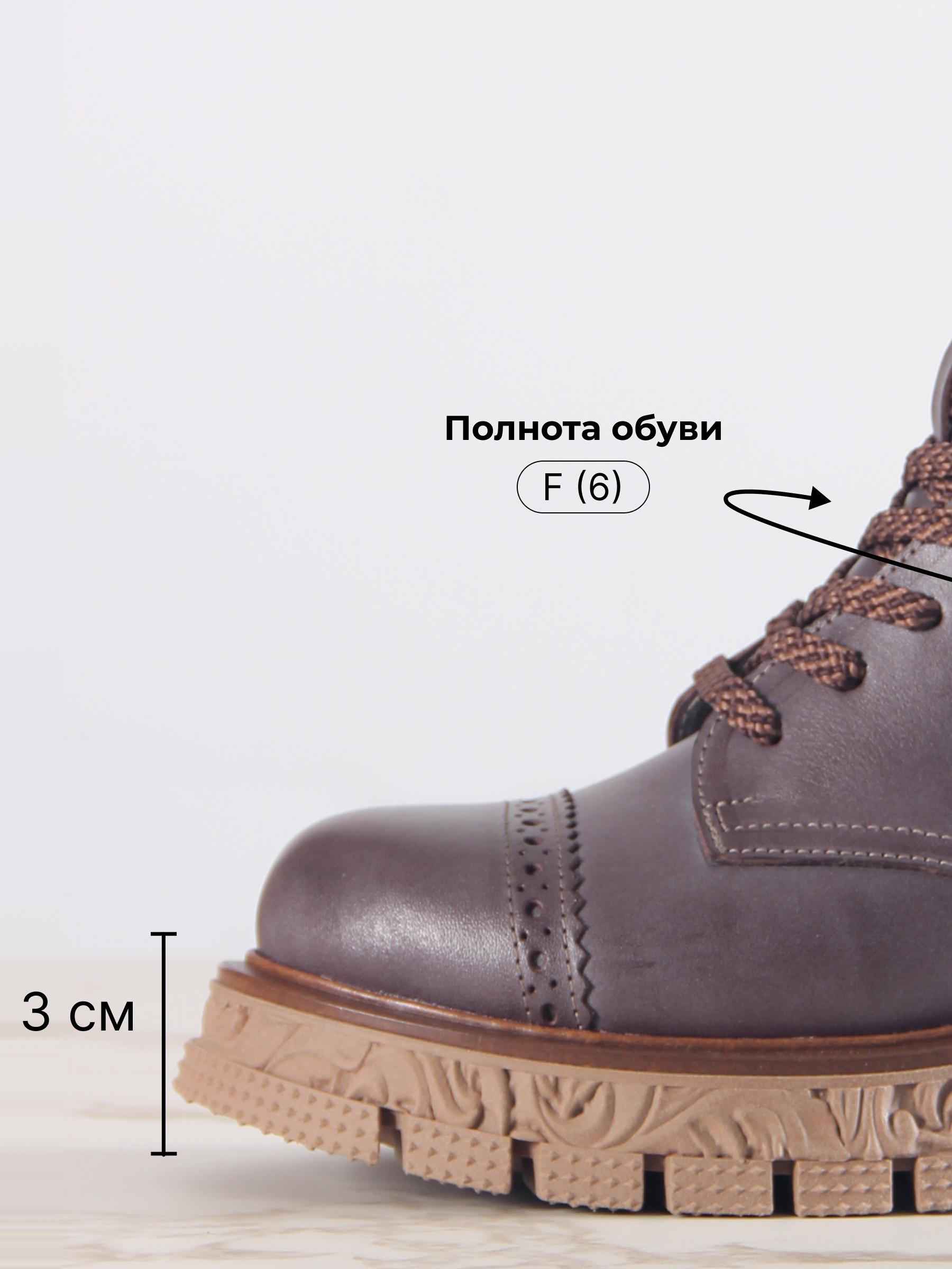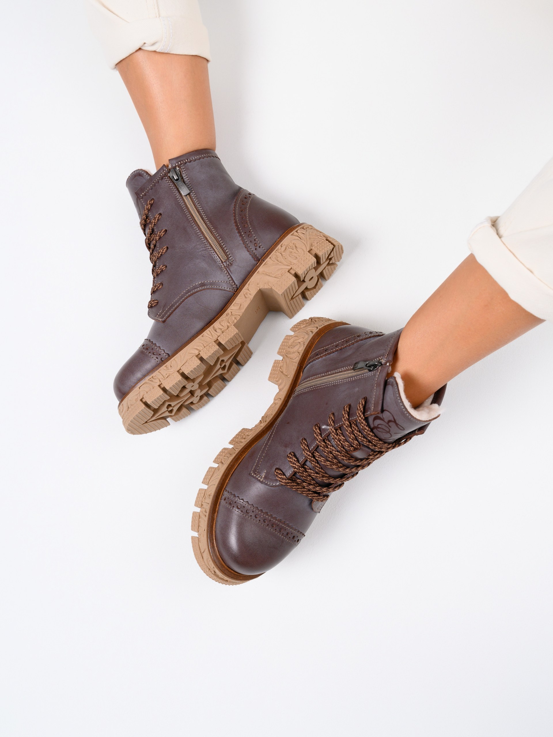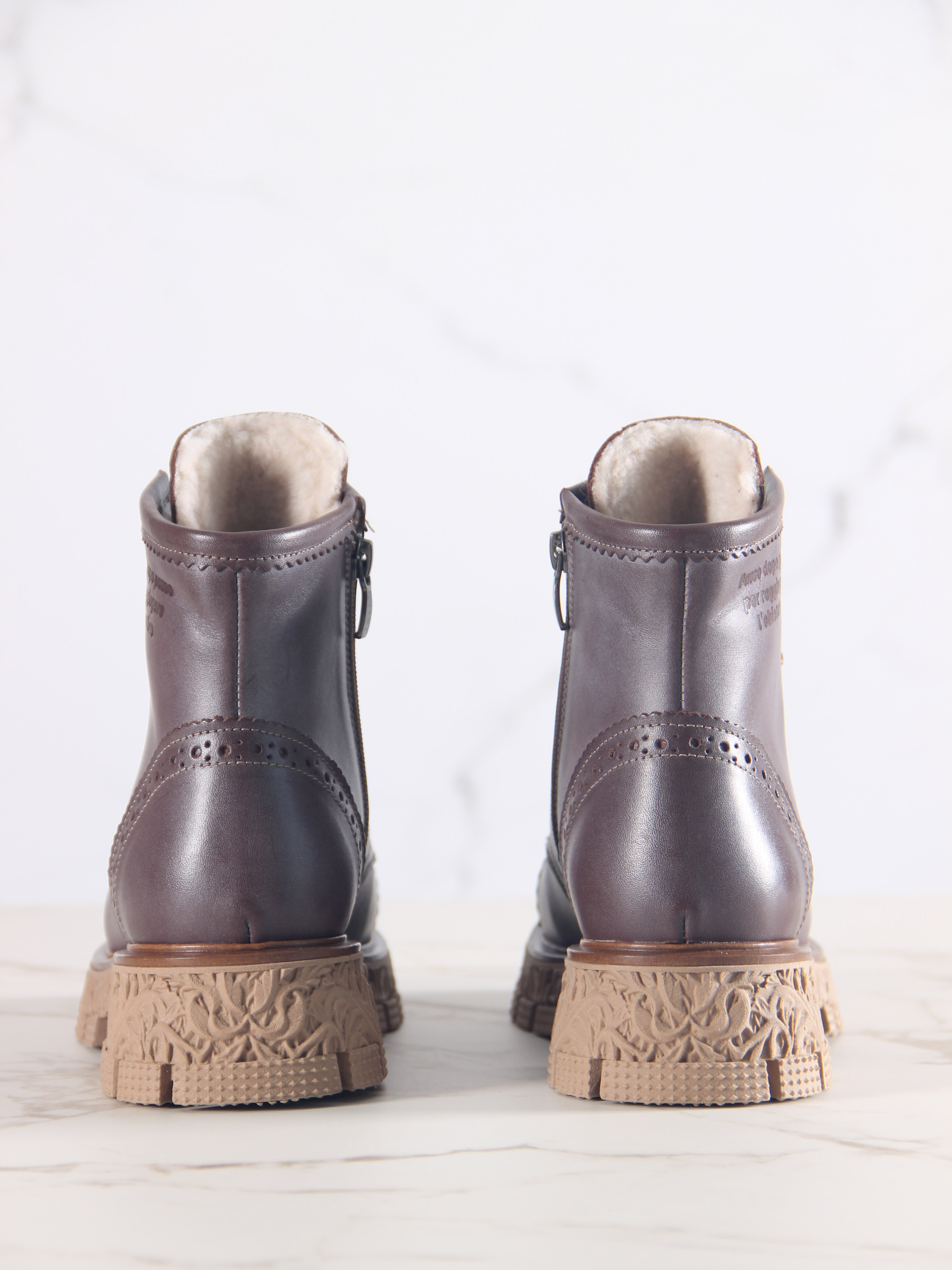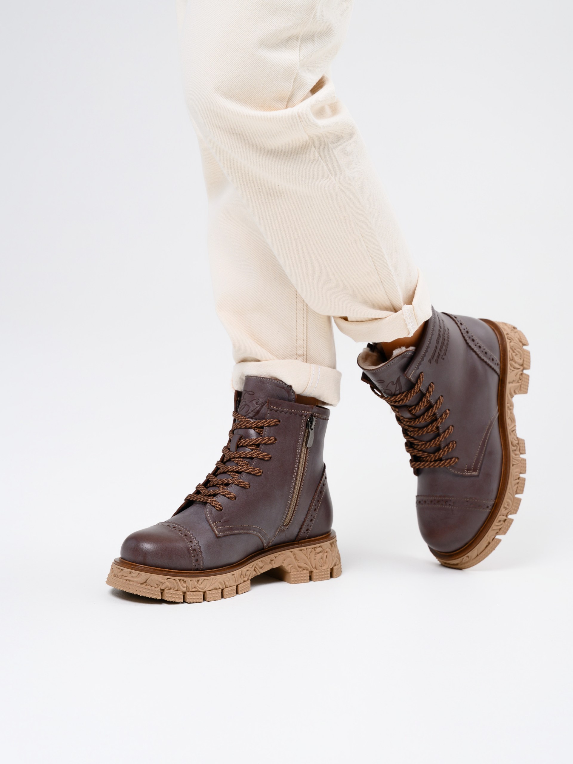 В этих ботинках использована кожа Вакс с восковым притиром. Кожа имеется у нас разных цветов, но сейчас предлагаем рассмотреть коричневый. Изначально кожа имеет белёсое покрытие (напыление), под которым даже не всегда просматривается основной цвет. Снимается это напыление только на готовом изделии, путём шлифовки обуви машинным способом, с применением щётки с натуральным ворсом и пчелиного воска. Получается пишущий эффект, неоднородный и всегда разный, каждая пара обуви становится уникальной, с неповторимым рисунком. Но что общее точно есть у любой пары обуви из нашей кожи- это красивая переливающаяся фактура и благородный вид, который сделает ваш образ неповторимым и притягивающим взгляды!