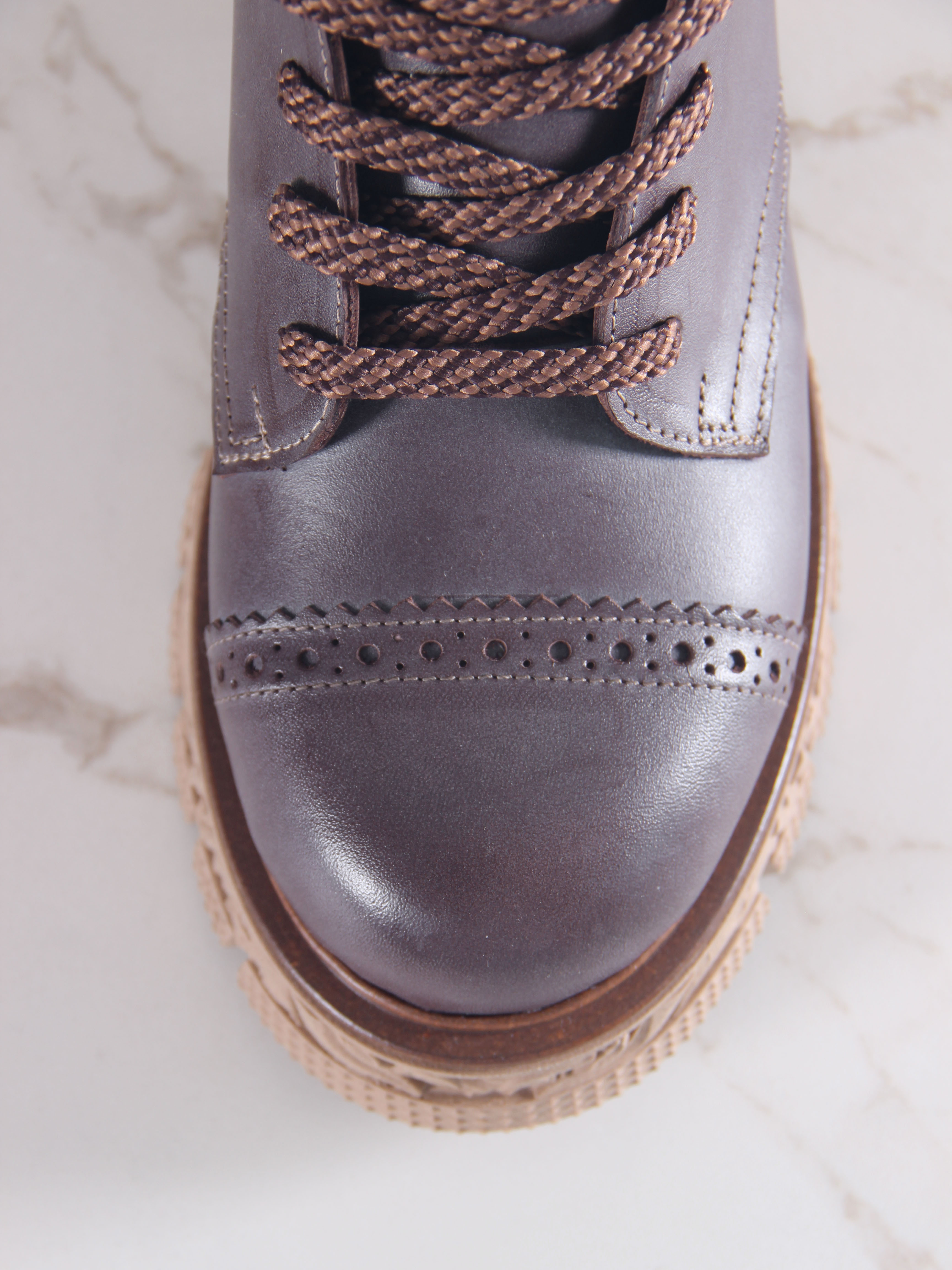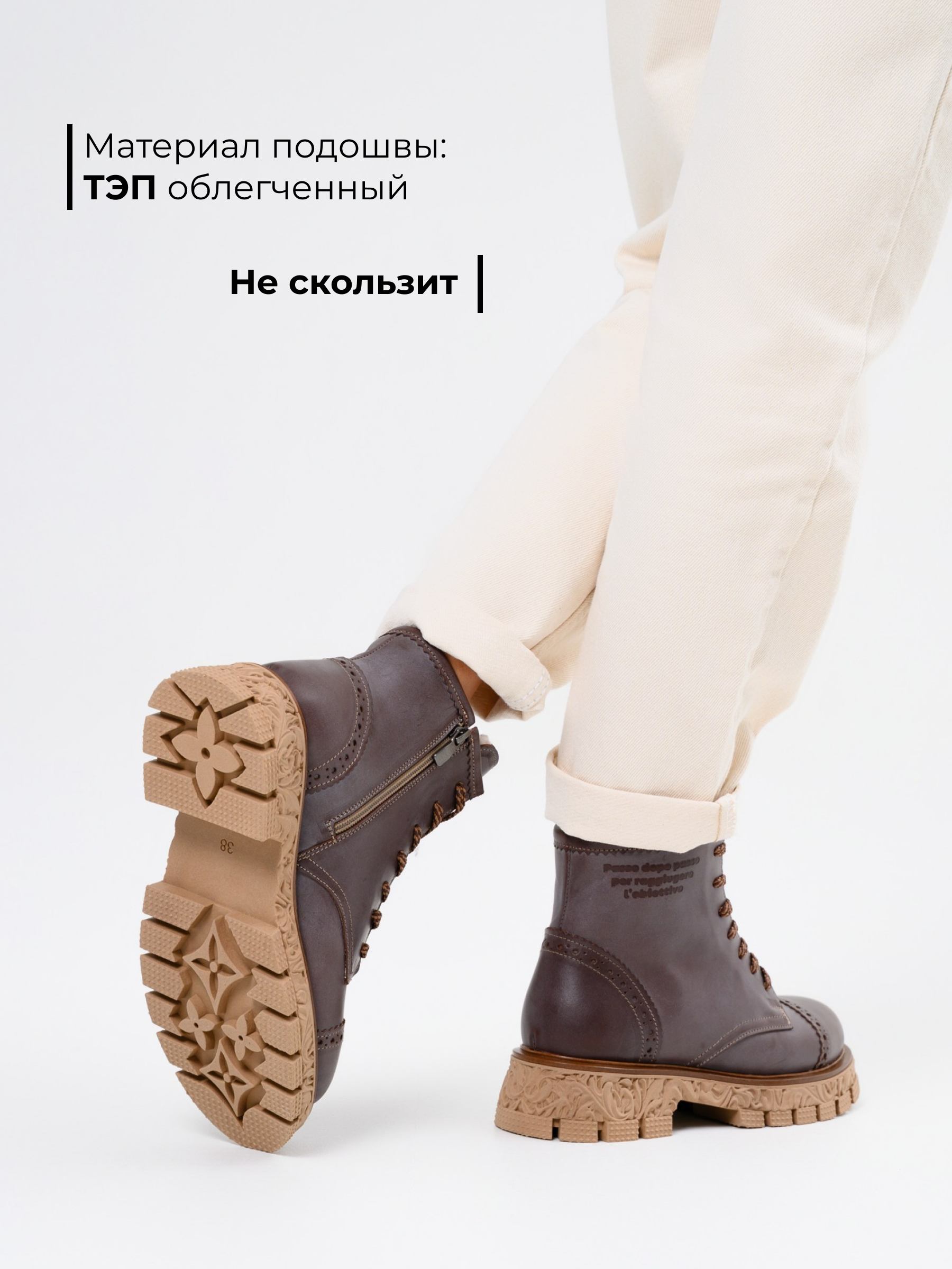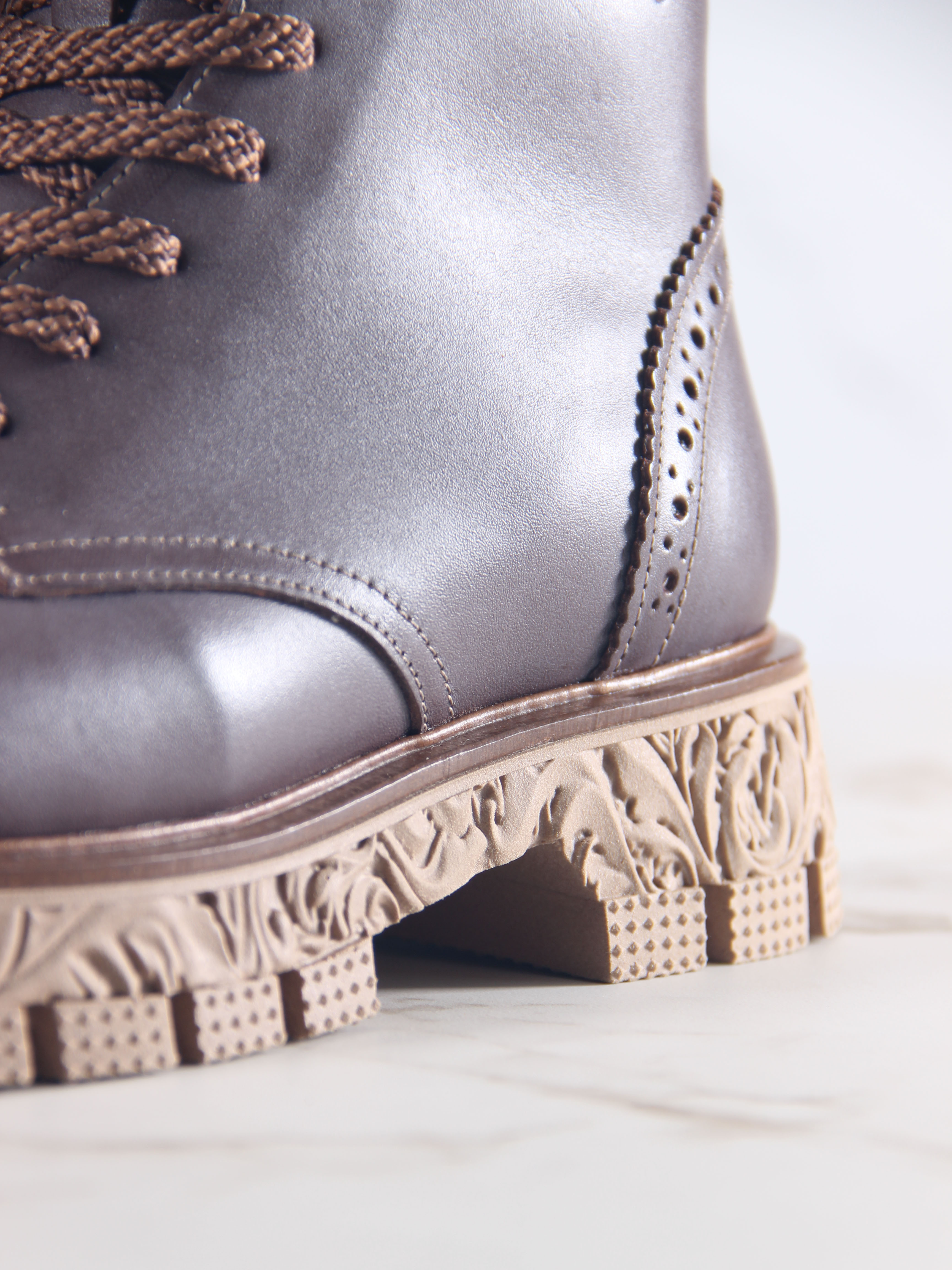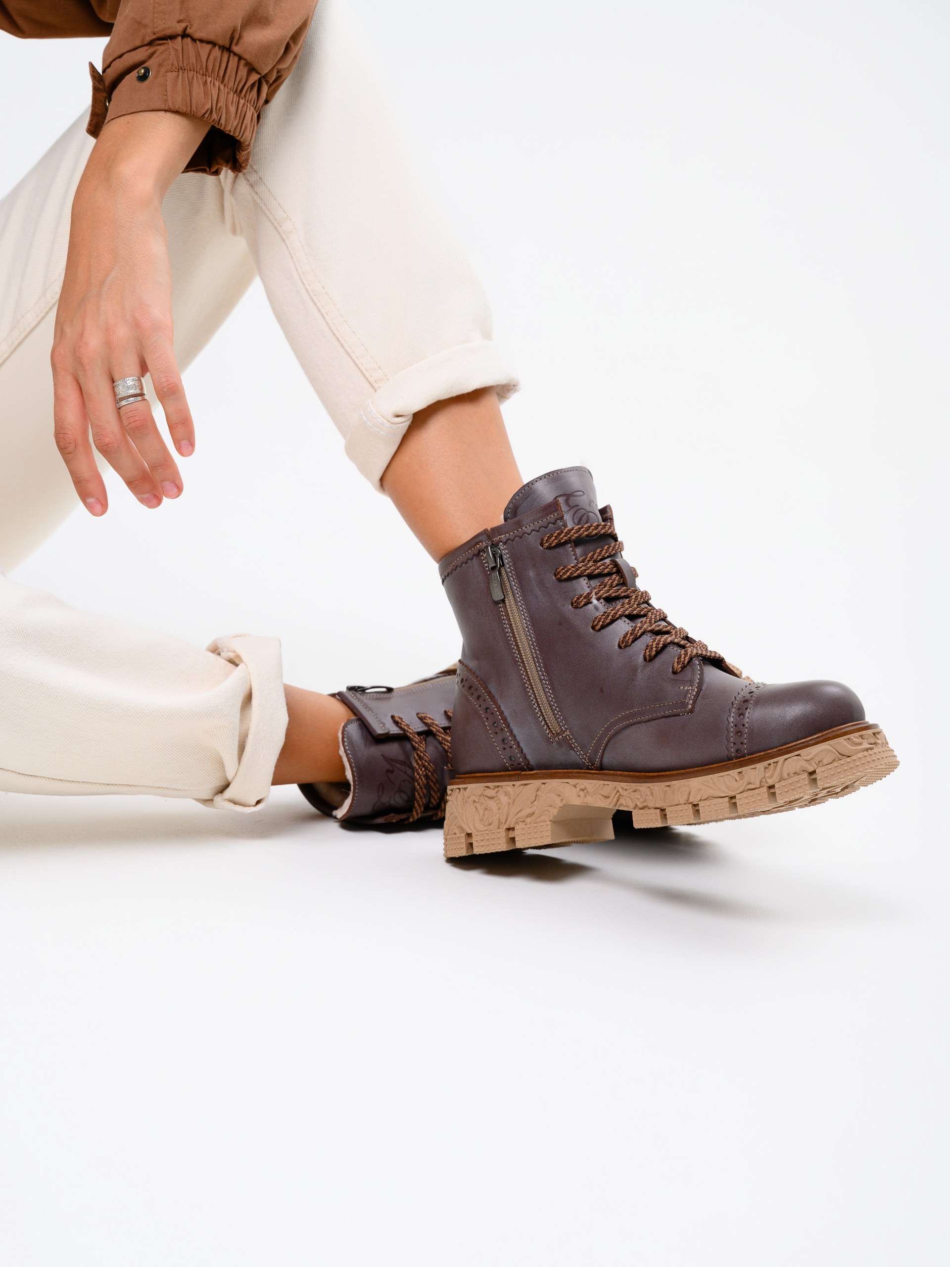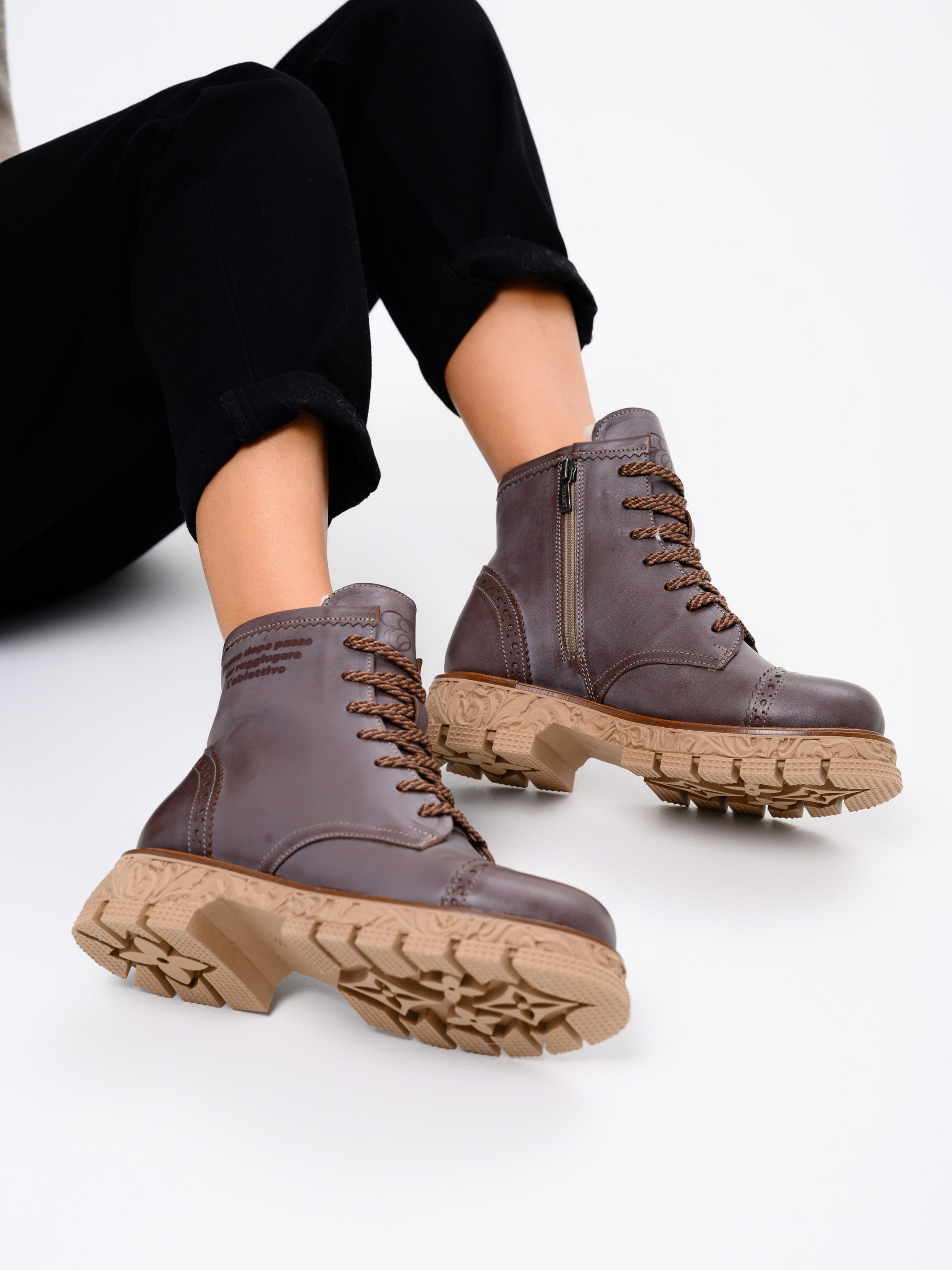В этих ботинках использована кожа Вакс с восковым притиром. Кожа имеется у нас разных цветов, но сейчас предлагаем рассмотреть коричневый. Изначально кожа имеет белёсое покрытие (напыление), под которым даже не всегда просматривается основной цвет. Снимается это напыление только на готовом изделии, путём шлифовки обуви машинным способом, с применением щётки с натуральным ворсом и пчелиного воска. Получается пишущий эффект, неоднородный и всегда разный, каждая пара обуви становится уникальной, с неповторимым рисунком. Но что общее точно есть у любой пары обуви из нашей кожи- это красивая переливающаяся фактура и благородный вид, который сделает ваш образ неповторимым и притягивающим взгляды!