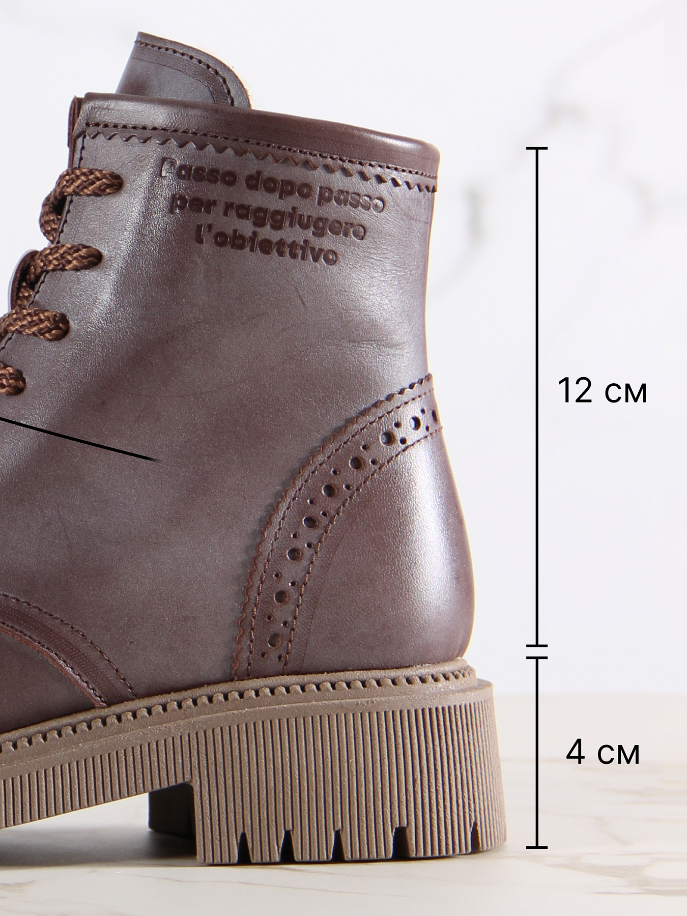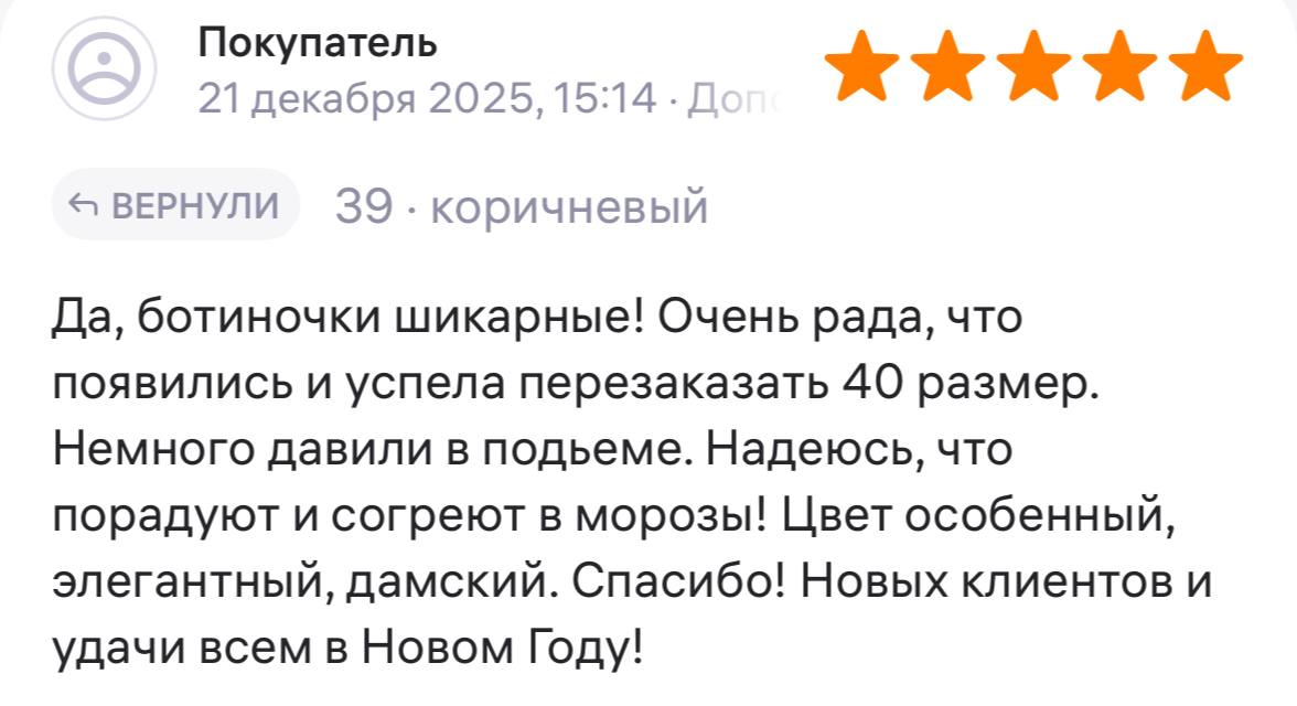 Ботинки хорошие, кажа мягкая, размеру соответствуют, но на пятке пришита заплатка из какой то пленки блесящей и когда первый раз померла она вся сморщилась и такое впечатление что сейчас лопнет. И я думаю со временем так и будет. Если бы не эта заплатка взяла бы удобные и мягкие