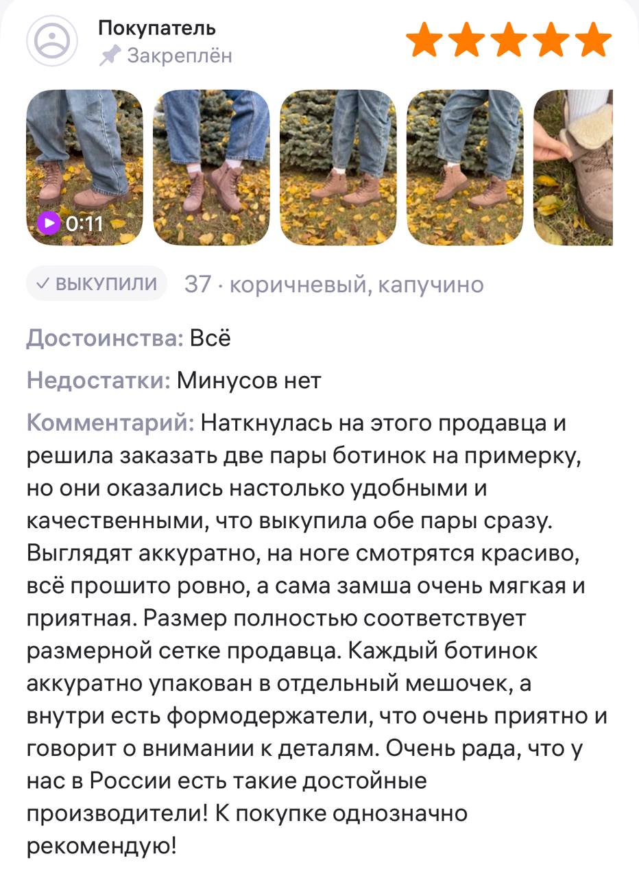 Ботинки хорошие, кажа мягкая, размеру соответствуют, но на пятке пришита заплатка из какой то пленки блесящей и когда первый раз померла она вся сморщилась и такое впечатление что сейчас лопнет. И я думаю со временем так и будет. Если бы не эта заплатка взяла бы удобные и мягкие