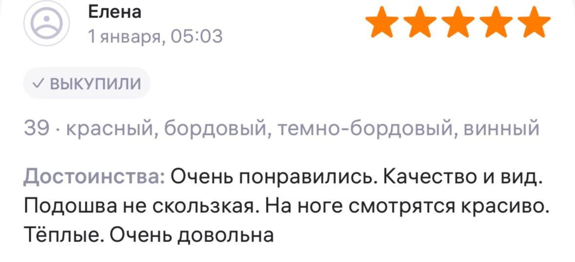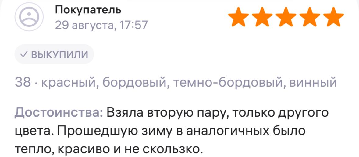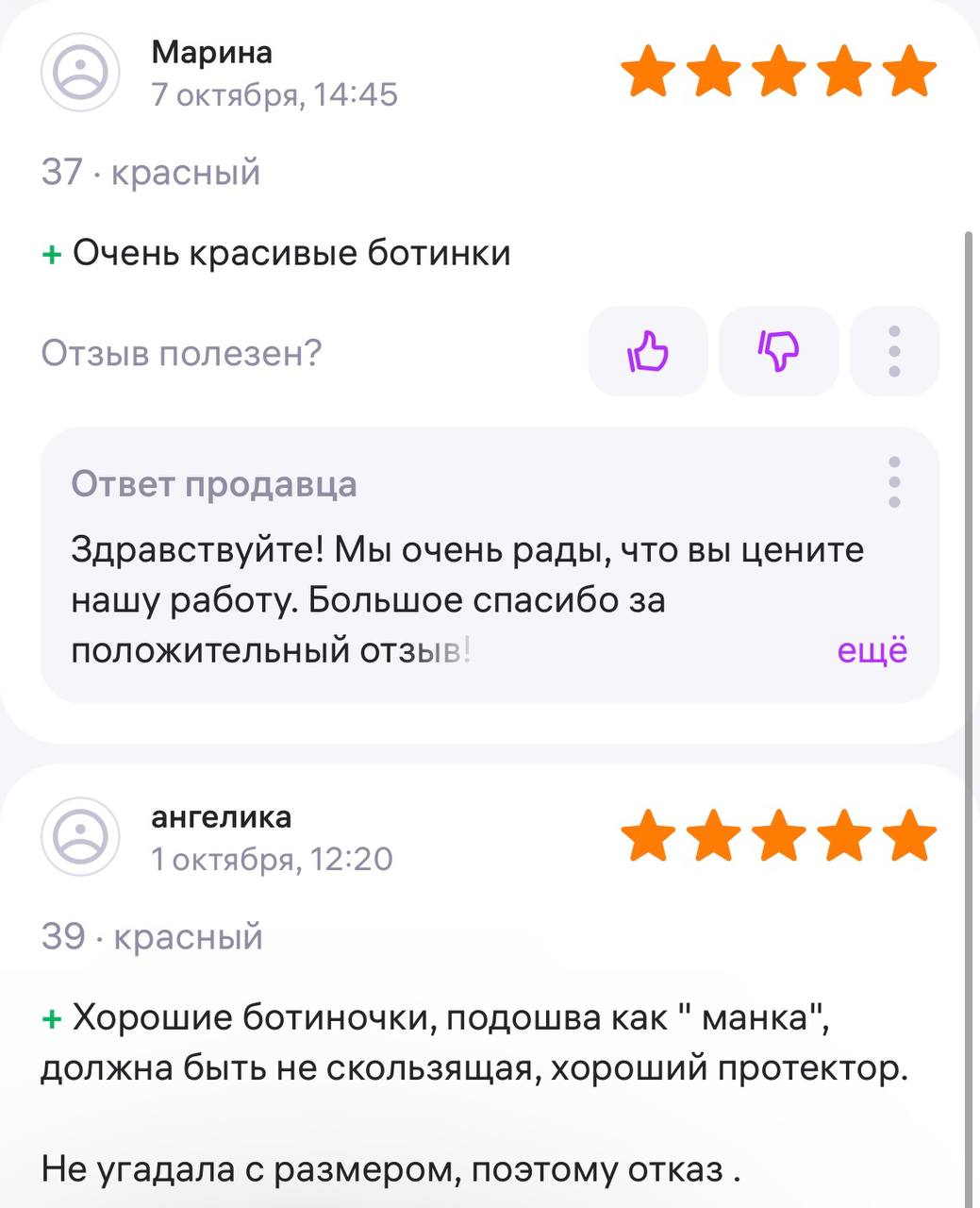 Ботинки хорошие, кажа мягкая, размеру соответствуют, но на пятке пришита заплатка из какой то пленки блесящей и когда первый раз померла она вся сморщилась и такое впечатление что сейчас лопнет. И я думаю со временем так и будет. Если бы не эта заплатка взяла бы удобные и мягкие