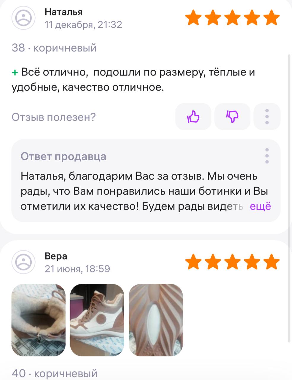 Ботинки хорошие, кажа мягкая, размеру соответствуют, но на пятке пришита заплатка из какой то пленки блесящей и когда первый раз померла она вся сморщилась и такое впечатление что сейчас лопнет. И я думаю со временем так и будет. Если бы не эта заплатка взяла бы удобные и мягкие