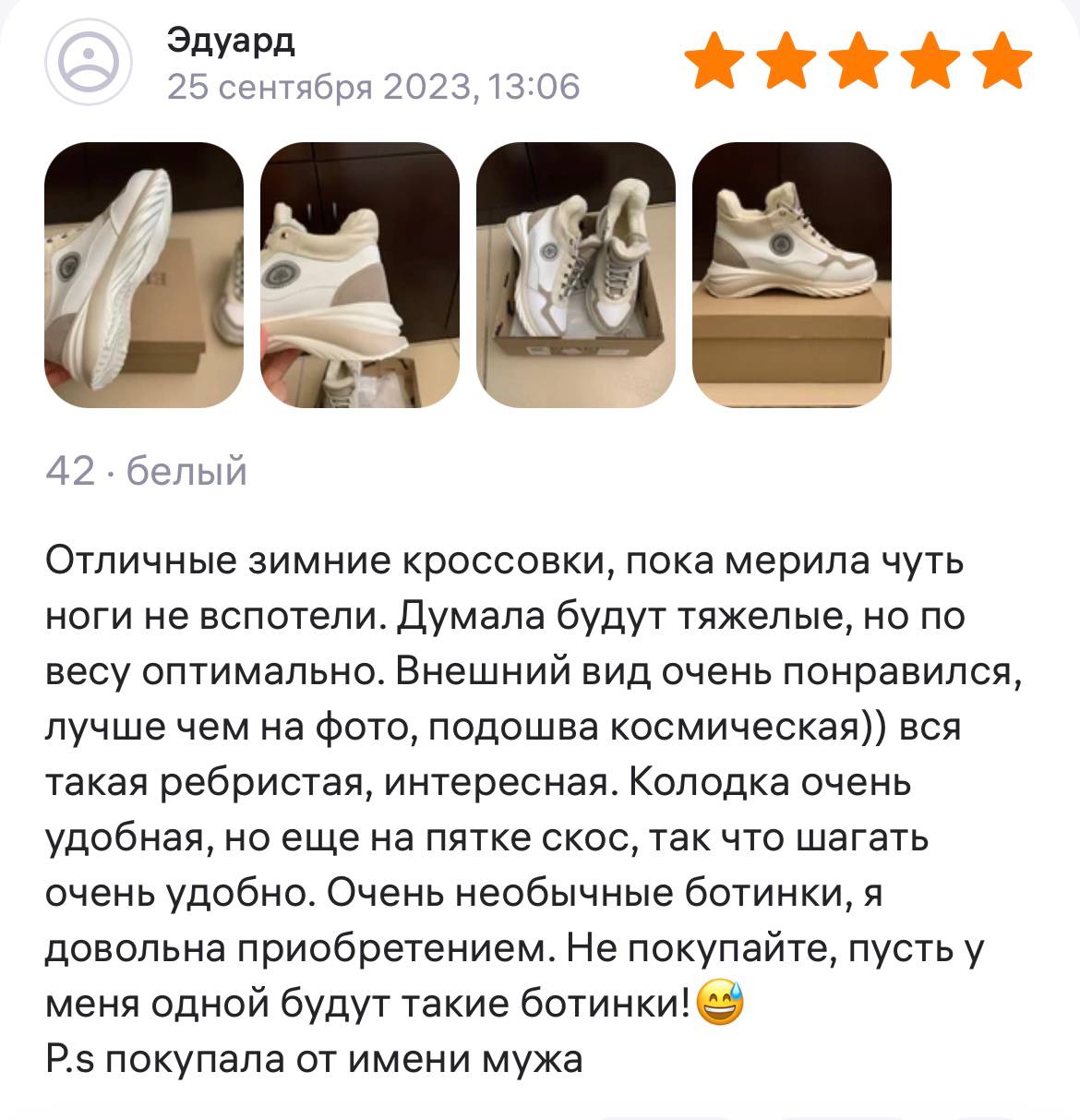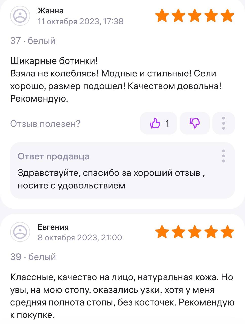 Ботинки хорошие, кажа мягкая, размеру соответствуют, но на пятке пришита заплатка из какой то пленки блесящей и когда первый раз померла она вся сморщилась и такое впечатление что сейчас лопнет. И я думаю со временем так и будет. Если бы не эта заплатка взяла бы удобные и мягкие