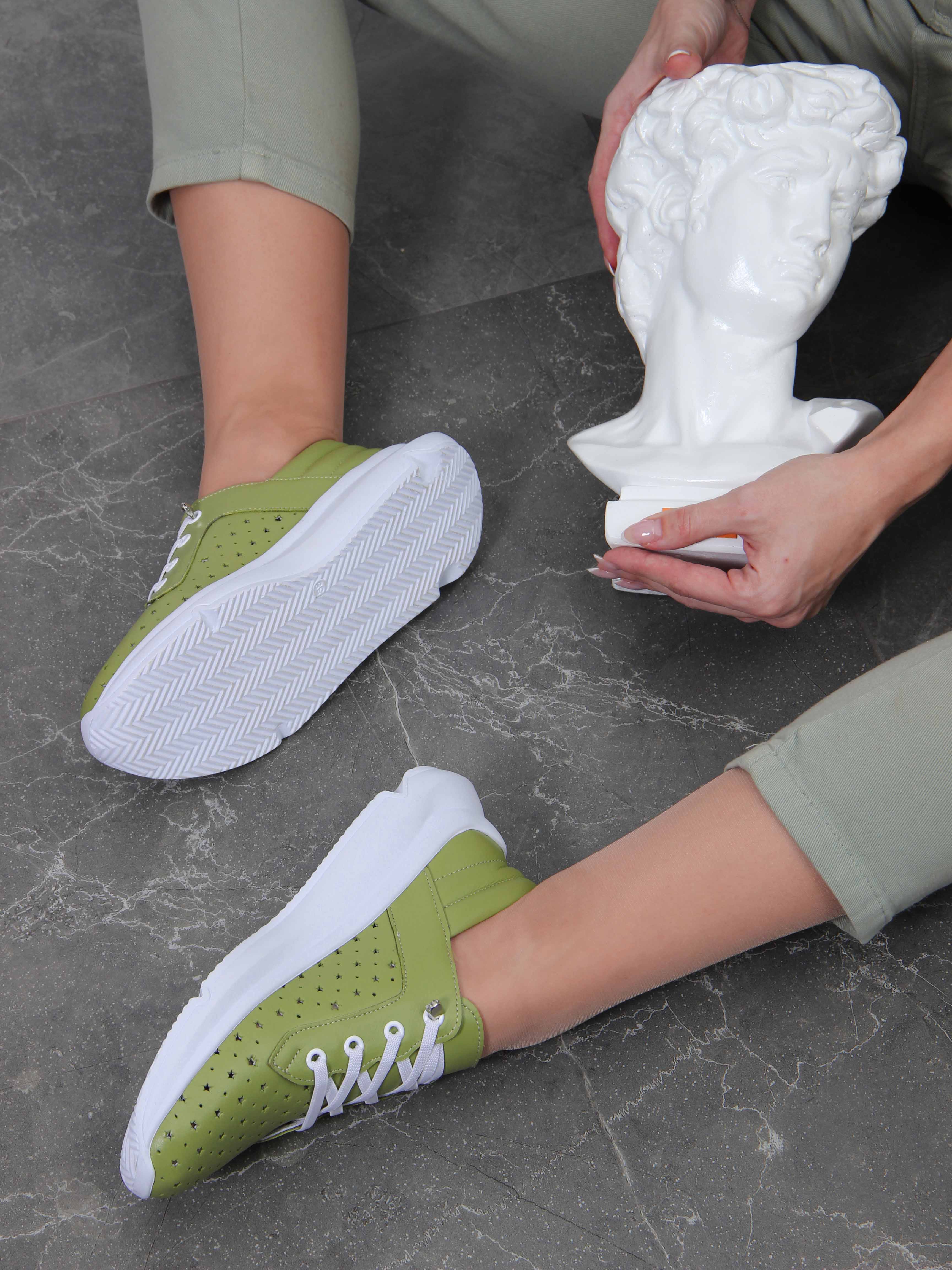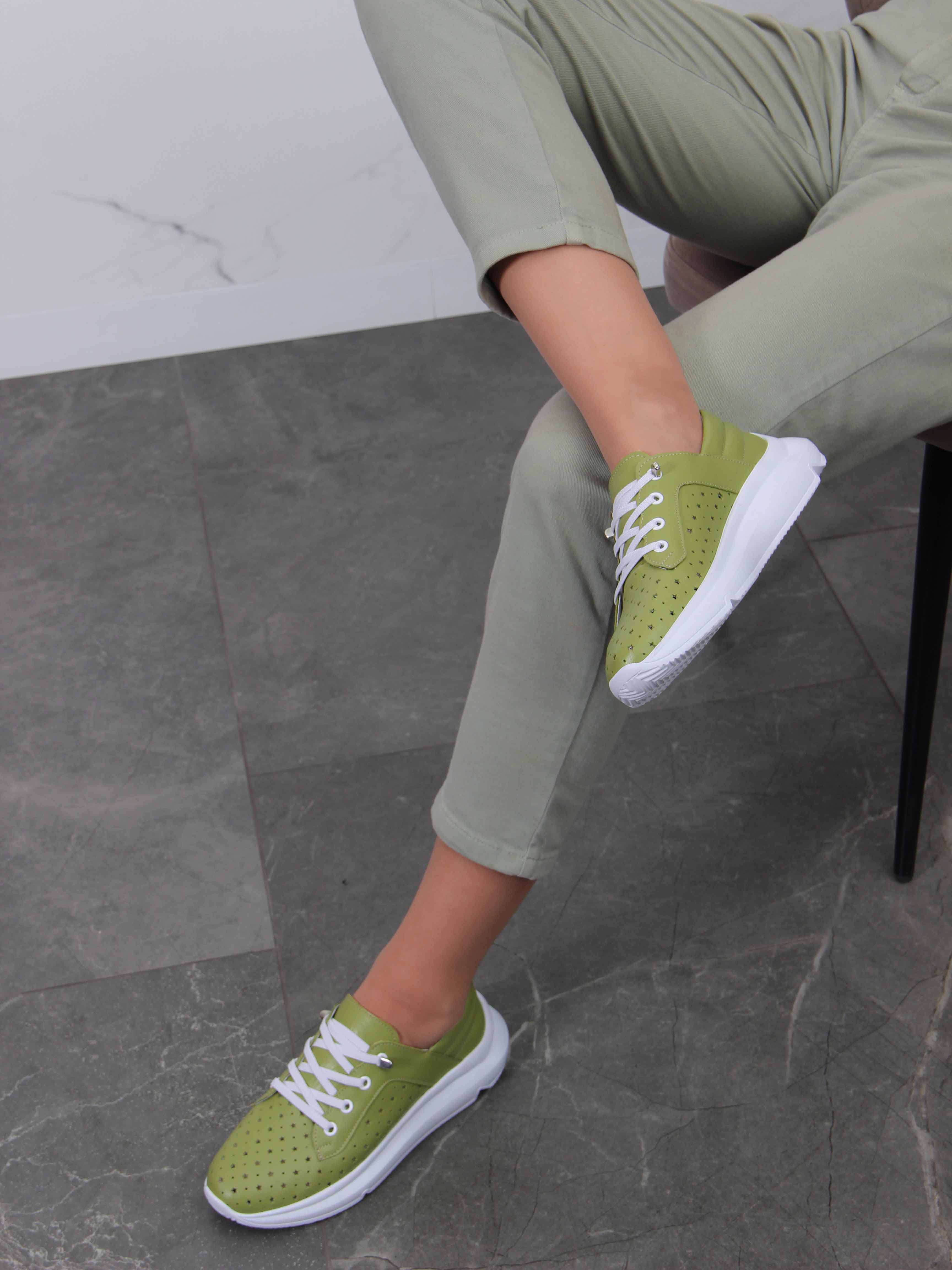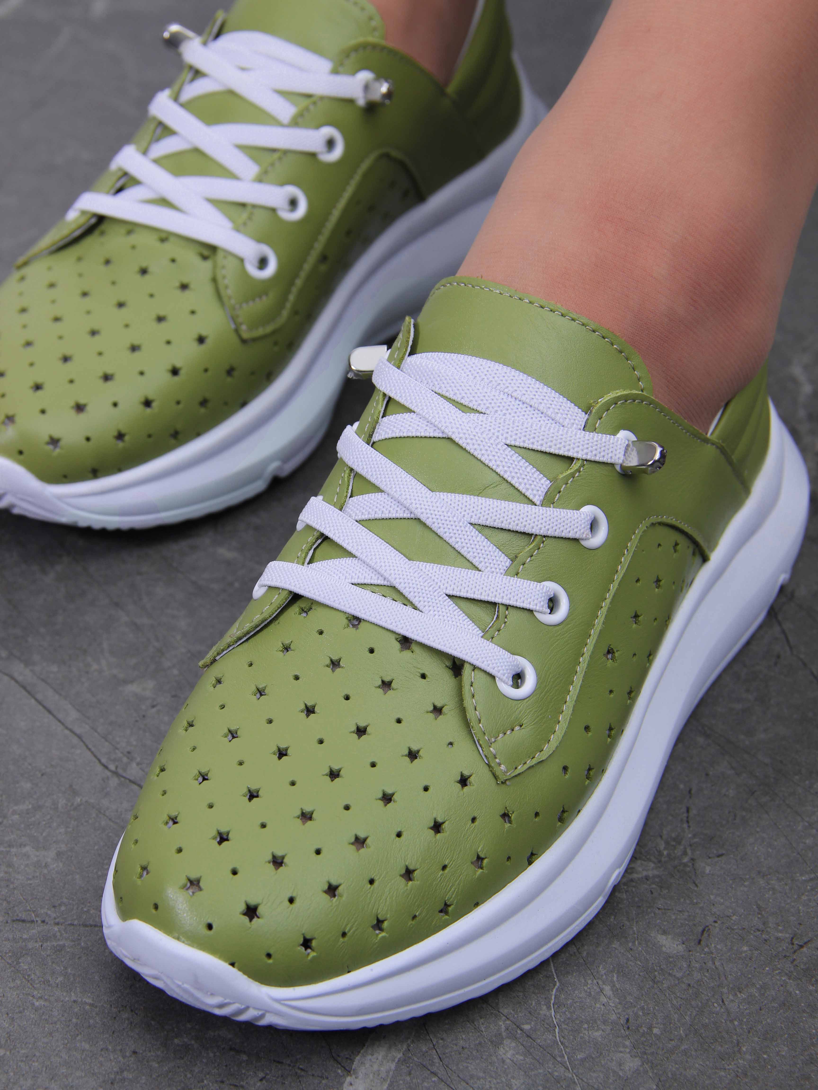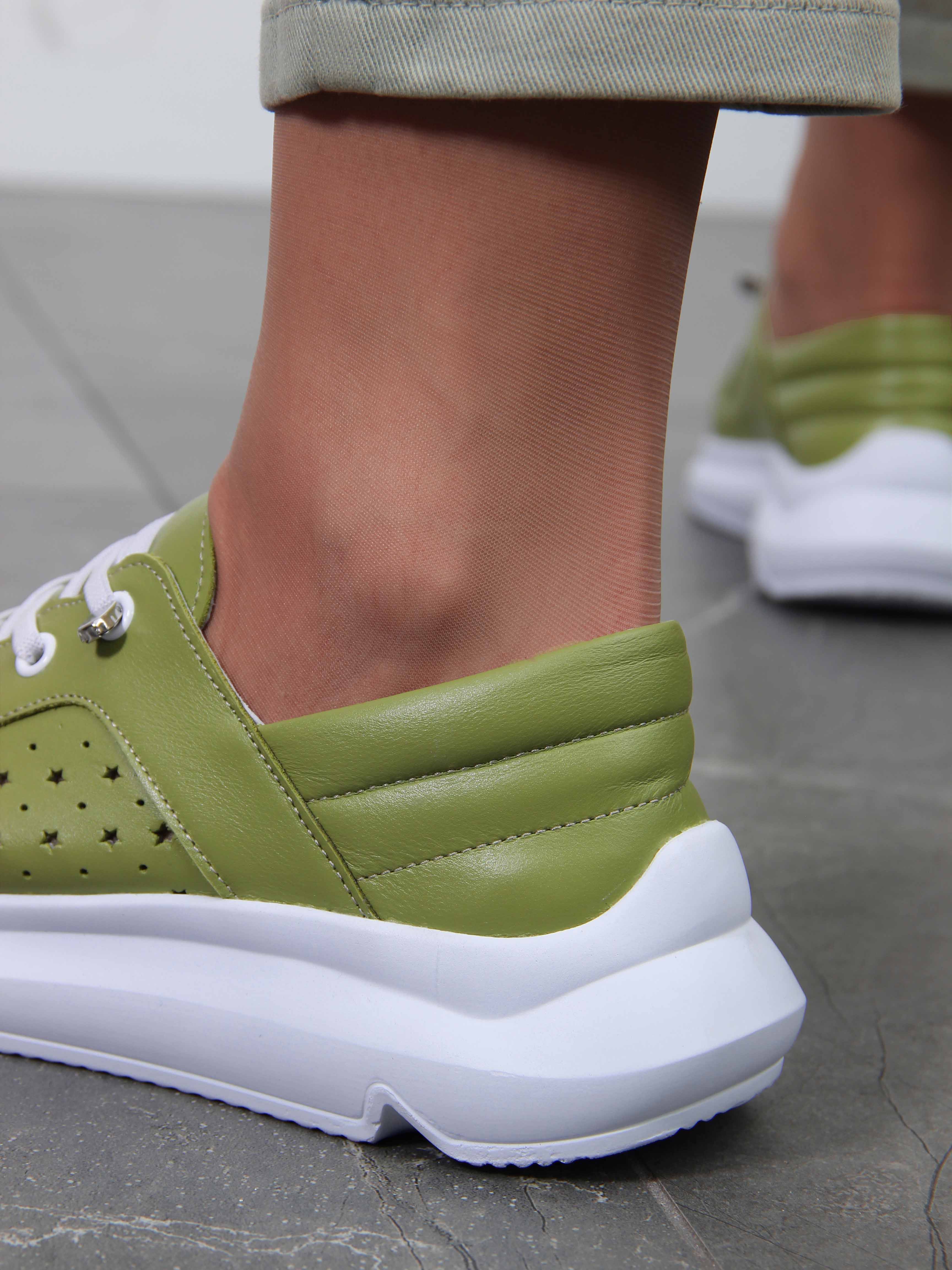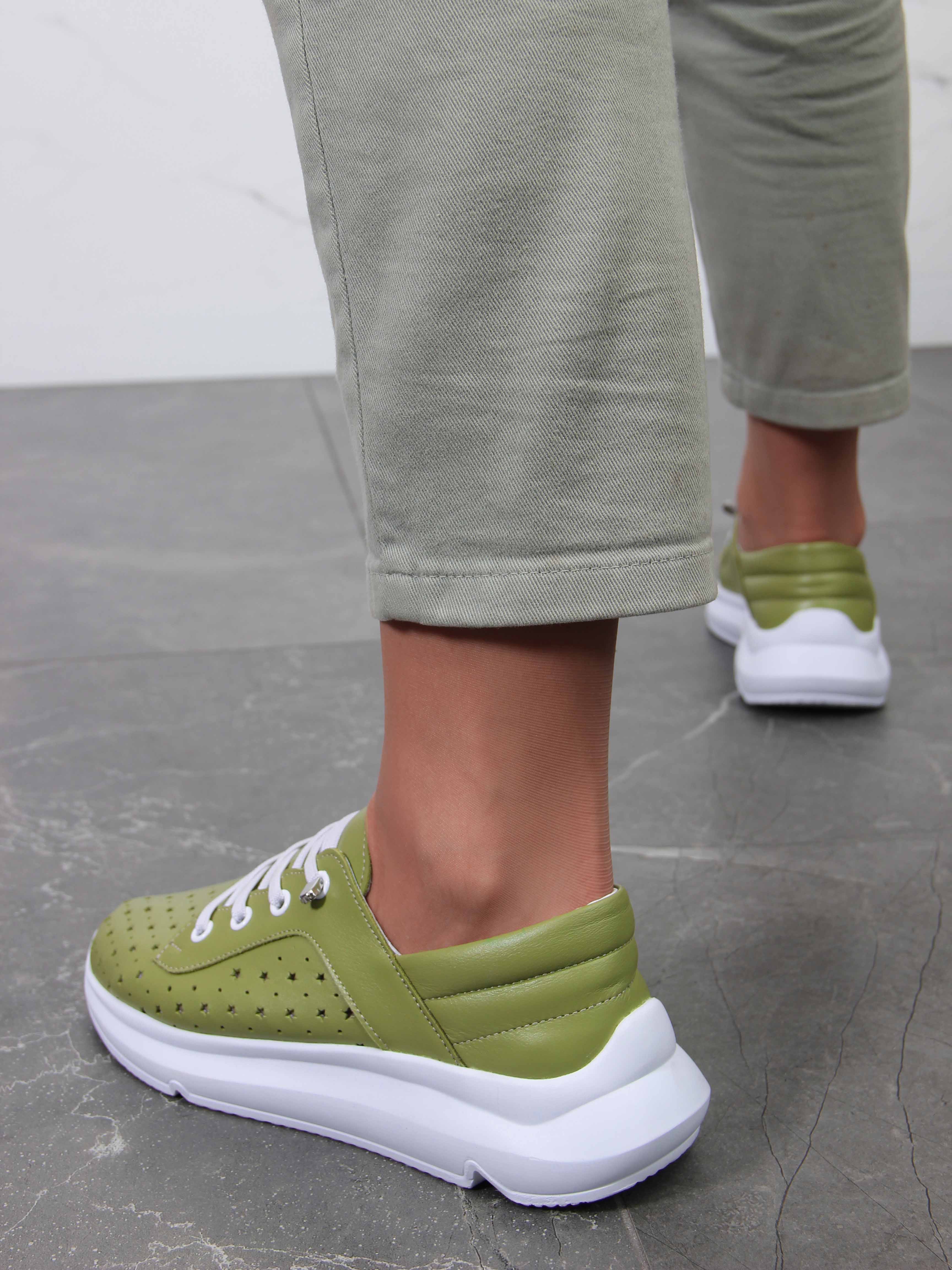Кроссовки кожаные зеленые с перфорацией