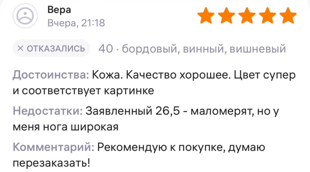 Ботинки хорошие, кажа мягкая, размеру соответствуют, но на пятке пришита заплатка из какой то пленки блесящей и когда первый раз померла она вся сморщилась и такое впечатление что сейчас лопнет. И я думаю со временем так и будет. Если бы не эта заплатка взяла бы удобные и мягкие