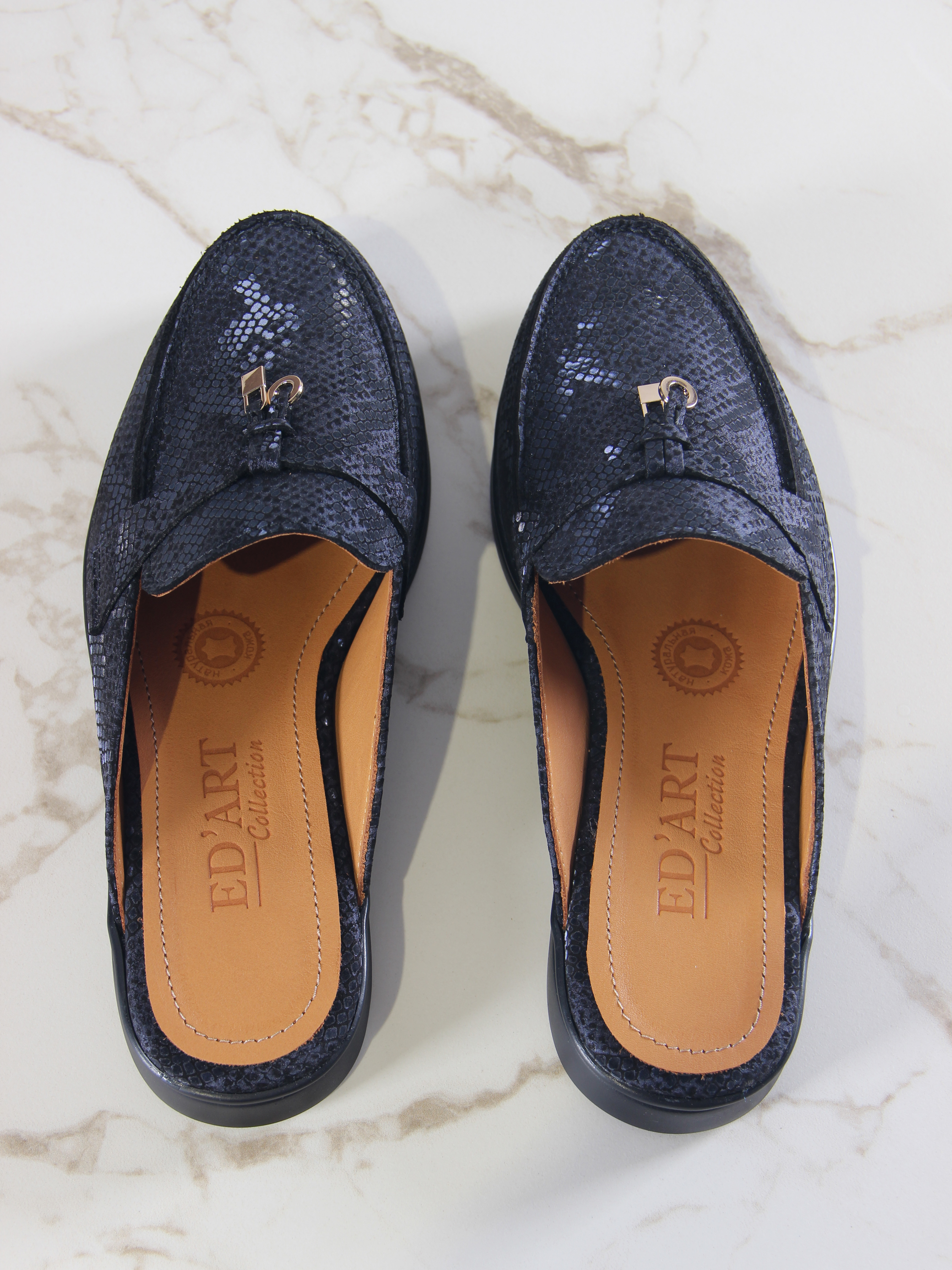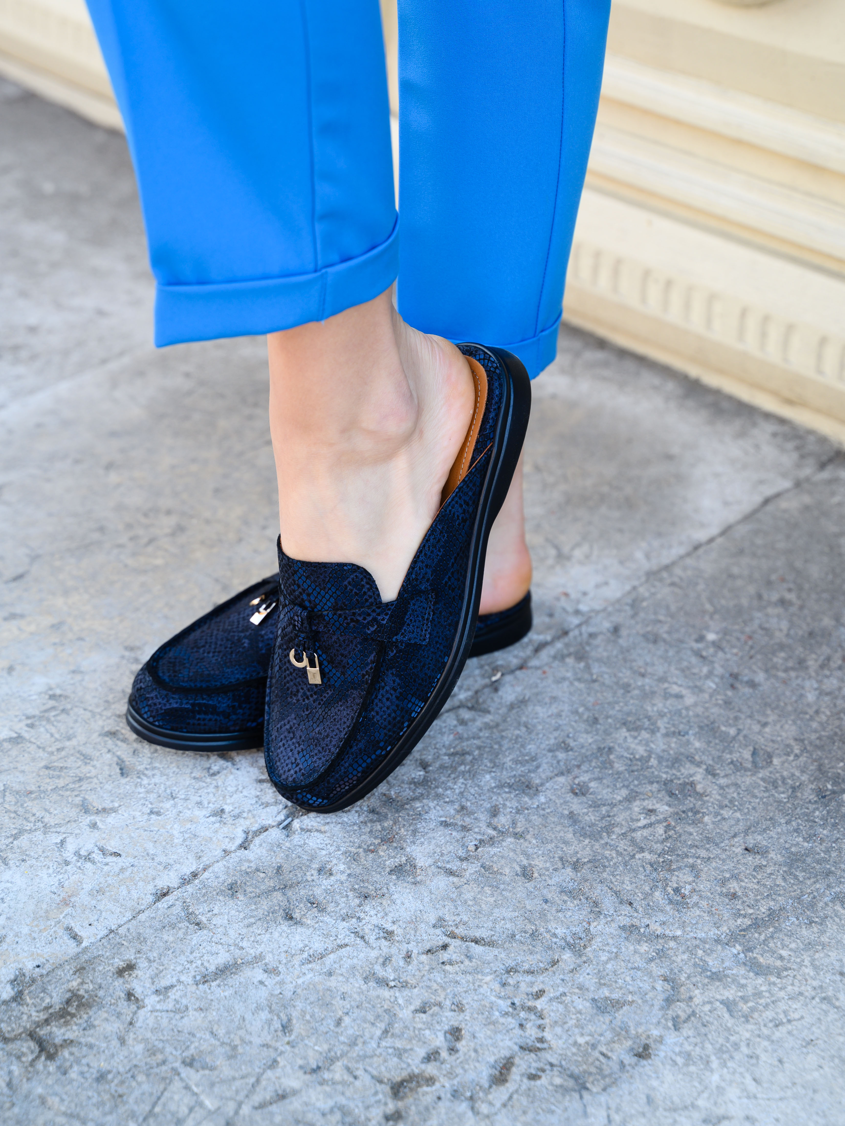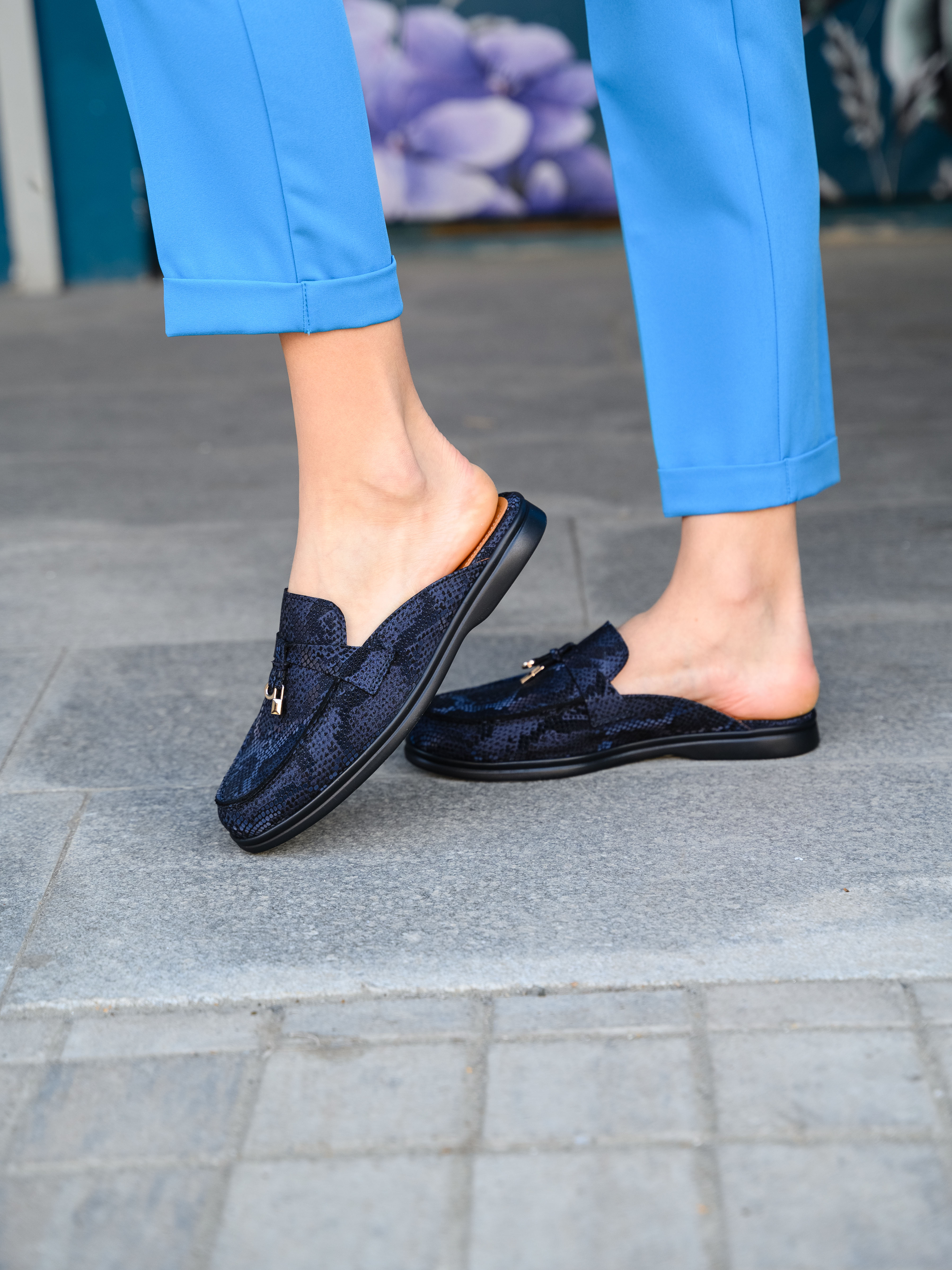 Мюли кожаные синие с принтом змеи