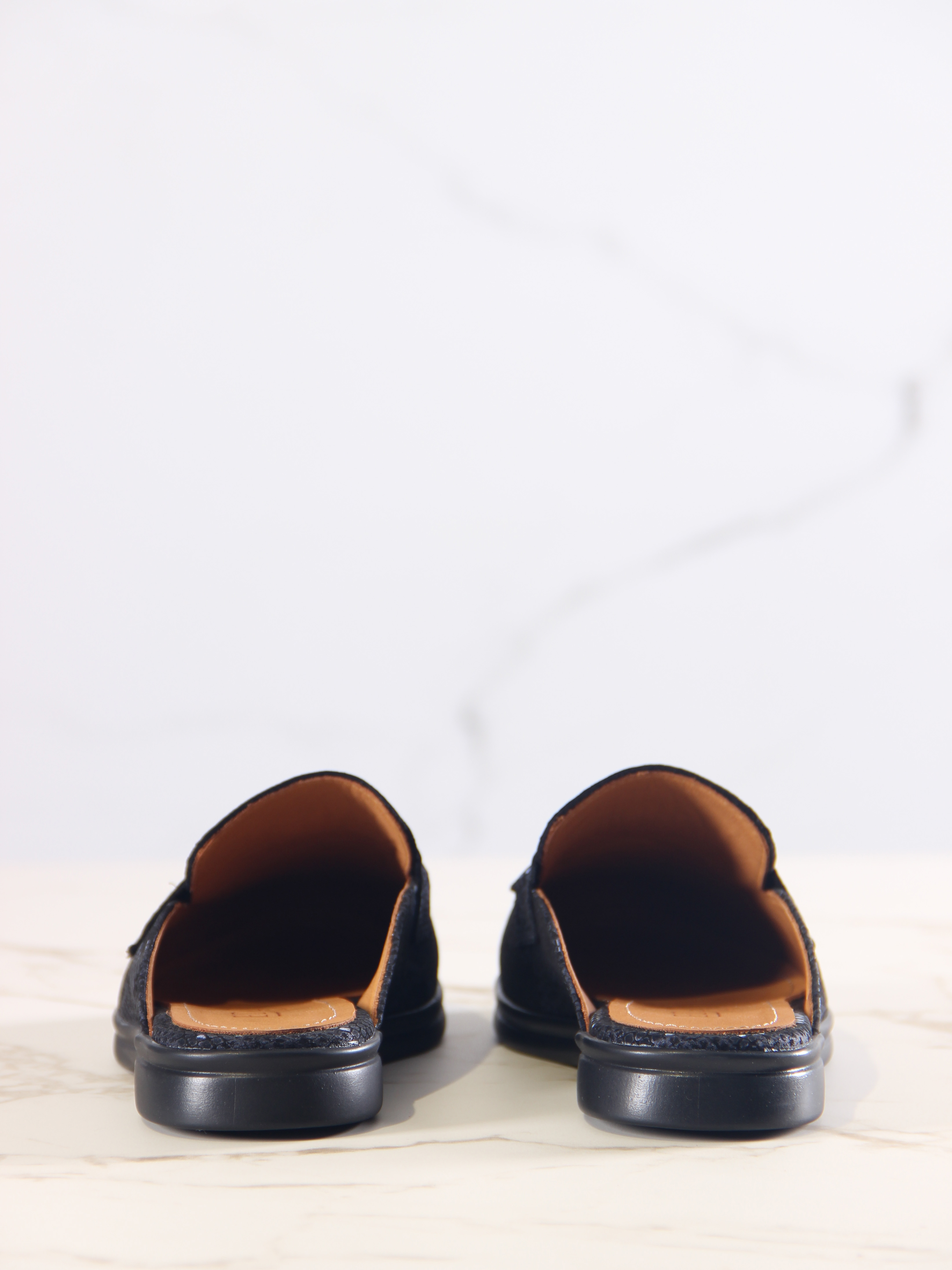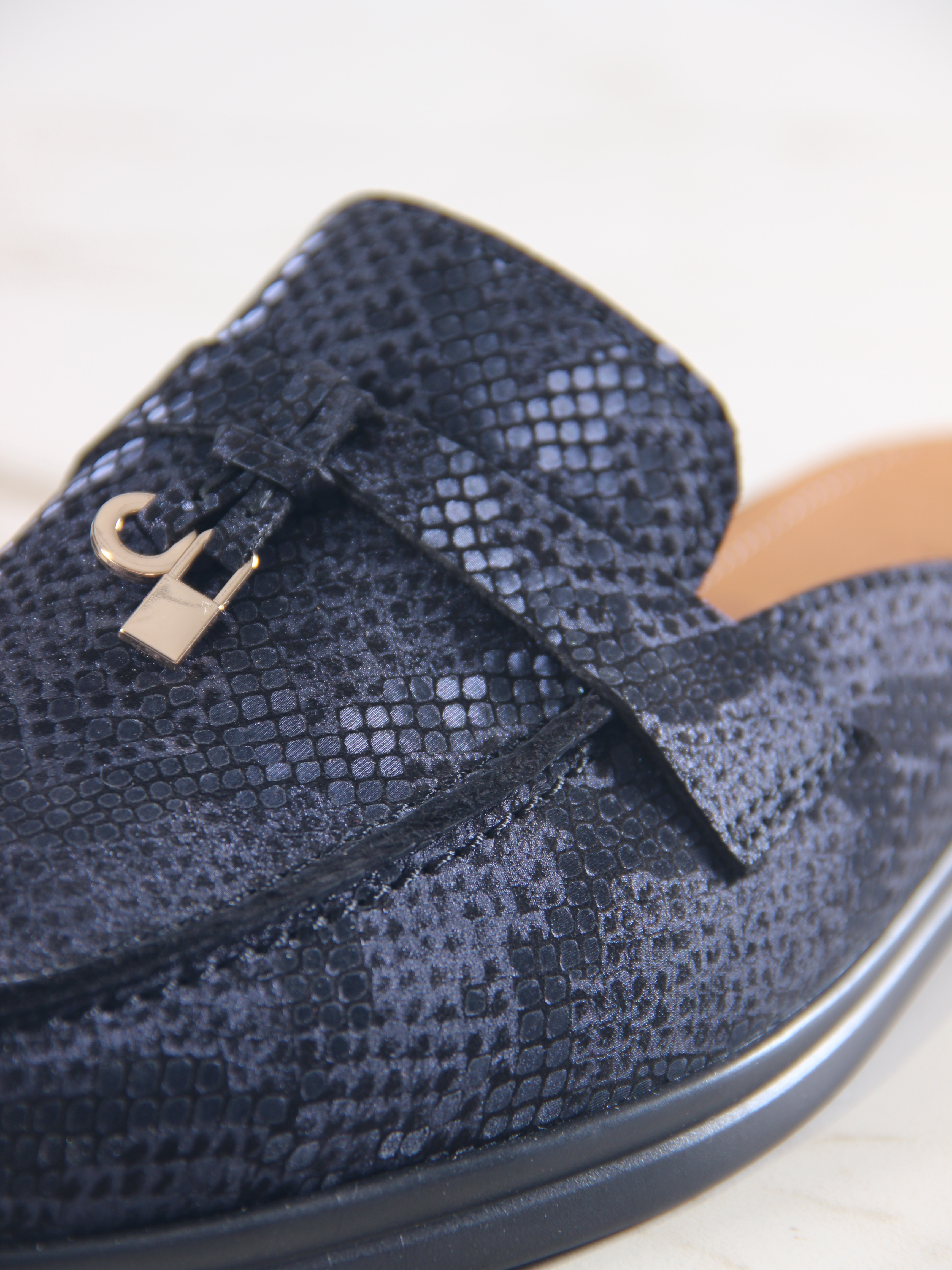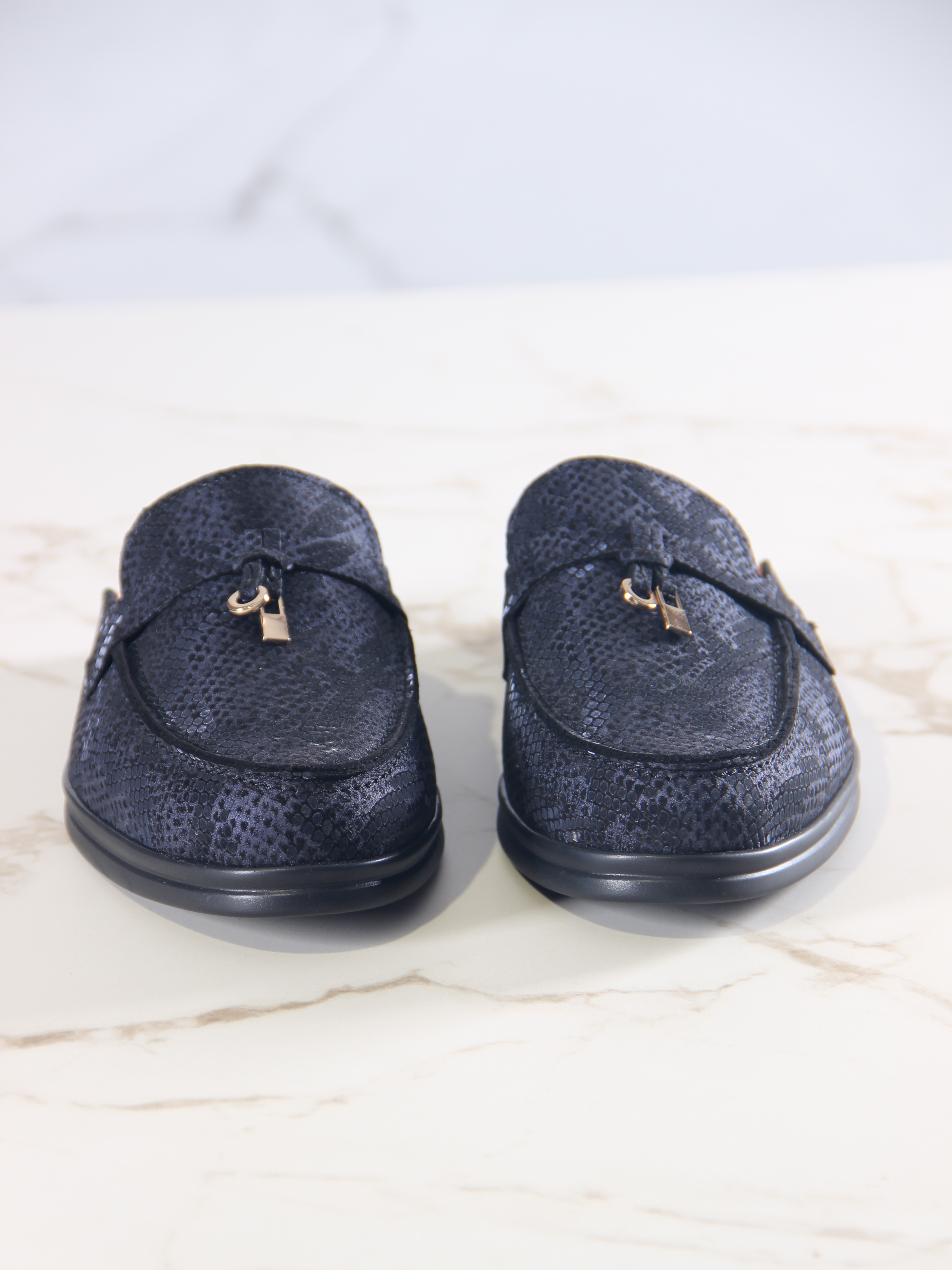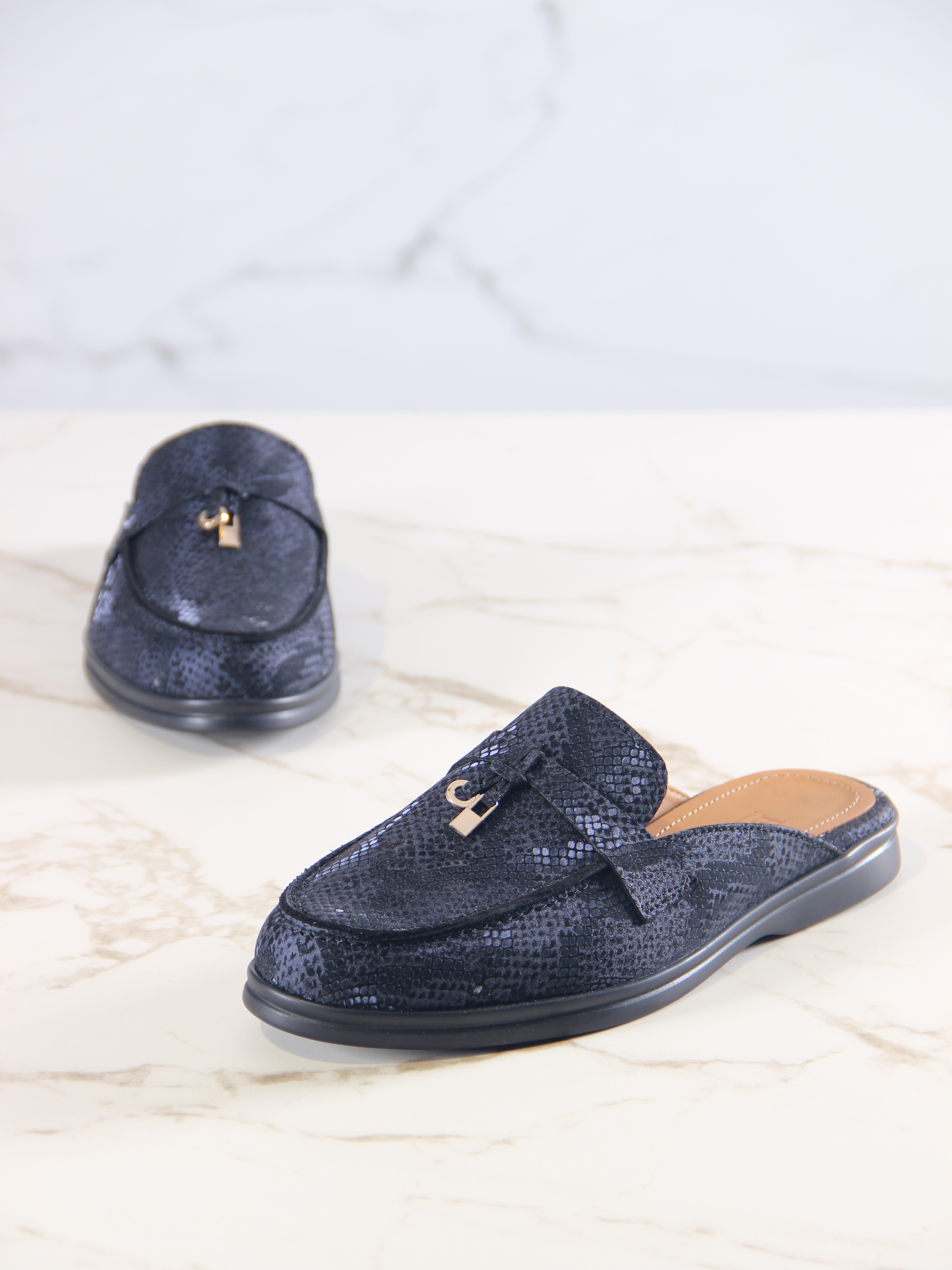 Мюли кожаные синие с принтом змеи